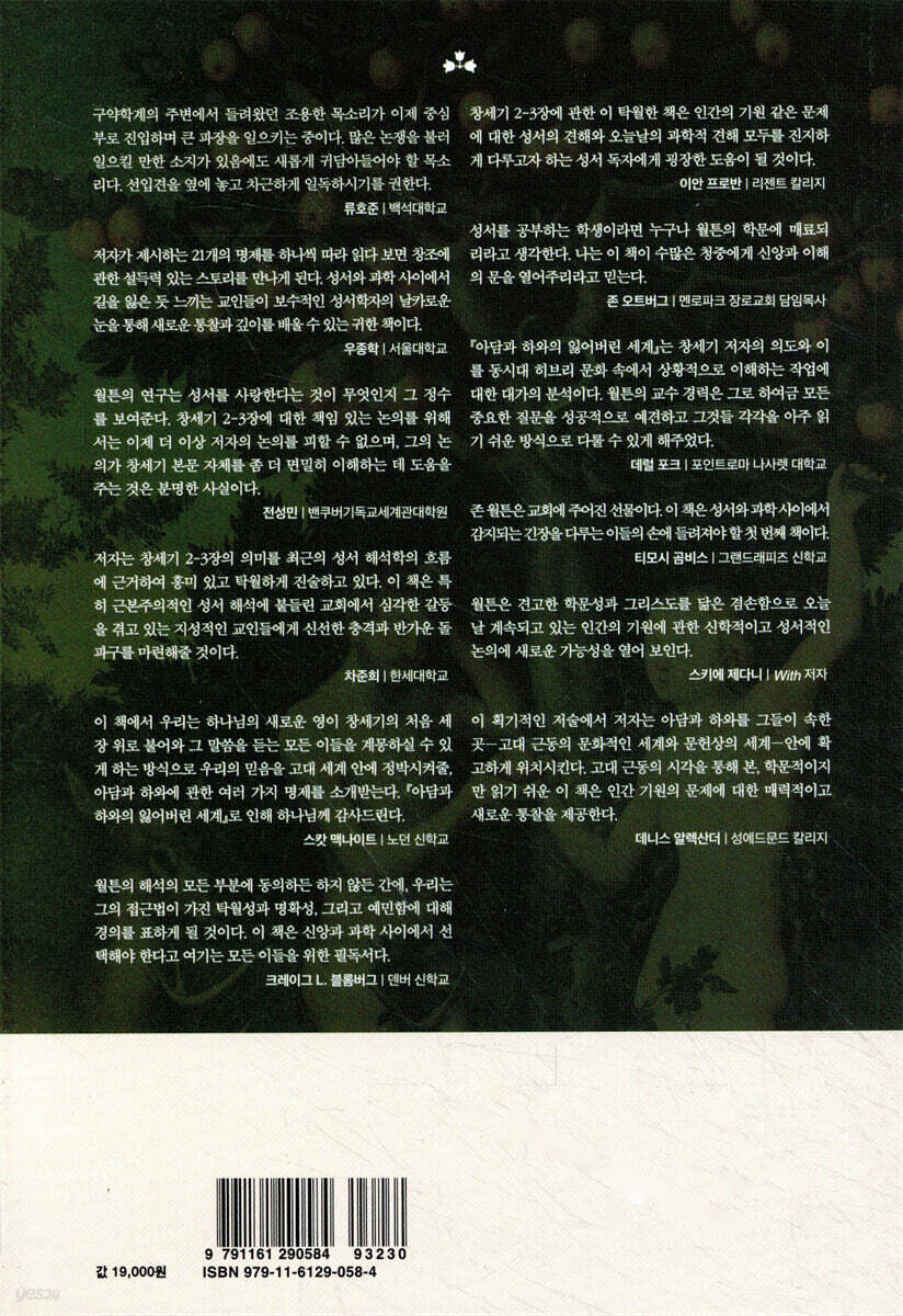 창세기 2-3장에 관한 이 탁월한 책은 인간의 기원 같은 문제에 대한 성서의 견해와 오늘날의 과학적 견해 모두를 진지하게 다루고자 하는 성서 독자에게 굉장한 도움이 될 것이다. - 이안 프로반 (리젠트 칼리지)