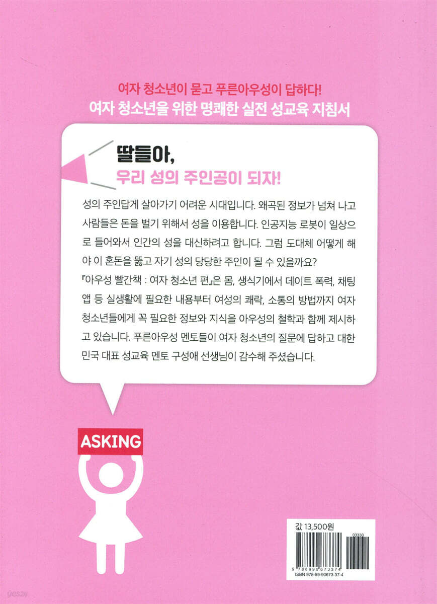 KEYWORD 1 가슴 / 생리 세상에, 내가 왜 이러지? 013 왼쪽 오른쪽 가슴 크기가 달라요.|015 가슴이 커지는 방법을 알려 주세요.|017 유두에서 액체가 나와요.|018 ‘냉’이 뭐예요?|020 냉에서 이상한 냄새가 나요.|022 딸이 초경을 했어요.|024 생리혈이 갈색이에요.|026 탐폰을 사용해도 괜찮을까요?|029 생리통이 너무 심해요.|함께 읽는 성 이야기 - 사춘기 발달 5단계 KEYWORD 2 생식기 / 소음순 오, 나의 보배로운 연못 039 생식기에서 냄새가 나요.|041 처녀막이 막혀 있으면 어떡해요?|043 소음순 수술을 하고 싶어요.|047 자위를 해서 소음순이 커졌어요.|050 소음순 수술은 언제 해 주면 좋을까요?|함께 읽는 성 이야기 - 소녀들과 함께 보고 싶은 책과 영화 KEYWORD 3 자위 / 성관계 / 피임 성의 주인답게 059 여자가 자위를 하면 안 되나요?|061 중학교 1학년 딸이 자위를 합니다.|063 이게 압박 자위가 맞나요?|065 삽입 자위를 하고 싶어요.|067 생리를 안 해요. 자위 때문일까요?|069 자위 중독인 것 같아요.|071 자위하는 제가 싫어요.|074 여동생이 자위하는 걸 봤어요.|077 14세 소녀입니다. 이성 친구를 사귀어도 될까요?|079 더치페이 하고 싶어요.|081 중학생 딸의 남자 친구가 키스하자고 한답니다.|083 남자 친구가 자꾸 가슴을 쳐다봐요.|085 남자 친구가 제 가슴을 만져요.|088 남자 친구가 몸 사진을 보내 달래요.|091 성관계를 정말 해 보고 싶어요.|094 피임만 잘 하면 청소년도 성관계를 해도 되지 않을까요?|097 첫 경험 할 때 아프다는데 진짜예요?|100 남자는 성관계로 사랑을 확인하나요?|103 콘돔을 처음 봤어요.|106 남친이 콘돔을 안 쓰려고 해요.|109 가임기 계산은 어떻게 하는 건가요? 112 섹스 하자는 남친 어떻게 해야 할까요?|114 생리 기간에 성관계를 했습니다.|116 질염인데요. 산부인과에 꼭 가야 하나요?|118 새 남자 친구에게 성 경험이 있다고 말해야 할까요?|121 중3인데요, 성관계를 했어요.|124 순결을 잃었다는 생각에 마음이 너무 힘들어요.|127 낙태했어요.|131 부모님께 성관계를 들켰습니다.|134 딸이 성관계했다는 사실을 알게 됐어요.|137 부모님이 성관계하는 것을 봤어요.|139 엄마와 아빠의 그 장면을 보고 말았습니다.|141 중학생 딸이 부부 관계를 보고 화가 났어요.|함께 읽는 성 이야기 - 144 새 시대의 성 - 여성의 리더십|146 여성 자위, 어떻게 할까?|149 연애를 시작할 때|152 What is sex?|155 피임도 철학이 필요해|158 3분 만에 보는 피임법 KEYWORD 4 음란물 / 채팅 / 성폭력 왜곡된 성을 넘어 사랑의 성으로 167 16세 딸이 핸드폰으로 음란물을 봐요.|169 실수로 음란물을 보게 되었습니다.|172 음란물이 왜 나쁜가요?|175 음란물을 끊고 싶어요.|178 아빠가 음란물을 봐요.|181 엄마 아빠 성관계가 더럽게 느껴져요.|185 딸이 변태스러운 소설을 읽어요.|187 중학교 1학년 딸이 낯선 남자에게 알몸 사진을 보냈습니다.|190 14세 딸이 성인 남자와 채팅을 해요.|195 중3 딸이 채팅 남과 성관계를 했어요.|198 성매매가 왜 나쁜가요?|201 8년 전 딸이 성추행 당했다는 사실을 알게 됐어요.|204 짧은 바지를 입으면 성범죄를 당한다?|207 이것도 성폭력이에요?|210 성폭행을 당했습니다.|함께 읽는 성 이야기 - 외로운 청소년들의 슬픈 놀이터, 채팅앱|217 성폭력 통념 뛰어넘기|220 데이트 폭력이란?|222 데이트 폭력 예방법|223 같이 보기 EPILOGUE 이 책을 읽는 여자 청소년들에게 아우성 선생님들이 보내는 편지 |