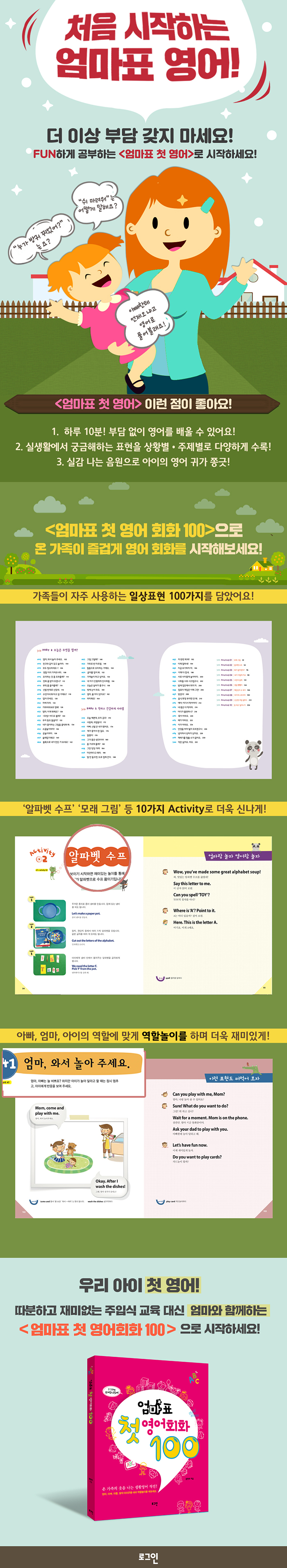 - 활용법 PART 1 우리 식구의 하루는? 001 일어나세요, 잠꾸러기! 002 가서 세수하렴. 003 와서 아침 먹어라. 004 이를 깨끗이 닦아요. 005 아빠 회사 갔다 올게. 006 저 혼자 할 수 있어요. 007 엄마가 머리 묶어 줄게. 008 서둘러! 유치원에 늦겠다. 009 엘리베이터 올라와요. 010 즐거운 하루 보내렴! 011 엄마, 다녀왔어요! 012 유치원에서 재미있었니? 013 유니와 싸웠어요. 014 과자 먹을래요. 015 스파게티를 먹었어요. 016 재민이가 제일 친한 친구예요. 017 엄마, 쉬 마려워요. 018 물 내렸니? 019 민지야, 왕 코딱지! 020 놀이터 가자. 021 엄마, 그네 타도 돼요? 022 놀고 나면 가서 손 씻으렴. 023 엄마, 우유 한잔 주세요. 024 피아노 수업 싫어요. 025 아빠, 언제 와? 026 아빠 왔다! 027 밥상 차리는 걸 도와줄래? 028 10분 있다 저녁 된다! 029 소금 좀 주실래요? 030 TV에서 떨어져 앉아. 031 윽, 누가 방귀 뀌었어? 032 목욕하자. 033 자, 물 튼다. 034 머리 감기 싫어요. 035 수건으로 몸을 닦으렴. 036 나 로션 발라요. 037 키가 얼마나 되는지 보자. 038 잠옷으로 갈아입으렴. 039 아빠가 책 읽어 줄게. 040 좋은 꿈 꿔! PART 2 오늘은 무엇을 할까? 041 엄마, 와서 놀아 주세요. 042 친구와 같이 갖고 놀아라. 043 모두 청소하세요~! 044 양말 이리 가져오너라. 045 요리하는 것 좀 도와줄래? 046 전화 좀 받아 주겠니? 047 부탁 좀 들어줄래? 048 신발 반대로 신었네. 049 수민이네 뭐 타고 갈 거예요? 050 업어 주세요. 051 차에 타라. 052 가위바위보로 정해! 053 엄마, 이게 뭐예요? 054 [위씽] 비디오 볼래? 055 우리 동요 들을까? 056 네가 좋아하는 그림을 클릭해 봐. 057 소꿉놀이하자! 058 공놀이하자. 059 술래잡기해요! 060 블록으로 내가 만든 거 보세요! 061 그림 그릴래? 062 가위로 반 자르렴. 063 찰흙으로 요리하는 거예요. 064 글자를 짚어 봐. 065 가게놀이 하고 싶어요. 066 네 아기 인형에게 인사하렴. 067 오늘은 날씨가 좋구나. 068 밖에 눈이 와요. 069 엄마, 풀 어디 있어요? 070 파티해요! PART 3 착하고 건강하게 자라렴 071 오늘 예쁜데, 우리 공주! 072 사랑해, 귀염둥이! 073 아빠, 신발 끈 내가 맸어요. 074 제가 좋아서 한 걸요. 075 잘했어! 076 그거 좋은 생각이야! 077 좀 가르쳐 줄래? 078 그만 징징 거려! 079 미안하다고 해라. 080 말 안 들으면, 도로 집에 간다. 081 자 한번 해 봐! 082 이제 잘하네! 083 지금 포기하지 마. 084 이제 다 컸네. 085 서로 사이좋게 놀아야지. 086 너희들 너무 시끄럽구나. 087 밤에 집안에서 뛰지 마. 088 컴퓨터 게임은 이제 그만! 089 맞았다! 090 음식 투정 부리면 안 돼. 091 얘야, 여기서 먹어야지! 092 네 몫은 다 먹어라. 093 어디가 불편하니? 094 목이 아파요. 095 배가 아파요. 096 이가 아파요. 097 안경을 써야 될지 모르겠구나. 098 넘어져서 상처가 났어요. 099 재채기를 멈출 수가 없어요. 100 약은 싫어요. 써요. Activity 01│모래 그림 Activity 02│알파벳 수프 Activity 03│뭐가 없어졌지? Activity 04│내가 이렇게 커요 Activity 05│나만의 달력 Activity 06│생일 뺑뺑이 Activity 07│계란상자 수 세기 Activity 08│무지개 스트리머 Activity 09│신선한 과일 샐러드 Activity 10│등 대고 일어나기 |