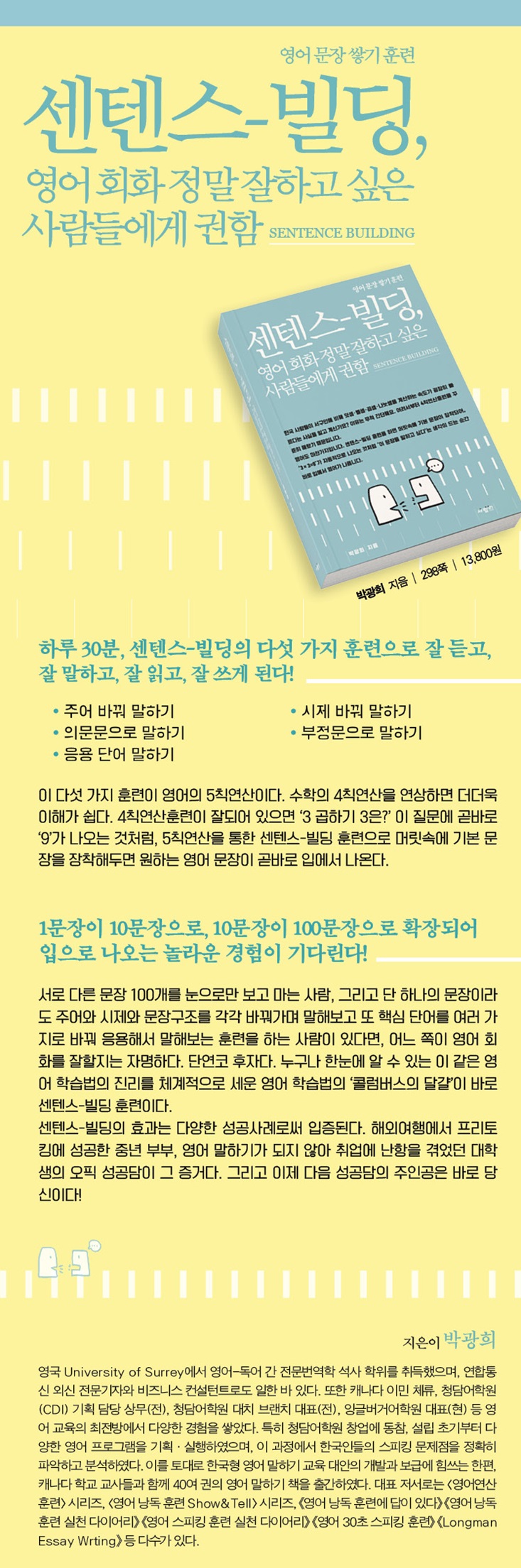 1문장이 10문장으로, 10문장이 100문장으로 확장되어 입으로 나오는 놀라운 경험 서로 다른 문장 100개를 눈으로만 보고 마는 사람, 그리고 단 하나의 문장이라도 주어와 시제와 문장구조를 각각 바꿔가며 말해보고 또 핵심 단어를 여러 가지로 바꿔 응용해서 말해보는 훈련을 하는 사람이 있다면, 어느 쪽이 영어 회화를 잘할지는 자명하다. 단연코 후자이다. 누구나 한눈에 알 수 있는 이 같은 영어 학습법의 진리를 체계적으로 세운 영어 학습법의 ‘콜럼버스의 달걀’이 바로 센텐스-빌딩 훈련이다. 저자가 지난 수년간 수많은 사람들에게 실제로 가르쳐온 센텐스-빌딩의 효과는 다양한 성공사례로써 입증된다. 해외여행에서 프리토킹에 성공한 중년 부부, 영어 말하기가 되지 않아 취업에 난항을 겪었던 대학생의 오픽 성공담이 그 증거다. 그뿐 아니라 다독 훈련의 효용, 독일을 비롯한 유럽식 영어 공부의 장점까지 두루 소개하여, 정말로 영어 회화를 잘하고 싶어 했던 사람들의 갈증을 풀어준다. 하루 30분, 센텐스-빌딩의 다섯 가지 훈련으로 잘 듣고, 잘 말하고, 잘 읽고, 잘 쓰게 된다 - 주어 바꿔 말하기 - 시제 바꿔 말하기 - 의문문으로 말하기 - 부정문으로 말하기 - 응용 단어 말하기 이 다섯 가지 방법이 센텐스-빌딩 훈련의 핵심이다. 수학의 4칙연산을 연상하면 더더욱 이해가 쉽다. 이 센텐스-빌딩 훈련으로 머릿속에 기본 문장을 장착해두면 ‘3 곱하기 3은?’이라는 질문에 곧바로 ‘9’라는 대답이 나오는 것처럼 원하는 영어 문장이 곧바로 입에서 나오게 된다. 뼈대 문장 하나를 가지고 주어를 바꾸고, 시제를 바꾸고, 의문문과 부정문으로 만들어 보고, 응용 단어를 바꿔 말하다 보면, 어느새 우리가 입 밖으로 직접 소리 내어 말하는 문장은 셀 수 없이 많아진다. 이러는 동안 우리 머릿속에 이 문장들이 입력되어, 우리 입이 자연스레 그 문장들을 기억하게 되기 때문이다. 『센텐스-빌딩, 영어 회화 정말 잘하고 싶은 사람들에게 권함』은 이런 훈련의 이론적 근거와 영어 학습 전반에 대한 전문가의 노하우를 아낌없이 전수한다. 서로 다른 학습자들에게 걸맞은 영어 텍스트는 어떤 것인지, 영어 문법이 필요한 순간은 언제이며 왜 그 순간에 필요한 것인지, 영어 그림책 학습법과 영어 교과서를 추천하는 이유는 무엇인지 등 맞춤형 가이드를 제시한다. |