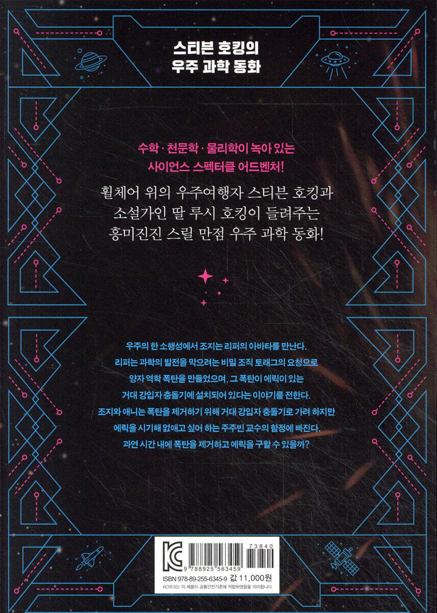 _본문 36쪽 빈센트는 스크린을 통해 문으로 사라지는 친구들의 뒷모습을 마지막으로 보았다. 빈센트는 코스모스를 제대로 작동시켰을까? 조지와 애니는 거대 강입자 충돌기에 무사히 도착할까? 폭탄이 터지려고 하는 거대 강입자 충돌기에 무사히 도착할까? 폭탄이 터지려고 하는 거대 강입자 충돌기로 친구들을 보내는 게 옳았을까? 두 사람을 다시 폭스브리지로 돌아오게 해야 하지 않았을까? 그리고 만약 잘못된 버튼을 눌러서 두 사람이 웜홀 같은 기이한 곳을 통과하게 했다면 어떻게 될까? 우연히 두 사람을 과거로 보냈다면 어떻게 하지? 그러면 무슨 일이 벌어질까? 빈센트는 조용히 바닥에 주저앉아 머리를 두 손으로 감쌌고, 그러는 동안 이 모든 사악한 짓을 저지른 주주빈은 바닥에서 코를 골고 있었다. _본문 125쪽 “폭탄이 이 음료 자동판매기 안에 있구나, 그렇지? 폭탄의 뇌관을 제거하려면, 올바른 음료를 선택해야만 해.” 조지는 주머니에서 푸키가 친절하게 출력해 준, 긴 숫자 암호가 적힌 종잇조각을 꺼냈다. “바로 이거야! 이게 바로 스위치들을 작동시켜서 폭탄을 터지게도 하고 멈추게도 할 수 있는 암호야. 양자 중첩이란 폭발에 사용된 스위치는 여덟 개여도 중요한 스위치는 오직 하나뿐이라는 것을 의미해. 문제는 어느 게 중요한 건지 모른다는 거지.” _본문 142쪽 --- 본문 중에서 |