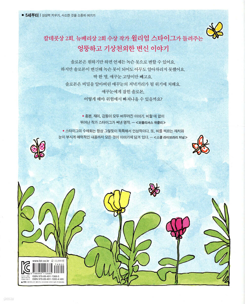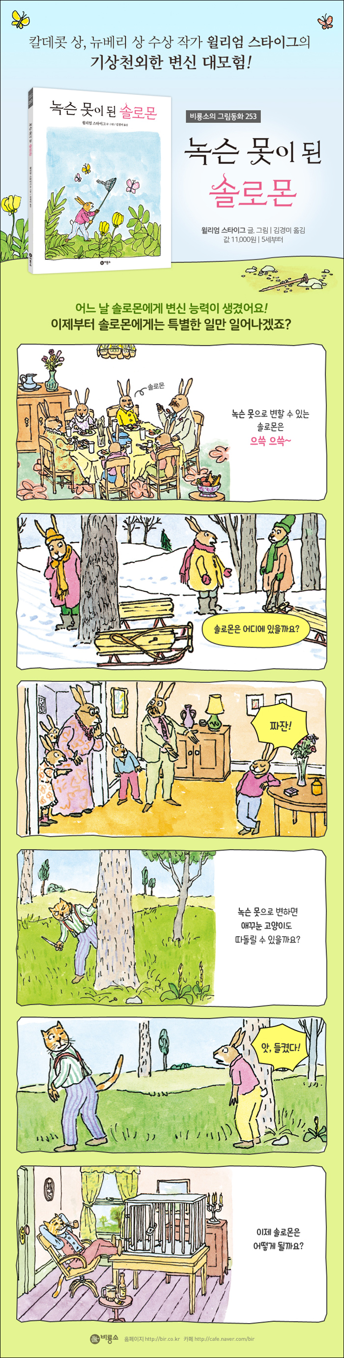 아이들의 상상 속 세계에서 ‘변신’은 숨 쉬는 것만큼 자연스러운 것이다. 아이들은 어른들보다 더 자유롭게 상상한다. 지구를 구하는 슈퍼맨이나 원하는 걸 뚝딱 만들어 내는 도깨비처럼 제한 없이 자유자재로 상상이 펼쳐진다. 그런데 꼬마 토끼 솔로몬이 변신한 것은 하고많은 것 중에서도 하필 ‘녹슨 못’이다. 어른들의 눈에는 별 볼 일 없는 물건이지만 솔로몬은 이 놀라운 능력을 아주 재미있게 받아들인다. 식사를 하고 잠을 자러 가는 평범한 일상 속에서 식구들 몰래 녹슨 못으로 변신했다가 다시 토끼로 휘리릭 변신하고는 혼자 키득거린다. 물론 이 변변찮은 변신 능력을 알아채는 식구들은 아무도 없다. 그러던 어느 날, 토끼의 목숨을 노리는 애꾸눈 고양이가 이 변신 능력을 알아채고 만다. 녹슨 못이 된 솔로몬을 우리에 고이 넣어 놓고 토끼로 돌아오기만 하면 잡아먹으려고 우리를 지키는 악당 고양이. 솔로몬에게는 엄청난 위기이다. 토끼로 돌아올 수도 없고, 그렇다고 계속해서 녹슨 못으로 남아 있을 수도 없다. 솔로몬은 대체 어떻게 해야 할까? ‘변신’은 보통 ‘특별함’을 대변한다. 그런데 솔로몬이 유일하게 변신할 수 있는 ‘녹슨 못’은 있어도 그만, 없어도 그만인 ‘하찮음’을 대변하는 것이다. 그래서 변신과 녹슨 못의 조합은 아이러니하다. 기껏 변신 능력을 얻고 나서도 식구들이나 가족들에게 장난치는 걸로 만족하는 솔로몬의 모습은 아이러니한 웃음을 자아낸다. 또, 너무나 가까이 있기에 솔로몬의 달라진 점을 눈치채지 못하는 식구들과, 적이지만 유심히 관찰해 솔로몬의 능력을 알아챈 애꾸눈 고양이의 대비 역시 아이러니하다. ‘변신’을 모티프로 근사한 것, 자랑할 만한 것을 이야기하며 뻔한 이야기로 몰고 가지 않은 스타이그의 독특한 이야기 구성 능력은 단연 압권이라 할 수 있다. ■ 그림을 자세히 뜯어 보면 더욱 풍부한 이야깃감이 숨어 있다! 신문에 카툰을 연재했던 스타이그는 한 컷의 그림에 여러 요소를 압축하는 데 능하다. 사실 이 책을 글로만 읽어서는 시간의 흐름을 가늠하기 힘들다. 스타이그가 섬세한 시간의 흐름을 그림 속에 넣어 두었기 때문이다. 계절을 가장 먼저 느낄 수 있는 장면은 솔로몬이 친구들에게 변신을 자랑할 때다. 새하얀 눈이 쌓인 배경은 물론 친구들의 복장은 겨울을 나타낸다. 솔로몬이 나비 채집에 빠진 때는 여름. 짧아진 옷과 초록색 배경을 보면 겨울과 대비되는 계절의 변화를 느낄 수 있다. 솔로몬은 얼마나 오랫동안 애꾸눈 고양이에게 잡혀 있었을까? 그 답도 그림에서 찾을 수 있다. 초록색 나무는 붉게 물든 나무로 바뀌고, 단풍의 진하기도 점점 달라지는 등 미묘한 시간의 흐름이 그림 속에 녹아있다. 등장인물들의 표정 변화에도 주목해 보자. 솔로몬을 잡고 맛있는 저녁을 생각하며 우쭐한 애꾸눈 고양이와, 녹슨 못으로 추궁당한 애꾸눈 고양이의 표정이 캐릭터를 더욱 실감 나게 한다. 솔로몬이 사라지기 전 심드렁한 식구들과 애타게 기다리던 솔로몬이 돌아온 후 달라진 식구들의 표정을 비교해 보자. 마지막 순간, 솔로몬의 변신 능력을 알게 되었을 때 놀랍기도 하고 웃기기도 하고 어이없기도 한 가족들의 복잡한 표정에 스타이그의 재치가 살아 있다. |