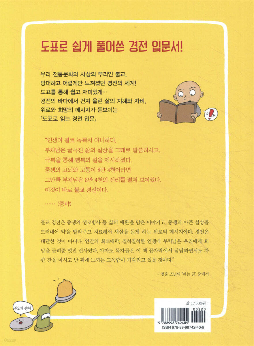 ●경전 입문의 길잡이 01 불교 경전이란 무엇인가? … 010 02 불교 역사를 어떻게 나누는가? … 012 ●불멸 이후~부파불교에 이르기까지 승가의 흐름과 경전 결집[1차~6차] ●대승불교의 발생과 특징 ●대승불교의 경전 결집과 전파 03 대승불교는 어떻게 발전되었고, 전개되었는가? … 019 04 현재 독송하는 경전들은 어떤 경로를 거쳐서 번역되었고, 어떻게 형성되었는가? … 024 ●경전 20 01 『숫따니빠따』 … 028 무소유적 삶, 평온의 경지를 노래하다 02 『법구경』 … 040 불교적 웰빙, 힐다잉, 웰다잉의 길 03 『아함부 경전』 … 050 삶과 수행의 원리, 불교의 근간 04 『대반열반경』 … 062 인간 붓다, 그 정겹고도 아름다운 삶 05 『사십이장경』 … 072 삶의 소중함을 일깨워 주고, 행복의 길을 안내하다 06 『육방예경』 … 080 반듯한 삶으로 인도하는 네비게이션 07 『마등가경』 … 084 천민 여인의 성불을 통해 인류의 평등사상을 드러내다 08 『백유경』 … 090 어리석음에서 벗어나 지혜로운 삶 만들기 09 『반야심경』 … 100 고통을 제거하고 행복에 이르는 길 10 『금강경』 … 112 어떻게 마음을 다스리고, 어떻게 살아야 하는가 11 『유마경』 … 122 재가불자의 롤 모델을 제시하다 12 『승만경』 … 136 불교적 페미니스트 사상을 담고 있는 여성인권의 상징 13 『화엄경』 … 146 대승불교의 아름다운 서사시 14 『법화경』 … 160 ‘중생이 곧 부처’를 선언함으로써 중생에게 자존감을 높여 주다 15 『관음경』 … 172 평온한 고향 길로 인도하는 어머니보살, 관음! 16 『천수경』 … 178 관음보살! 중생의 고통과 아픔을 보듬어 주다 17 정토삼부경: 『무량수경』?『아미타경』?『관무량수경』 … 190 이상 세계를 보여주고 민중에게 희망을 품게 하다 18 『범망경』 : 『보살계본』 … 202 인간으로서 최선·최상의 삶은 무엇인가 19 『부모은중경』 … 212 효를 통해 자식의 도리를 제시하다 20 『육조단경』 … 220 조계종 선사상의 원류 |