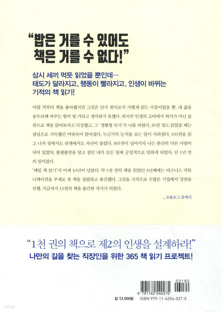 매일 읽었을 뿐인데, 거짓말처럼 인생이 바뀐다! 저자는 책을 전혀 읽지 않던 사람은 아니었다. 고등학교 때는 도서반을, 대학교 때는 독서토론 동아리 활동을 하며 주변 어느 사람들보다 책을 많이 읽어온 사람이었다. 그러나 오랫동안 책을 읽어 왔지만 그는 그 어떤 변화도 경험하지 못했고, 바로 그 사실이 그를 의문에 빠지게 했다. 오랜 고민 끝에 그는 자신의 독서에 두 가지 문제가 있었음을 깨달았다. 첫째, ‘취미로 공부를 해서 수능 만점을 받는다? 자격증을 딴다? 전문가가 된다?’라고 생각하는 사람이 없듯, 삶을 바꾸기 위해서 책을 읽는다면 전력으로 임해야 했다. 둘째, 단지 눈으로만 글을 봤을 뿐 읽은 것을 온전히 자신의 지식으로, 인생의 무기로 활용하지 못했다. 그리하여 저자는 하루 한 쪽이라도 매일, 자신의 현실에 적용하기 위한 책 읽기를 시작했다. 그렇게 시작한 독서는 하루에 한 권 이상, 1년에 365권은 거뜬히 읽게 만들어주었고, 결국 저자는 지금까지 약 3천 권이 넘는 책을 읽게 되었다. 약 1천 권의 책을 읽었던 3년째(2011년)에는 《회사어로 말하라》라는 첫 책을 집필하고 출간했다. 그것을 시작으로 수많은 기업에서 강연 요청이 쇄도하여 현재는 전국을 누비며 커뮤니케이션에 대한 강연을 진행하고, 지금까지 총 13권의 책을 출간한 작가가 되었다. 작년에 출간한 《모든 관계는 말투에서 시작된다》는 10만 명이 넘는 독자에게 사랑을 받으며 베스트셀러에 오르기도 했다. 저자는 책을 통해 얻은 가장 큰 소득은 자기 자신이 바뀐 것이라고 말한다. 매일 책 읽기 전에는 회사를 언제 떠나게 될지도 모른다는 불안과 가정을 제대로 부양하지 못하고 있다는 죄책감으로 하루하루가 괴로웠다. 그러나 30권을 독파했을 때는 잡념으로 가득했던 머릿속이 맑아졌고 누군가의 눈치를 볼 일이 사라졌다. 100권을 읽고 나자 일에서도 관계에서도 자신이 붙었다. 특히 영업사원인 저자는 사람을 만나는 일이 중요했는데 어떤 상대를 만나도 이야깃거리가 준비되어 있어 만남에 대한 두려움이 사라졌다. 365권이 넘어서자 저자는 완전히 다른 사람이 되었다고 말한다. 모든 일에 불평불만을 일삼던 과거의 자신은 전혀 찾아볼 수 없고 긍정적으로 모든 일에 임하게 되었다는 것이다. “책으로 제2의 인생을 설계하라!” 나만의 길을 찾는 직장인을 위한 365 책 읽기 프로젝트! 저자가 말하는, 나와 삶의 변화를 불러일으키기 위한 독서법의 핵심은 다음과 같다. 1) 취미가 아닌 삶을 바꾸기 위한 도구로 독서를 선택했다면 생활처럼, 습관처럼 독서하라. 2) 재미와 즐거움보다는 ‘지금, 여기’의 자신에게 깨달음을 주는 책을 선택한다. 3) 독서 종료는 마지막 페이지를 넘겼을 때가 아니라 책에서 필요로 하는 부분을 분명하게 찾았을 때다. 4) 책은 배치 순서대로 읽는 것이 아니라 저자의 의도를 가장 잘 파악할 수 있도록 ‘표지-저자소개-머 리말-맺음말-목차-다시 목차- 본문-다음 책’ 순으로 읽는다. 5) 책 귀퉁이를 접거나 밑줄을 긋거나, 심지어 책을 찢어서 내게 유용한 부분을 표시하고 기억하라. 6) 책장은 수시로 정리해 ‘지금 내 인생’에서 중요한 주제의 책들로 채운다. 독서는 양도 중요하지만 질적인 전략이 더욱 핵심이 되어야 한다고 저자는 강조한다. 매일 잘 계획된 운동을 해야 근육이 붙고 살이 빠지는 것처럼 매일 잘 준비된 프로그램에 따라 책을 읽어야 지식이 쌓이고 어디서든 써먹을 수 있는 지혜가 된다는 것이다. 제대로 된 운동을 하고 좋은 음식을 먹어야 몸이 건강해지는 것처럼 내 삶에 도움이 되는 책을 선택하고 전략적으로 읽어야 성장할 수 있다. 이 책에는 끝까지 완벽하게 읽어야 한다는 생각을 버리고, 자신의 목표에 맞게 주도적으로 책을 읽어 ‘지금, 여기’부터 바꾸는 독서법이 담겨 있다. 나를 바꾸고 싶다는 간절함을 가진 사람이라면 누구나 실행할 수 있다. |