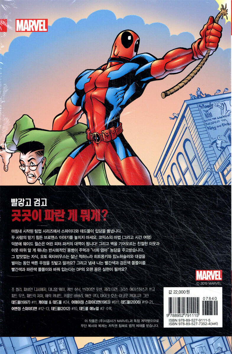 『데드풀』1-3권 『스파이더맨/데드풀』 1-3권 『데드풀 vs. 타노스』 『데드풀 & 케이블 얼티밋 컬렉션』1-2권 0권? 0권은 『데드풀』, 『케이블 & 데드풀』, 『어메이징 스파이더맨』, 『어벤징 스파이더맨』, 『데드풀 애뉴얼』까지 여러 타이틀에서 두 캐릭터가 함께 등장하는 이슈만 골라 한데 모은 단행본이다. 한 권을 관통하는 큰 스토리 없이 타이틀별로 내용이 다르고, 둘이 함께 등장한다는 것이 유일한 공통점이다. 더불어 2권도 각각 다른 작가가 이슈 단위로 스토리를 완결 짓는 ‘게스트 이슈’만 수록됐기 때문에 스토리상으로 1권과 이어지지 않으며, 1권의 스토리는 곧장 3권으로 이어진다. 따라서 0권과 2권은 1권, 3권과 함께 보지 않아도 내용을 이해하는 데는 무리가 없다. 0권과 2권은 다양한 시기를 배경으로 한 여러 에피소드가 이어지고, 1권과 3권에서는 조금 더 긴 호흡으로 시끄러운 콤비의 관계를 자세히 들여다볼 수 있다. 이슈에서 트레이드 페이퍼백으로 미국 만화는 제본 방식에 따라 크게 이슈, 트레이드 페이퍼백, 하드커버의 세 가지 형태로 분류된다. 이슈는 스테이플러 제본, 트레이드 페이퍼백은 무선 제본, 하드커버는 양장 제본이다. 이것은 출간 시기와도 상관이 있는데 월간 연재 형식의 이슈가 가장 먼저 나오고 이후에 이슈 여러 개를 모은 단행본 형태의 트레이드 페이퍼백이 발행된 다음, 고가의 소장 목적 하드커버가 출간된다. 『스파이더맨/데드풀』은 이러한 순서로 국내에서도 이슈1-10이 먼저 출간된 후 이를 모은 트레이드 페이퍼백이 출간되었다. 예외로 2권에는 국내에 출간되지 않은 이슈(「MU」 #1)가 수록되어 있으며, 3권은 수록 이슈 중 두 개(#9-10)만 이슈 형태로 먼저 출간되었다. |