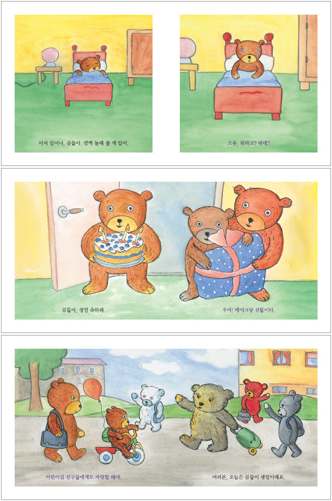 안나 클라라 티돌름의 전작인 [두드려 보아요]는 전 세계적으로 큰 성공을 거둔 베스트셀러로, 우리나라에서도 1993년 초판이 발행된 이후 지금까지도 꾸준하게 독자들의 사랑을 받고 있습니다. 이렇게 오랜 세월 동안 많은 이들의 사랑을 받은 데에는 타당한 이유가 있습니다. 바로 수동적으로 책읽기에 익숙한 독자를 책읽기에 직접 참여시키기 때문입니다. [두드려 보아요]에서 작가는 반복적으로 여러 색의 문을 클로즈업으로 보여 줌으로써, 독자가 직접 문 그림을 두드려 보도록 유도하고 있습니다. 독자로 하여금 책과 끊임없이 상호 작용하게 하는 것이지요. 이런 의도는 이번 신작에서 더욱 확연하게 드러납니다. 이제 독자는 직접 책 속으로 들어가 작품을 완성하는 주체가 됩니다. 독자가 주인공에게 말을 거는 독특한 그림책 [생일 축하해!]는 독자가 직접 자신의 목소리로 책 속 주인공과 말을 주고받는 대화 구조로 되어 있습니다. 독자는 책 밖에 있는 동시에 책 속으로 들어와 주인공, 곰돌이에게 말을 걸고 있는 것입니다. 화자의 변화는 글자 색으로 구분했습니다. 검은 색 문장은 독자의 대사이고, 자주색 문장은 곰돌이의 말입니다. 독자는 주인공 곰돌이와 대화를 나누면서, 상황에 직접적으로 반응하고 대화를 이끌어 갑니다. [생일 축하해!]에서 독자는 생일을 맞은 곰돌이를 관찰하는 게 아니라, 곰돌이와 더불어 여러 차례 생일 파티를 겪게 됩니다. 아무것도 모르고 잠을 자고 있는 곰돌이를 깨우는 것도 독자의 몫이고, 어린이집 친구들이 곰돌이 생일을 몰라 줄 때는 곰돌이를 위로하기도 합니다. 매 상황을 따라가다 보면 마치 책읽기가 2인극을 연출하는 것과 비슷합니다. 목소리를 바꾸어 ‘나’와 ‘곰돌이’의 역할을 왔다 갔다 할 뿐만 아니라 읽을 때마다 그때그때 다양하게 변화를 줄 수 있는 연극적 효과를 기대할 수 있습니다. 같은 문장이라도 어떻게 읽느냐에 따라 다양한 분위기를 연출할 수 있기 때문이지요. 예를 들어 [생일 축하해!]에서 친구들이 생일을 몰라 줘서 실망한 곰돌이에게 ‘조금만 기다려 봐.’ 하고 말을 건넬 때, 정말로 위로하는 듯 말할 수도 있고, 내심 무심한 듯 말을 건넬 수도 있습니다. 독자는 모든 대사에 자기 느낌을 덧씌워서 이야기를 완성하는 것입니다. 매번 읽을 때마다 다르게 읽을 수 있는 열린 구조의 그림책으로, 독자는 새로운 그림책 형식을 체험하게 될 것입니다. 독자를 메인 캐릭터로 삼는 편안한 그림 주인공인 곰돌이는 평범한 캐릭터입니다. 어느 집에나 하나쯤 있을 법한 곰돌이 인형입니다. 작가는 캐릭터에 큰 힘을 싣지 않았을 뿐더러 기존의 그림책보다 훨씬 가볍게 그림을 그렸습니다. 선도 가늘고 채색도 짙지 않습니다. 작가는 좀 더 편안한 그림으로 독자에게 가깝게 다가가려고 한 것 같습니다. 실제로 작가는 캐릭터에 크게 비중을 두지 않는 이유에 대해서 다음과 같이 말합니다. “나는 책 속에 인물(캐릭터)이 없다면, 아이들이 더욱 깊숙이 그림과 상호 작용을 하게 된다고 생각해요. 나는 책을 읽는 독자를 메인 캐릭터로 만들고 싶은 거예요. (안나 클라라 티돌름이 평론가 Ulla Rhedin에게 보낸 편지 중에)” 전체적인 그림 톤뿐만 아니라, 장면에서도 독자를 책 속으로 끌어들이는 장치를 엿볼 수 있습니다. [소풍 가자!]에서는 책 속에 독자가 들어와 있음을 교묘하게 드러난 장면이 있습니다. 언덕에서 깔개를 깔고 음식을 먹는 장면에서 보면, 곰돌이와 원숭이의 컵 말고도 다른 컵 하나와 케이크가 보입니다. 바로 독자를 위한 것입니다. 눈 밝은 독자라면, 이 음료와 케이크는 자신의 몫임을 알 것입니다. 작가는 독자를 직접 공간으로 끌어들이는 연출을 통해서, 진정으로 독자를 작품 속 주인공으로 삼고 있는 것입니다. 새롭게 선보이는 ‘사계절 아기그림책’ 이번에 사계절출판사는 다양한 영유아 그림책을 모색하고 창작의 활성화를 위해 ‘사계절 아기그림책’을 선보이게 되었습니다. 톡톡 튀는 콘셉트를 개발하고, 주제와 소재의 폭을 넓혀 영유아 그림책의 새로운 지평을 여는 그림책을 출간하려고 합니다.0세부터 3세까지, 처음으로 그림책을 접하는 아기들이 정말 좋아할 수 있는 책, 아이들이 먼저 읽어 달라고 뽑아 오는 책을 한 권 한 권 정성스럽게 만들고자 합니다. |