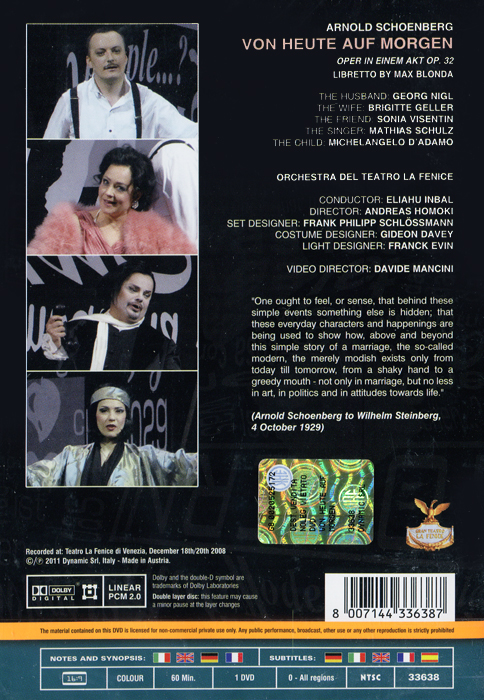- 12음 기법과 음렬주의 음악의 창시자인 아놀드 쇤베르크는 일생 동안 모두 4편의 오페라를 남겼다. 1909년 작곡한 심리적 내용의 모노드라마 '기대'와 그 직후에 작곡이 시작되어 1913년에 마무리된 음악극 '행복한 손', 그리고 1930년에 초연된 단막희극오페라 '오늘부터 내일까지', 그리고 미완성상태로 남겨진 최후의 유작 '모세와 아론'이 그것들이다. 아내의 대본을 토대로 완성한 '오늘부터 내일까지'는 밝고 현대적인 이야기를 다루고 있음에도 불구하고, 음악적으로는 12음기법이 본격적으로 활용된 진지하고도 복잡한 작품이 되고 말았다.