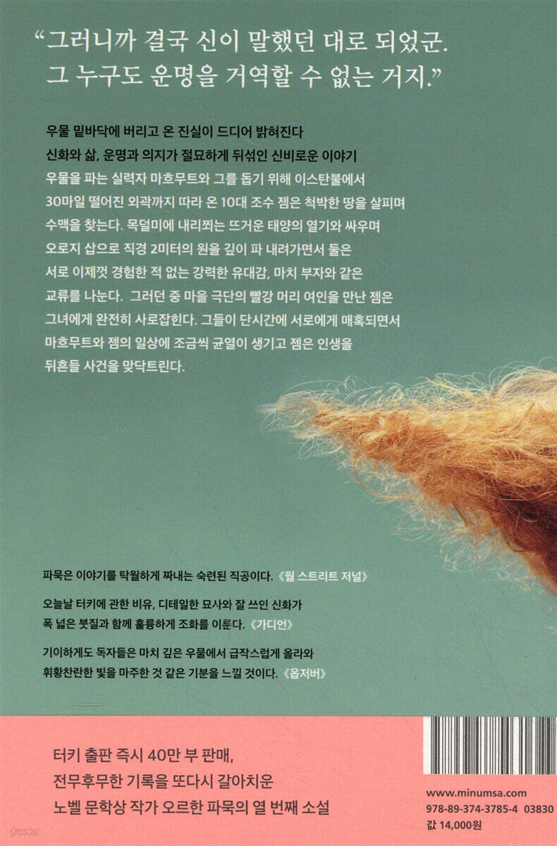 이따금 빨강 머리 여인이 생각나는 것을 알리는 그만두고라도 내 자신에게 숨기고 싶었다. 밤마다 한쪽 눈은 하늘에 떠 있는 별들을, 다른 눈은 우스타의 작은 텔레비전을 보면서 막 잠에 빠져들려고 할 때 빨강 머리 여인이 나를 보며 미소 짓는 모습이 눈앞에 떠올랐다. 그 미소와 얼굴에, “너를 알고 있어.”라고 말하는 그 표정에 다정함이 묻어 있지 않았더라면 어쩌면 그녀를 이렇게까지 생각하지 않았을 것이다. --- p.48 “아버지라는 사람은 공정해야 한단다. 공정하지 못한 아버지는 자식의 눈을 멀게 만들지.” 그는 왜 장님이 된다는 이야기로 끝을 맺었을까? 이 주제가 어디서 나온 것일까? 요셉이 우물 바닥에서 칠흑 같은 어둠 속에 남게 되었다는 것을 강조하기 위해서였을까? 나는 오랜 세월 동안 내 스스로에게 수없이 이 질문을 했다. 이 이야기가 왜 나를 불안하게 만들었고, 왜 그토록 우스타에게 화가 났을까? --- p.67 무더위로 숨을 쉴 수 없었던 7월 어느 날 정오에 소형 트럭을 타고 온 하이리 씨는 상황이 절망적인 것을 보고 우리 모두를 비통하게 만드는 말을 했다. 사흘 안에 어떤 결과를 얻지 못하면 이 우물에서 물이 나올 거라는 희망을 접고 작업을 중지시키겠다는 것이었다. 마흐무트 우스타가 계속하겠다면 그것은 알아서 할 일이라고, 그러나 사흘 뒤에도 여전히 물이 나오지 않으면 하이리 씨는 마흐무트 우스타에게도 알리에게도 일당을 주지 않겠다고 했다. --- p.97 나는 내 자리에서 꿈쩍 않고 얼굴을 위로 향한 채 이 모든 과정을 지켜보았다. 위에 마흐무트 우스타가 보이면 이곳 땅 밑에서 나는 혼자가 아니었다. 우스타가 양동이를 비우기 위해 가장자리로 물러나면 우물 입구에 동그랗고 아주 작은 하늘이 보였다. 너무나 멋진 파란색이었다! 거꾸로 본 망원경 끝에 있는 세상처럼 멀지만 아름다웠다. --- p.154 대체로 나는 다른 사람들과 같은, 아니 그들보다 더 성공적인 삶을 살고 있었다. 가끔 내 자신에게 아무 일도 없었던 척하는 데 성공하고 있다고 되뇌기도 했다. 나는 마흐무트 우스타와 어린 시절의 죄를 특히 비행기 여행을 할 때 가장 많이 떠올렸다. 이따금 벵가지에, 아스타나에, 바쿠에 혹시 내가 마흐무트 우스타를 기억하기 위해 가는 것일까 진심으로 궁금해하곤 했다. 비행기에서 아래를 내려다볼 때 나는 그를 생각하며 아이가 없는 것을 무척이나 아쉬워했다. --- p.193 내가 한동안 달력을 바라보고 있을 때 늙고 세상 풍파를 다 겪은 듯 보이는 집주인이 내 곁으로 왔다. 나는 이 그림이 무엇을 나타내는지 물었다. 그가 말하길 『왕서』에서 뤼스템이 아들 쉬흐랍을 죽인 후 아들 때문에 우는 장면이라고 했다. 그의 얼굴에는 “어떻게 모를 수가 있소?” 하는 자긍심 가득한 표정이 깃들어 있었다. 이란 사람들은 서양화 때문에 과거의 시인들과 전설들은 잊어버린 우리 터키인들과 다르구나 하는 생각이 들었다. 그들은 특히 시인들을 잊지 않는다. --- p.201 우리는 강하고 결단력 있는 아버지가 우리에게 무엇은 하고 무엇은 하지 말아야 하는지 말해 주기를 바란다. 왜 그럴까? 우리가 무엇을 하고 무엇을 하지 말아야 하는지와 관련해 무엇이 도덕적이며 옳고 무엇이 죄악이며 그르다는 결정을 내리기 어렵기 때문일까? 아니면 우리가 죄인이 아니라는 것을 항상 확인해야 하기 때문일까? 우리는 항상 아버지를 필요로 하는 것일까, 아니면 머릿속이 혼란스럽거나 우리 세계가 허물어졌을 때, 우리 영혼이 번민에 찼을 때만 아버지를 원하는 것일까? --- p.218 궁금증이 나의 영혼을 갉아먹고 있었지만 앞으로 내가 알게 될 것들 때문에 움츠러들기도 했다. 좋은 사람이 되려고 많은 노력을 했기 때문에 나는 여전히 바닥을 알 수 없는 회한으로 마음이 암담했다. 아무 잘못도 저지르지 않았는데 무언가에 대해 비난을 받는 공포는 꿈에서나 경험하는 두려움의 일종이다. 이러한 느낌을 아주 자주 받았다. --- p.263 삼십 년 전에 텅 빈 땅이었던 비탈길 꼭대기의 ‘우리 평지’는 육칠 층짜리 아파트들, 창고 건물들, 주유소들, 아래층에 식당, 케밥 가게, 슈퍼마켓이 꽉 들어찬 콘크리트 숲으로 변해 있었다. 우리가 밭을 가로질러 지름길로 이용하던 굽이진 길들은 고층 아파트들 때문에 보이지 않아 우리가 우물을 파던 곳이 어디인지 가늠하기가 힘들었다. --- p.285 나는 미소를 지으며 말했다. “걱정하지 마. 그가 무언가를 시도한다면 나도 뤼스템처럼 아시아의 권위적인 아버지가 되어 이 무례한 자식보다 앞서 그를 죽일 거야.” 아이쉐는 술에 취한 남편의 말을 진지하게 받아들이며 말했다. “물론 그런 짓은 절대 하지 마. 그 자리에서 절대 움직이지 마. 내가 지금 자동차를 타고 곧 갈 테니까.” --- p.310 “너에게 있어 아버지가 뭔데?” “어머니의 배 속에 잉태된 후 아들의 인생을 끝까지 보호하고 지켜 주는 강하고 정 있는 사람이야, 아버지란. 그는 세상의 시작이고 중심이지. 아버지가 있다고 믿으면 그를 보지 못해도 기분이 좋고, 그가 거기에 있다는 것을, 사랑하고 보호해 줄 준비가 되었다는 것을 알지. 나는 그런 아버지가 없었어.” “안타깝지만 나도 그런 아버