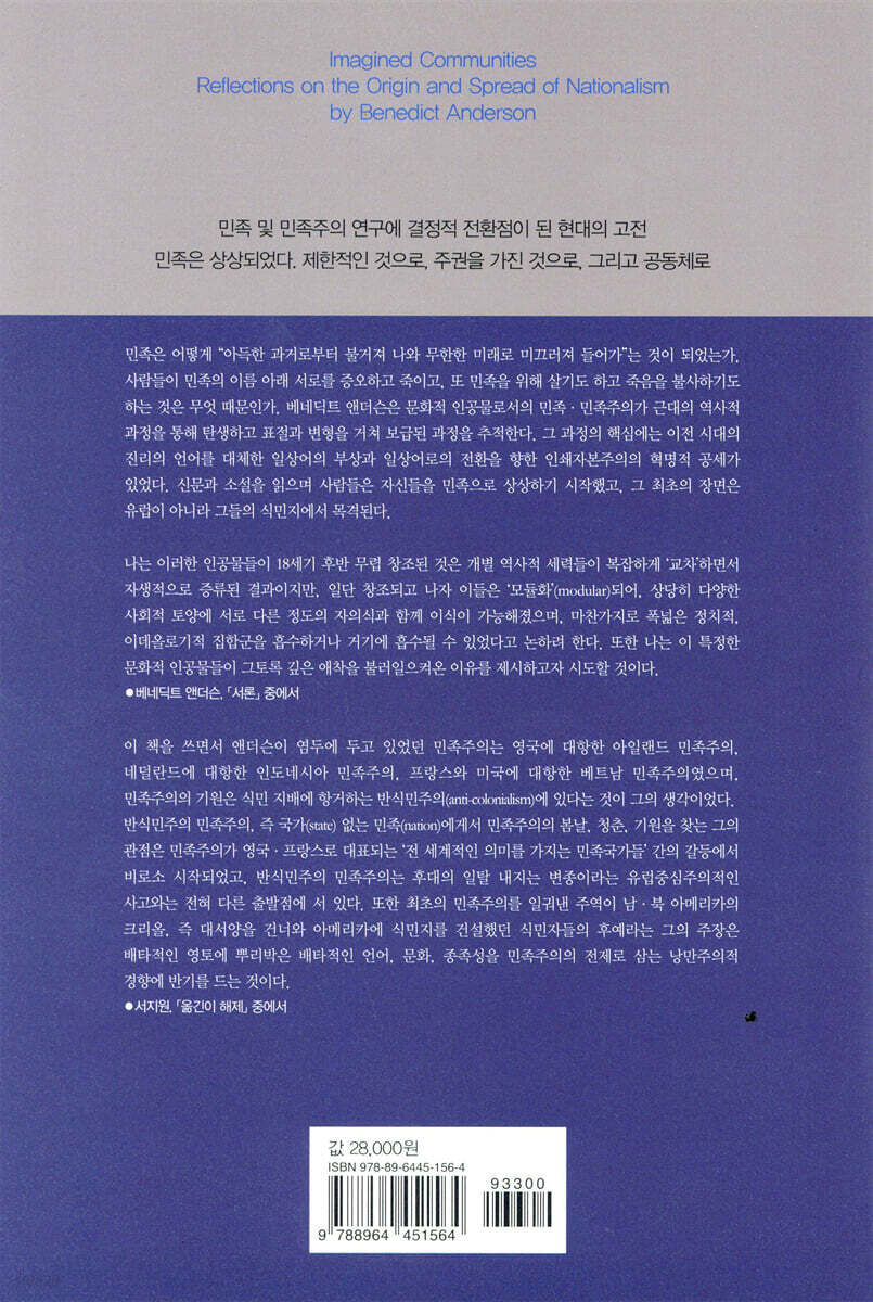 1983년 출간 이래 세계 수십 개국에서 25만 부가 넘게 판매되며(2006년 기준) 큰 반향을 불러일으킨 베네딕트 앤더슨의 『상상된 공동체』(Imagined Communities: Reflections on the Origin and Spread of Nationalism) 한국어판을 도서출판 길에서 새로운 번역으로 내놓는다. 이 책을 읽어보지 않은 이들조차 ‘민족’은 근대 이후 역사적 과정에 의해 만들어진 “상상된 공동체”라는 앤더슨의 핵심 주장을 익히 들어 알고 있을 만큼, 이 책은 이미 고전의 반열에 올라 있다. 2016년 런던정경대(LSE)의 한 연구자가 구글 학술검색 서비스를 활용해 가장 많이 인용된 사회과학도서의 순위를 집계한 바에 따르면, 『상상된 공동체』는 총 64,167회 인용되었으며, 이는 전체 사회과학도서 인용 순위 중 다섯 번째였다.(Elliott Green, 2018년 6월 현재까지의 통계는 88,813회 인용)