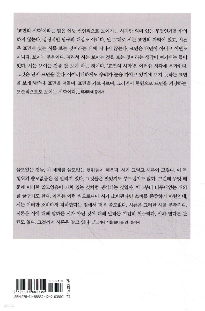 제1부 그러나 시를 쓴다는 것 15 그냥 무엇 24 시는 어디에 있는가-표면의 시학 32 시는 상상하지 않는다 43 현대시는 현대에 기대지 않는다 50 은유 없는 세계 은유 없는 시 54 반(反)묘사 60 메타시는 없다 68 어떤 시를 옹호해야 할 것인가-개척이냐 세련이냐 75 지향하지만 지향하지 않는 것 93 세상의 모든 노이즈를 경유하려는 듯이-섀넌, 정보, 시 102 시는 괜찮다-인공지능 시대의 시 111 제2부 내가 그녀임을 알았을 때-김구용의 『구곡』 123 한국 현대시의 네 가지 좌표 140 2000년대 시와 불교적 사유 164 시의 이미지는 어디서 오는가-최근 시의 이미지에 대하여 182 제3부 세계는 나비들로 이루어져 있다-이상의 「오감도 시 제10호 나비」 211 어떤 수금 의식-김구용의 「소인(消印)」 228 사건의 해산과 무관(無關)의 시학-김언의 『모두가 움직인다』 248 호모 트리스티스(homo tristis)-이준규의 『네모』 279 풍경에의 상상-이선욱의 『탁, 탁, 탁』 299 동시에 꿈을 꾼 것 같은-황인찬의 시 326 제4부 읽을 수 없는 숫자들-이상의 시와 타이포그래피 345 감옥에서 꺼내지는 언어들-앙리 마티스와 트리스탕 차라 351 미완성이 최고다-이브 본느프와 357 환대하는 것과 물리치는 것-로버트 브라우닝과 파울 첼란 361 그래서 어떻단 말인가-앤디 워홀과의 가상 인터뷰 372 발표 지면 385 인명 찾아보기 389 |