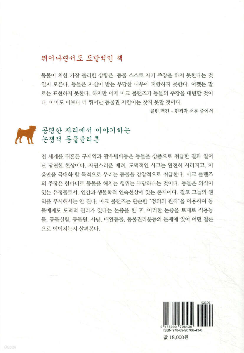 동물이 처한 가장 불리한 상황은, 동물 스스로 자기 주장을 하지 못한다는 것일지 모른다. 동물은 자신이 받는 부당한 대우에 저항하지 못한다. 어쨌든 말로는 표현하지 못한다. 하지만 이제 마크 롤랜즈가 동물의 주장을 대변할 것이다. 아마도 이보다 더 뛰어난 동물권 지킴이는 찾지 못할 것이다. 13쪽