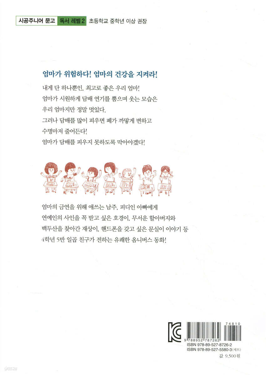 ▣ 작품 특징 ▶요즘 초등학생들은 어떤 고민, 어떤 생각을 하며 살까? _싸우고, 울고, 떼쓰고, 생각하고, 반성하며 커 가는 아이들의 이야기 《우리 반 친구들의 여덟 가지 이야기 담배 피우는 엄마》는 주인공이 일곱 명이나 되는 만큼, 다양한 환경에 놓인 아이들의 모습이 다양하게 펼쳐진다. 엄마가 담배를 피워서 걱정이 태산 같은 남주, 아빠가 연예인이 나오는 프로그램이 아니라 재미없는 다큐멘터리를 만드는 피디라 아이들에게 자랑도 못 하는 호경이, 무척 공부를 잘하는 형과는 달리 지지리도 공부 못하는 석근이, 가고 싶은 캐리비안 베이도 못 가고 할아버지와 백두산에 가야 하는 재상이, 우리나라에서 최고로 좋은 직장도 마다하고 부모님이 캐나다에서 험한 일을 하며 자신을 뒷바라지 하는 게 몹시도 부담스러운 용우, 핸드폰이 너무도 갖고 싶은 문실이, 왼쪽 다리가 조금 짧아 절뚝거리는 모습을 아이들에게 들키고 싶지 않은 륜하 등 일곱 명의 주인공을 앞세워 요즘 아이들의 다양한 생활상과 그에 따르는 고민과 갈등을 유쾌하고 발랄한 문체로 다루었다. 각자 아이들이 1인칭 시점으로 대화를 이끌어가듯, 작가는 아이들의 눈높이에서 이야기를 펼쳐 나가기를 잊지 않는다. 각자 처한 환경에서 아이들의 속내를 대신 꺼내 보이기도 하고, 불합리한 어른들의 사고를 비판하기도 한다. 친구들 사이에서 벌어지는 미묘한 갈등은 물론이고, 치열한 교육열기에도 시달리느라 바쁘지만, 스스로 탈출구를 찾아 열심히 달리는 우리 초등학생들의 생생한 모습이 담긴 작품이다. 각자 개성 있는 주인공들의 이야기를 담은 이 작품은 4학년 아이들의 성장 동화이기도 하다. 핸드폰을 사 달라고 떼를 쓰기도 하고, 괜한 싸움으로 반 전체가 두 편으로 갈라서기도 하고, 백두산보다는 캐리비안 베이에 가서 신 나게 물놀이를 하고 싶어 하는 주인공들은 스스로 자신들의 문제를 열심히 헤쳐 나가며 하나씩 깨달음을 얻어 가기 때문이다. ▶여덟 편의 시트콤을 보는 듯한 옴니버스 동화! 이 작품은 4학년 5반, 같은 반이라는 공통분모가 각 이야기를 거미줄처럼 끈끈히 연결해 준다. 여덟 편의 독립된 이야기를 접하게 되지만, 누가 누구와 단짝이고, 누구와는 앙숙이며, 지금 하는 고민이 누구 때문에 생겼는지 등, 일곱 주인공들의 사건들이 전체적으로 얽혀 있다. 앞 친구 이야기에서 그냥 스쳐 지나갔던 소소한 부분이, 뒤에 다른 친구 입장에서는 큰 의미가 부여되면서 읽는 재미를 더한다. ▶실화를 바탕으로 한, 현실이 살아 있는 이야기! 이 작품에 담긴 여덟 편의 이야기는 모두 작가가 직접 겪은 실화를 바탕으로 꾸민 동화다. 아이들이 주인공인 이야기답게 철없는 개구쟁이의 모습이 고스란히 담겨 있기도 하지만, 뜻밖에 어른스럽고 기특한 사고와 고민이 엿보여 어른들의 눈높이로 쓴 동화가 아닐까 의심할 수도 있다. 하지만 늘 아이들 틈에 사는 작가가 겪은 실제 경험담을 바탕으로 이야기를 꾸민 동화다. 우리 아이들의 현 모습이 가장 실감나고 정직하게 담겨 있다. 류호선 작가가 귀띔해 준 작품의 뒷이야기 1. 용우 이야기_ 우리만의 휴전선 이 이야기에 나오는 용우와 남주는 실제로 둘도 없는 단짝이었다고 한다. 반별 이어달리기 대표를 뽑는데, 늘 남주가 용우보다 빨랐다. 용우는 남주보다 빨리 뛸 수 없다며 불평에 불평을 늘어놓기 일쑤였다. 작가는 이러다가 두 녀석의 우정에 금이 가면 어쩌나 걱정이 많았다고 한다. 그러나 그것은 기우! 결승선에 달려 들어오는 남주를 누구보다 기뻐하며 맞이한 친구는 바로 용우였다. 2. 남주 이야기_ 담배 피우는 엄마 한 아이가 수업이 끝나자 작가에게 슬금슬금 다가와 어렵게 이야기를 꺼냈다. “우리 아빠가 죽어 가고 있어요.” 작가는 눈물을 흘리는 아이의 손을 붙들고 함께 울며 아빠가 무슨 병이시냐고 물었다. “아직 병에 걸리신 건 아니지만, 담배를 피우고 계셔서 이제 곧 병에 걸리실 거예요.” 작가는 부모의 흡연으로 고민하는 아이의 실상을 멋진 이야기로 꾸몄다. 3. 호경이 이야기_ 아빠는 피디님 작가가 어렸을 때 동네에 피디 아저씨가 살았다고 한다. 독도의 자연, 갯벌, 아프리카의 물소 떼 등의 다큐멘터리를 만든 그 피디 아저씨를 보고, 모든 피디가 연예인이 나오는 프로그램을 만드는 게 아님을 알았다고 한다. 작가는 그 피디 아저씨의 아들이 아빠가 집에도 잘 오지 못하고, 아빠가 만든 프로가 마음에 들지 않는다고 찾아오는 사람들 때문에 걱정하기도 한 것을 기억하며 이 이야기를 썼다. 4. 석근이 이야기_ 우리 형 대학 가다 수민이라는 학생이 있었다. “선생님! 대학은 왜 가요? 대학 안 간 훌륭한 사람들도 많잖아요?” 이렇게 외치던 수민이는 장래 희망에 커다란 글씨로 ‘대학 안 가고 훌륭한 사람 되기’라고 적었다고 한다. 초등학교 때부터 대학 입학에 대한 두려움을 가지는 우리 아이들의 모습을 잘 집어서 이야기로 풀었다. 5. 재상이 이야기_ 동해물과 백두산이 작가가 초등학교 다닐 때부터 윗집에 머리가 하얀 할아버지가 살고 있었다. 그분께 날이면 날마다 한자를 배우고, 두만강이나 만주 벌판, 북한 이야기를 들었