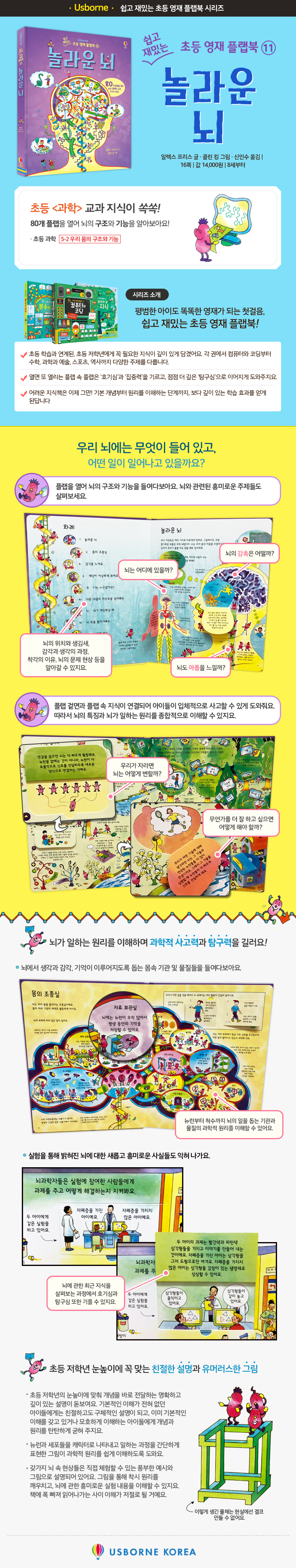 각 부위의 기능을 알아보아요! *초등 〈과학〉 교과 연계 5-2 우리 몸의 구조와 기능 우리 뇌에는 무엇이 들어 있고, 어떤 일이 일어나고 있을까요? 플랩을 열어 먼저 ‘뇌’의 생김새와 위치, 역할 등 뇌의 간단한 특징을 알아보아요. 그런 다음, 뇌와 관련된 흥미로운 주제들을 차례로 살펴보아요. 뇌의 각 부위에서 담당하는 일, 감각과 생각이 이뤄지는 과정, 착각이 일어나는 이유, 뇌에 문제가 생기면 일어나는 현상 등을 알아갈 수 있지요. 이를 통해 뇌가 몸과 마음을 조종하고 기억을 저장하는 일까지 다양한 일을 하고, 우리 몸에서 중요한 역할을 담당한다는 사실을 깨닫게 될 거예요. 뇌에서 일어나는 일들을 한눈에 살펴보는 과정에서 뇌가 일하는 과정을 논리적으로 쉽고 재밌게 알아갈 수 있어요. 플랩 겉면과 플랩 속 지식이 연결되어 아이들이 입체적으로 사고할 수 있게 도와 뇌의 특징과 뇌가 일하는 원리를 종합적으로 이해하게 한답니다. 뇌가 일하는 원리를 이해하며 과학적 사고력과 탐구력을 길러요! 뇌에서 생각과 감각, 기억을 하는 동안 이를 돕는 우리 몸속의 여러 기관 및 물질들을 들여다보아요. 뇌에서 일하는 작고 수많은 ‘뉴런’부터 뇌에서 몸으로 신호를 보내는 ‘척수’, 뇌에 에너지를 주는 ‘혈관’, 뉴런에게 영향을 미치는 ‘호르몬’까지, 뇌와 함께 일하는 다양한 우리 몸속 요소들을 함께 살필 수 있어요. 특히, 여러 상황에서 뉴런이 작동하는 방식을 통해 과학적 원리를 이해할 수 있어요. 각각의 뉴런은 가까이 있는 다른 뉴런에게 신경 물질을 전달하면서 뇌의 일들을 처리해요. 우리 뇌에서는 뉴런의 연결을 끊고 다시 새로운 방식으로 연결해 특정한 부분을 더욱 건강하고 튼튼하게 만들지요. 뇌에서 뉴런을 통해 어떻게 다양한 일들을 해내고, 생각을 어떻게 결합하는지 익히면서 과학적 사고력을 기를 수 있을 거예요. 또한 이 책에서는 뇌에 관한 흥미로운 사실들도 소개해 줘요. 뇌가 어떤 식으로 작동하는지 연구하는 과학자들이 사람들의 반응을 살피고, 기계로 뇌 속을 들여다보며 알아낸 사실들이지요. 뇌에 관한 최근 지식을 살펴보는 과정에서 호기심과 탐구심도 기를 수 있어요. 초등 저학년 눈높이에 꼭 맞는 친절한 설명과 유머러스한 그림 명확하고 깊이 있는 설명은 초등 저학년의 눈높이에 꼭 맞아요. 기본 이해가 전혀 없던 아이들에게는 친절하고도 구체적인 설명이 돼요. 반면 이미 기초적인 이해를 갖고 있거나, 모호하게 알고 있는 아이들에게는 개념과 원리에 대한 이해를 탄탄하게 굳혀 주지요. 뇌 속 구조를 단순화한 흥미로운 그림과 구성도 아이들의 이해를 도와요. 작은 뉴런과 세포들을 캐릭터로 나타내고 일하는 과정을 간단하게 표현한 그림이 과학적 원리를 쉽게 이해하도록 돕지요. 갖가지 뇌 속 현상들은 직접 체험할 수 있는 풍부한 예시와 그림으로 설명되어 있어요. 그림을 통해 착시 원리를 깨우치고, 뇌에 관한 흥미로운 실험 내용을 이해할 수 있지요. 책에 폭 빠져 읽어 나가는 사이 쏙쏙 이해가 될 거예요. |