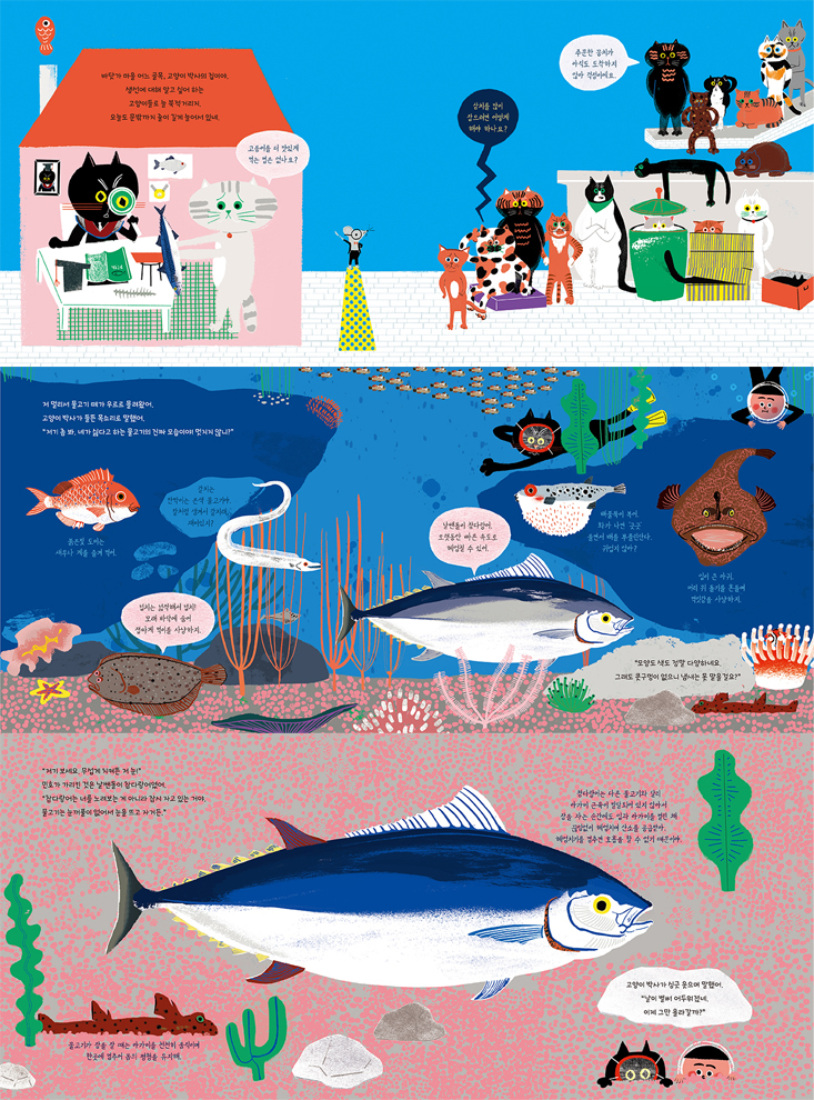 바닷가 어느 마을, 고양이 박사의 집 앞은 늘 고양이들로 북적거립니다. 어떻게 하면 고등어를 더 맛있게 먹을 수 있는지, 삼치를 많이 잡으려면 어떻게 해야 할지, 고양이들은 이래저래 고민이 많은데, 고양이 박사는 이 모든 고민거리를 명쾌하게 해결해 줄 수 있는 생선 박사였거든요. 이런 고양이 박사에게 고양이 한 마리가 흥미로운 고민을 털어 놓습니다. 생선이라면 몸서리치는 아이 때문에 자신까지 생선을 먹지 못하고 있다는 안타까운 소식이었어요. “내가 생선의 진짜 모습을 보여 줄게. 좋아하지 않고는 못 배길걸?” 고양이 박사는 호언장담하며 아이를 찾아갑니다. 고양이 박사가 보여 준다는 ‘생선의 진짜 모습’은 무엇일까요? 외모도, 습성도, 나이도, 수명도 다른 개성 만점 물고기의 세계 <생선의 발견>에는 물고기의 신비를 논할 만한 이야기들이 가득합니다. 물고기에게 팔다리가 있을까, 물고기에게 코가 있었나, 물고기 나이는 나보다 많을까 적을까, 눈 감은 물고기는 본 적이 없는데 잠을 안 자고도 생활할 수 있을까, 생선이 몸에 좋다는데 어디에 어떻게 좋은 건지… 반항기 가득한 반찬투정쟁이 민호가 되어 고양이 박사의 쌈박한 이야기를 듣고 있노라면, 박사를 따라 바닷속과 육지를 누비며 시원하게 한바탕 모험을 즐긴 듯한 기분에 사로잡힙니다. 장난스러운 유머와 시원한 재치로 펼쳐 낸 생선의 진실 논픽션을 줄곧 써온 보기 드믄 논픽션 작가인 김황 작가는, 이번에도 집요한 자료 수집과 관찰, 공부를 밑천으로 밀도 있게 물고기 이야기를 풀어냈습니다. 우리나라에서 흔히 접할 수 있는 대표 어종들을 예로 들어 설명하기 때문에 친숙하면서도 흥미롭습니다. 작가 자신을 생선 박사 고양이에 이입하고 고양이 화자를 통해 이야기함으로써 자칫 딱딱해질 수 있는 논픽션 그림책에 한층 유머를 더했습니다. 비린내 나서 생선이 먹기 싫다는 아이들, 바다에 사는 동물로 물고기는 좋아하지만 아직 먹을거리로 그 매력을 잘 모르는 아이들과 함께 생선을 ‘발견’해 보는 건 어떨까요? |