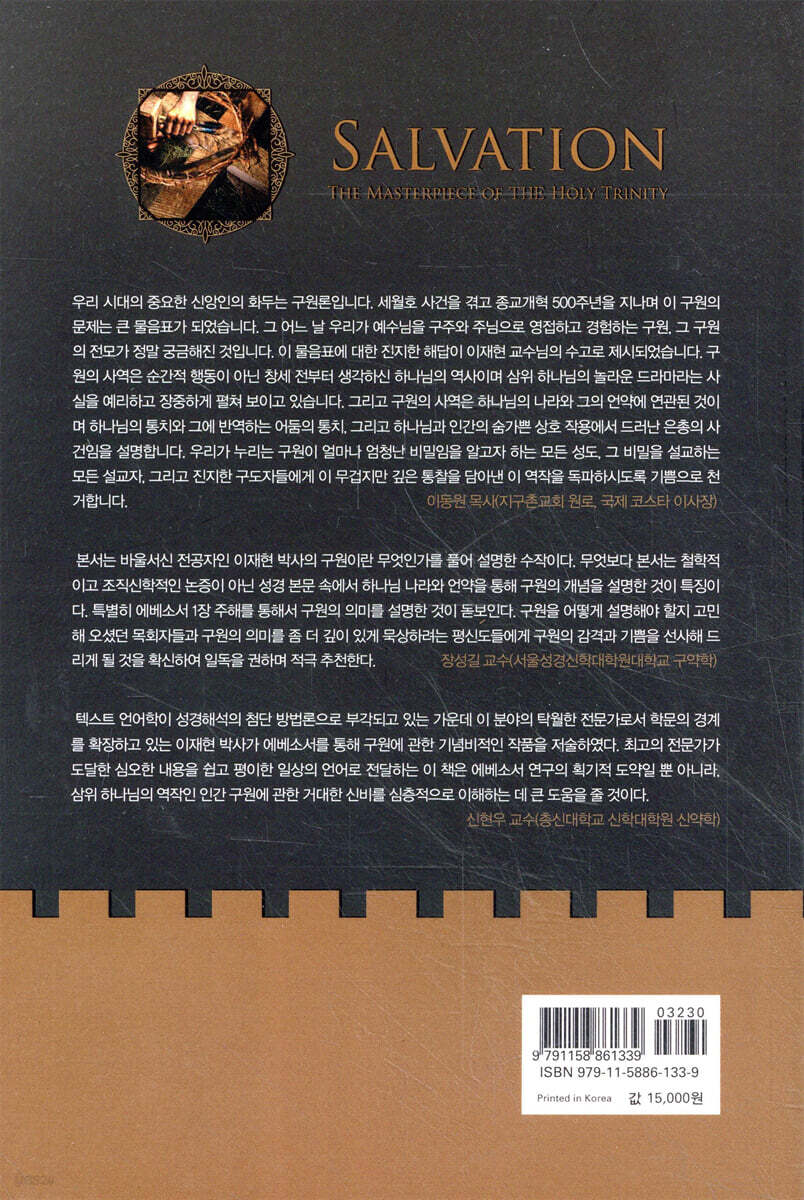 ‘구원’이란 단어는 기독교 공동체에서 가장 많이 사용되는 것 중 하나이다. 하지만 그 단어가 교회와 신자의 삶의 실제 영역에서 적용되는 과정은 많은 갈등과 혼란의 모습을 보이고 있는 듯하다. 필자가 보기에 그 중요한 원인은 구원의 숲이라는 큰 그림을 잘 이해하지 못한 것에 있는 것 같다. 지나온 역사 동안 구원의 숲에 있는 각 나무와 여러 오솔길에 대해서는 많은 논의와 연구, 그리고 나름의 합의가 있어왔다. 예를 들어 예수를 믿음으로 구원을 얻는다는 것이라든지 혹은 예수를 믿으면 사람의 죄를 용서받을 수 있고 천국에 갈 수 있다는 등등의 내용이다. 하지만 큰 그림이 없으면 여러 갈래로 나있는 오솔길이나 그 길 옆에 있는 나무들이 갖고 있는 위치와 역할을 이해하기가 어렵다. 분명히 여러 좋은 길을 보고 있고 훌륭한 나무들을 가지고 있지만, 어디로 가고 어떻게 살아야 하는지에 대해서는 감을 잡기가 어렵다는 것이다. 그래서 예수를 믿는 것과 그 이후의 삶과의 단절 같은 현상들이 벌어지는 것이 아닐까 싶다. 또한 교회 안에서 행해지는 개인의 신앙과 세상 속에 사는 신자의 삶을 분리하기도 한다. 사실, 큰 그림이 분명치 않으면 자기가 소유하고 있다고 여기는 작은 부분의 지식이 정말 적절한지도 분간하기 어렵다. 이런 현상은 일선 목회자에게도 예외가 아닌듯 싶다. 또한 그들에게 신앙의 가르침을 배우는 일반 신자들 역시 경험하는 것이기도 하다. 이 책은 이런 필요에 응해서 구원이라는 큰 그림을 설명하기 위해 쓰여졌다. 모든 것을 다 다루지는 않았지만, 시간적으로 창조 이전에서 시작해서 역사가 완성되는 미래 시점을 포함했고, 공간적으로 개인을 넘어 사회와 하나님이 창조하신 모든 피조물의 영역까지를 포함하고 있는 하나님의 구원을 설명하려고 했다. 필자는 몇 가지 원칙을 가지고 이 책을 기술했다. 첫째, 가급적 쉬운 용어로 설명하려 했다. 구원에 대한 이해가 어려운 것은 기본적으로 인간이 볼 수도 없고 완전히 이해할 수도 없는 보이지 않는 창조주 하나님과 관련된 일이기 때문이다. 하지만 보다 실제적으로 그 구원 과정을 설명하는 부분에서 학자들이 사용하는 용어들이 생소하기 때문이다. 또한 그 안에 있는 개념이 복잡하기 때문이기도 하다. 필자는 가능한 한 많은 사람들에게 구원에 대한 큰 그림을 소개하고 싶었기에 학자들의 논쟁은 가급적 지면에 담지 않았다. 그 논쟁이 쓸모없기 때문이 아니라, 복잡한 논의로 구원을 이해하는데 오히려 장애가 되는 일을 피하고 싶었기 때문이다. 그들의 논쟁은 참고 문헌으로 간단히 처리하고 대신 필자가 이해하고 정리한 내용을 설명하려고 했다. 둘째, 성경 자체의 이야기에 충실하도록 노력했다. 성경은 지나온 역사 동안 창조주 하나님이 사람과 어떻게 관계를 맺어왔는지, 그리고 구원과 관련해 어떻게 일하시고 계신지를 보여주는 최고의 자료이다. 아니, 성경밖에 없다고 말해야 한다. 그래서 성경 자체를 통해 하나님의 구원 계획과 그것을 이루어가는 과정을 보는 것은 가장 중요한 작업이다. 문제는 성경 자체의 내용을 이해하는 것이 다양한 논의와 대화하는 과정을 포함하고 있다는 점이다. 그래서 어떤 면에서는 성경의 모든 본문의 진의를 완전하게 이해하는 작업은 요원하다고 볼 수 있다. 보다 적절한 표현은 계속해서 그 진의를 알아가는 과정이라고 해야 할 것이다. 이런 면에서 필자의 이해는 완전한 것이 아니다. 다만 성경 본문에 대해 현재 필자가 이해하는 최선의 해석을 통해 하나님의 구원을 이해하려 했다. 각 본문에 대해 필자와 다른 해석이 가능하다. 계속되는 대화를 통해 더 나은 이해를 위한 과정은 여전히 지속되어야 한다. 셋째, 가급적 예수에 대해 ‘그리스도’라는 단어 대신 ‘메시아’라는 단어를 사용하려고 했다. 둘 다 기름 부음 받은 자라는 뜻이지만 의도적으로 히브리어 표현을 주로 사용했다. 신약에서 그리스도는 예수의 신성과 연결지어 생각하는 경향이 있다. 틀린 것은 아니다. 하지만 종종 그 표현은 옛 언약(구약)과 새 언약(신약)과의 연결점을 잘 생각하지 못하게 한다. 필자는 창조 이전에 세워진 하나님의 구원 계획이 옛 언약의 모습을 통해 새 언약으로 구체화되고 성취된다고 보기에 의도적으로 예수에 대해 메시아로 표현했다. 하나님의 구원 계획의 통전성을 강조하고 싶었기 때문이다. 이 책은 크게 네 부분으로 구성되어 있다. 제1장은 하나님의 구원에 대한 전체 그림을 담고 있다고 볼 수 있는 에베소서 1:3-14를 통해 구원 스케치를 했다. 시간적으로는 창조 이전에서부터 역사를 마무리하는 먼 미래가 담겨 있으며 공간적으로 개인과 공동체의 모습이 들어 있다. 또한 구원 과정에서 각각의 역할을 담당하시는 아버지와 아들, 성령 하나님의 모습이 있고, 그 하나님과 반응하는 인간의 모습이 있다. 제2장은 하나님의 구원 계획의 전체 그림을 이해할 수 있는 열쇠들을 소개했다. 하나님의 나라와 언약, 상호 작용 설명 틀과 두 영역 설명 틀이 그것이다. 앞의 두 요소는 구원의 내용과 관련 있다. 하나님의 나라가 개인과 사회, 모든 피조물을 포함한 창조
