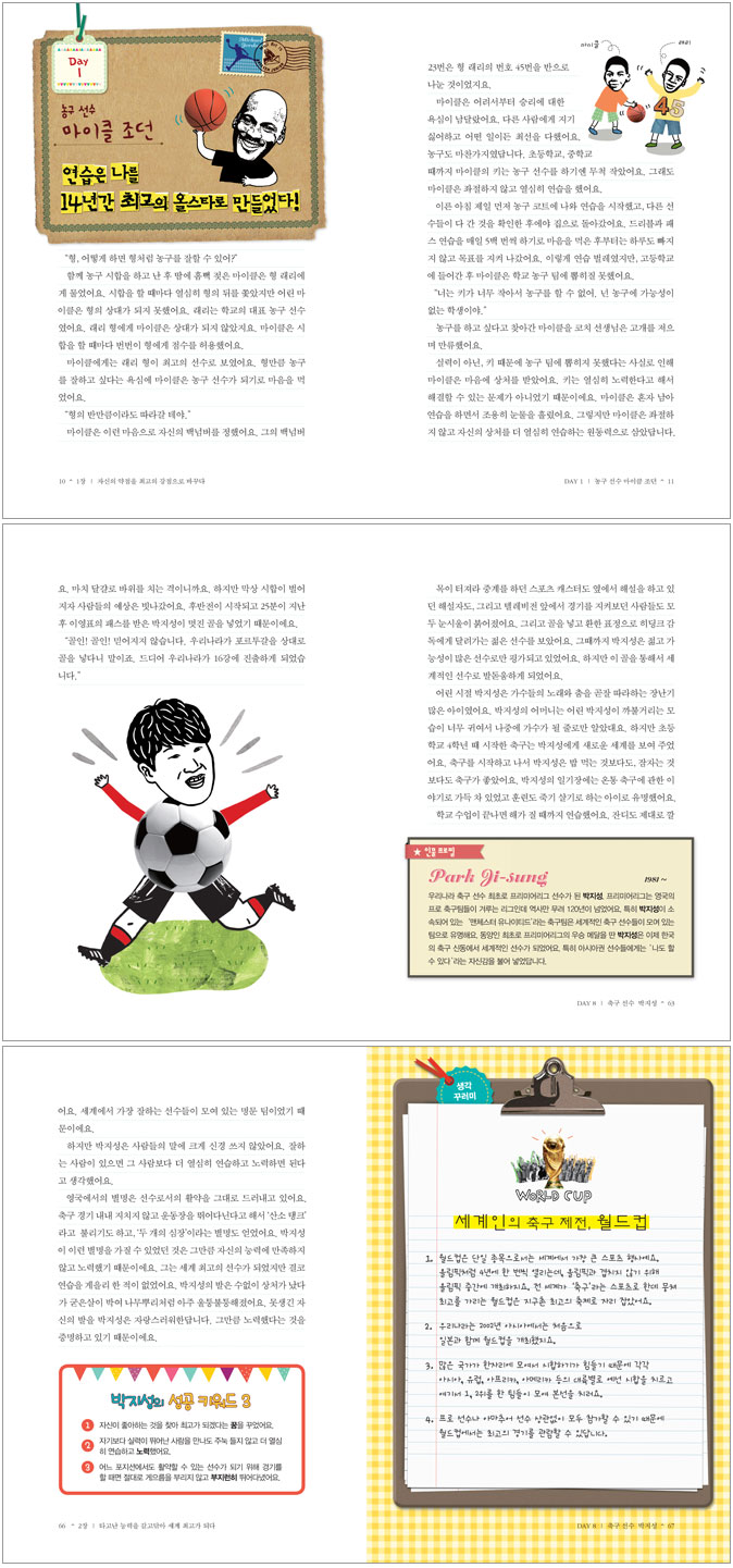 연습은 나를 14년간 최고의 올스타로 만들었다! _ 농구 선수 마이클 조던 한 점의 그림을 위해 백 번을 다시 그리다 _ 화가 폴 세잔 예쁘지 않아도 스타가 될 수 있다 _ 영화배우 겸 가수 바브라 스트라이샌드 눈이 나빠 악보를 외워 최고의 지휘를 하다 _ 지휘자 아르투로 토스카니니 친구들도 비웃는 음치에서 조선 최고 명창이 되다 _ 소리꾼 우평숙 2장 타고난 능력을 갈고닦아 세계 최고가 되다. 밤낮 없이 노력해 최고의 명필가가 되다 _ 서예가 한석봉 남다른 지도력으로 삼국 통일의 기반을 마련하다 _ 정치가 선덕여왕 음악 신동에서 음악의 거장으로 거듭나다 _ 피아니스트 예프게니 키신 끝없는 열정으로 수만 점의 그림을 남기다 _ 화가 파블로 피카소 3장 어린 시절의 시련을 극복하고 성공을 이루다 그릇을 팔던 소년이 독립운동가가 되다 _ 독립운동가 이승훈 기차를 훔쳐 타던 불량배에서 최고의 소설가가 되다 _ 소설가 잭 런던 뒷골목 소년에서 난치병을 치료하는 의사가 되다 _ 의사 벤 카슨 우울증과 약물 중독을 이겨 내고 최고의 여배우로 서다 _ 영화배우 드류 베리모어 가난을 벗어나기 위해 무대에 오른 꼬마가 세계적인 코미디언이 되다 _ 배우 찰리 채플린 4장 세상의 편견을 당당하게 이겨 내다 흑인 최초의 미국 대통령, 인종의 벽을 뛰어 넘다 _ 정치가 버락 오바마 편견을 깨뜨리고 여자도 바지를 입을 수 있게 만들다 _ 디자이너 코코 샤넬 컴퓨터 게임도 스포츠이다 _ 프로게이머 임요환 예술의 경계를 허물고, 남다른 세계를 창조하다 _ 아티스트 백남준 만화를 통해 어른의 마음을 움직이다 _ 애니메이션 감독 미야자키 하야오 5장 실패에 좌절하지 않고 다시 도전하다 805번의 실패 뒤에 드디어 인류의 날개를 달다 _ 발명가 라이트 형제 수십 번의 퇴짜에도 좌절하지 않고 탄생한 해리 포터 _ 소설가 조앤 롤링 자신이 만든 회사에서 쫓겨나도 다시 한 번 성공 신화를 일궈 내다 _ 사업가 스티브 잡스 직접 만든 요리로 영국 학교 급식 제도까지 바꾸다 _ 요리사 제이미 올리버 60~70번의 오디션 탈락이 키워 준 연기 실력 _ 영화배우 이준기 6장 장애는 불편할 뿐이라며 극복하다 35년간 왼손만을 사용한 최고의 피아니스트 _ 피아니스트 레온 플라이셔 남들에겐 불행하게 보일지 몰라도 나는 행운아이다 _ 공학 박사 이상묵 꿈이 있다면 장애는 조금 다른 차이일 뿐이다 _ 수영 선수 나탈리 뒤 투아 좌절은 그녀를 더 강하게 만든다 _ 화가 프리다 칼로 몸은 묶여 있지만, 생각은 우주를 자유롭게 날다 _ 우주 물리학자 스티븐 호킹 |