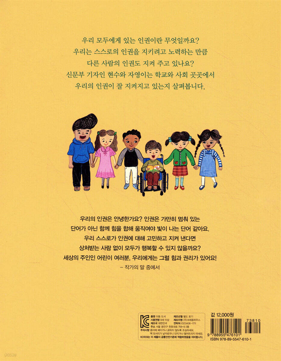 모든 사람은 누구나 태어나면서 성별, 국적, 인종 등과 관계없이 존중받으며 인간답게 살 권리를 가져요. 그것이 바로 인권이에요. 인권은 다른 사람이 함부로 빼앗을 수도, 다른 사람에게 넘겨줄 수도 없지요. 태어나면서 누구에게나 자연적으로 주어지는 권리이자 인간으로서 존엄성을 지키기 위한 기본적인 권리예요. 그런데 우리는 인권에 대해 얼마나 알고 있나요? 내 인권이 잘 지켜지고 있는지 생각해 본 적이 있나요? 인권에 대해 제대로 알아야 스스로의 인권을 지킬 뿐 아니라 다른 사람의 인권도 지켜 줄 수 있을 거예요. 주변을 둘러볼까요? 여러분은 내 인권이 침해받고 있다고 생각한 적이 있나요? 현수와 자영이는 ‘인권’이라는 단어를 알고 있었지만 생활 곳곳에서 인권 문제를 발견하고 깜짝 놀랐어요. 예를 들면 휠체어를 탄 장애인이 경사로가 없는 음식점에 들어가는 것도 장애인이 인권 침해를 당하는 것이었거든요. 장애인을 위한 시설이 생각보다 많이 없는 것, 성차별 문제 심지어 학교에서 많이 일어나는 따돌림 문제도 심각한 인권 침해에 관한 문제였지요. <우리에게도 인권이 있을까?>에는 우리 주변에는 크고 작은 인권 문제들이 담겨 있습니다. 주변을 둘러보세요. 상처받고 힘들어 하는 사람은 없나요? 스스로의 인권을 넘어 다른 사람의 인권도 지켜줄 수 있을 거예요. 모두가 행복한 세상을 위해! 인권은 모두에게 주어진 권리이지만 그 인권을 지키지 못하는 사람이 있어요. 대체로 사회적 약자와 소수자들이 그러합니다. 시각 장애인에게 계단은 공포의 대상일 거예요. 휠체어를 탄 장애인에게 경사로 없는 대중교통이나 승강기 없는 건물은 이용하고 싶어도 이용할 수 없는 대상일 테지요. 비장애인이 아무 생각 없이 지나친 것들이 장애인에게는 상처일 수 있지 않을까요? <우리에게도 인권이 있을까?>에서 인주는 다문화 가정 친구를 따돌립니다. 그리고 “따돌리는 것이 인권 침해인 줄 몰랐어.”라고 말합니다. 우리도 의도치 않게 내뱉은 말이나 행동으로 상대에게 상처 준 적이 있을지 몰라요. 무심코 지나쳐 버린 상황이 누군가에게는 인권을 침해당한 상황이었는지도 모르지요. 현수, 자영이와 함께 인권에 대해 정확히 알아봐요. 내 인권뿐만 아니라 다른 사람의 인권도 지켜줄 수 있는 힘이 생길 거예요. 한 사람, 한 사람씩 인권을 지켜 나간다면 우리 모두가 행복한 세상을 만들 수 있을 거예요. |