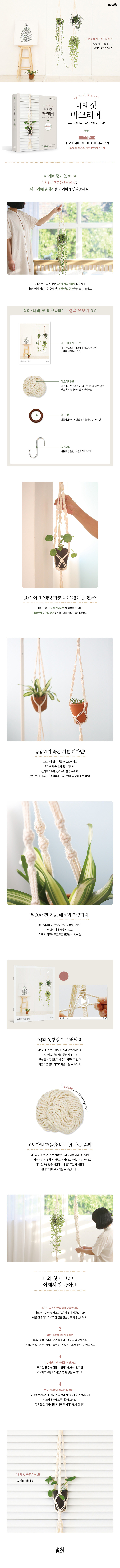 이래서 좋아요 PART 1 마크라메 기본 레슨 - 준비물 - 마크라메 기초 상식 - 작업을 시작하기 전에 알아둘 것들 PART 2 3가지 매듭법 레슨 - 평매듭 - 교차평매듭 - 평돌기매듭 PART 3 플랜트 행거 실전 레슨 - 전체 구조 한눈에 보기 - 플랜트 행거 전 과정 한눈에 보기 - Maker’s Letter |