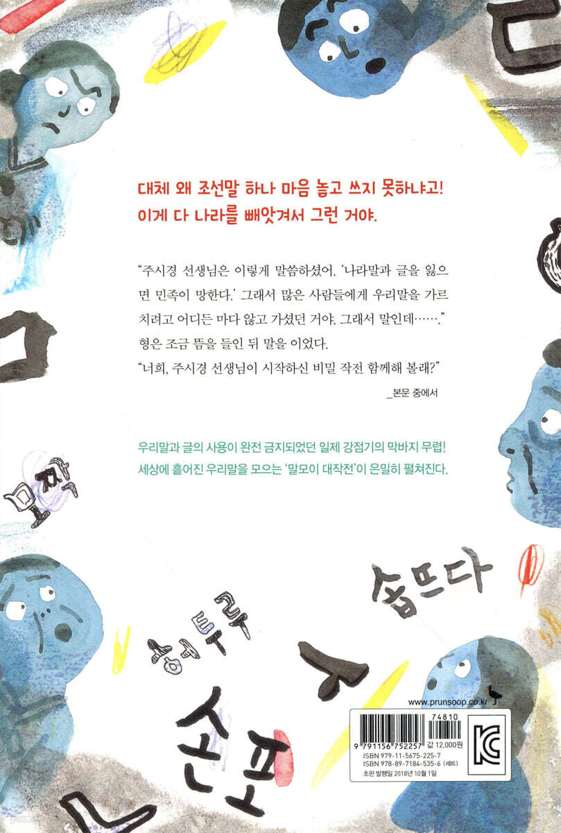 이게 다 나라를 빼앗겨서 그런 거야.” “주시경 선생님은 이렇게 말씀하셨어. ‘나라말과 글을 잃으면 민족이 망한다.’ 그래서 많은 사람들에게 우리말을 가르치려고 어디든 마다 않고 가셨던 거야. 그래서 말인데….” 형은 조금 뜸을 들인 뒤 말을 이었다. “너희, 주시경 선생님이 시작하신 비밀 작전 함께해 볼래?” 우리말과 글의 사용이 완전 금지되었던 일제 강점기의 막바지 무렵! 세상에 흩어진 우리말을 모으는 ‘말모이 대작전’이 은밀하게 펼쳐진다. 우리도 독립운동가! : 총으로만 나라를 지킬 수 있는 건 아니다 지난 9월 30일, 2개월여에 걸쳐 TV에서 방영되었던 <미스터 션사인>이라는 드라마가 종영되었다. 일제에 나라를 빼앗기기 몇 해 전을 배경으로 ‘의병’의 이야기를 펼쳐 보겠다는 포부를 밝힌 이 드라마는 초반에 역사 왜곡 논란에 휘말리며 우여곡절을 겪었지만, 막상 막을 내리고 난 뒤에는 온라인상에 찬사 일색의 댓글이 연이어 달리고 있다. 왜냐고? 남녀노소는 물론, 신분과도 상관없이 모두가 ‘(아무개) 의병’이 되어 나라를 지키기 위해 총을 들고 나섰다가 장렬히 목숨을 잃어 가는 과정이 가슴 뭉클하게 그려졌기 때문이다. 나보다, 내 가족보다 더 소중한 ‘나라’를 지키기 위해 미소를 지으며 기꺼이 목숨을 내던지는 민중들의 모습은 보는 이의 가슴을 한없이 먹먹하게 만든 것이 사실이다. 그렇다면 이렇게 불운한 시기에 나라를 지키려는 노력은 드라마에서처럼 분연히 떨치고 일어난 의병들만이 한 일일까? 천만에! 그렇지 않다. 나라를 지키는 일은 각자의 상황에 따라 여러 가지 모습으로 변주되어 나타났다. 누군가는 강습소를 열어 아이들에게 지식을 가르쳤고, 누군가는 살림살이의 규모를 줄여 독립 자금을 대었으며, 또 누군가는 일제의 만행으로 무고하게 다친 사람들을 치료했다. 그 외에도 여러 가지 방법으로 나라를 지키기 위해 목숨을 걸고 힘쓴 사람들이 곳곳에 아주 많이 있다. 그 가운데서 《우리말 모으기 대작전, 말모이》는 일제 강점기의 음험하고 혹독한 시절에 우리말과 글을 지키기 위해 힘쓴 사람들의 이야기를 가슴 찡하게 담아내고 있다. 일제 강점기 시절, 민족 말살 정책으로 우리말과 글의 사용을 금지하다! 한솔이는 아버지한테 불만이 아주 많다. 엄마 혼자 뼈 빠지게 삯바느질을 해서 간신히 입에 풀칠을 하고 사는데 아버지는 몇 날 며칠 코빼기도 안 비치는 데다, 집 앞에는 맨날 수상한 아저씨가 얼쩡거리기 때문이다. 아버지는 얼마 전에 감옥살이까지 하고 나왔는데도, 크게 달라진 것이 없어서 자꾸만 불안한 마음이 든다. 새 학년을 맞아 절친 만식이와 장난을 치며 교실에 들어서다가, 한솔이는 앞으로 조선어 수업이 없어지고 일본어 수업이 늘어난다는 소식을 듣는다. 그것도 모자라 일상생활에서도 조선말을 쓰면 안 된다나? 배워도 배워도 일본어가 늘지 않는 한솔이는 깊은 시름에 잠긴다. 그때 마침 순사 아들 강석태가 시끄럽다고 소리를 치는 바람에 욱해 버린 나머지, 입씨름을 벌이다 주먹질을 하고 만다. 교실에서 강석태와 한바탕 주먹다짐을 하던 참에 학교에서 악질이라고 소문난 밥도깨비 선생님이 들어서면서 딱 걸리고 마는데……. 밥도깨비 선생님은 강석태가 먼저 시비를 걸었다는 말에도 아랑곳하지 않고 한솔이만 벌을 세운다. 그러던 어느 날, 한솔이와 만식이는 학교를 마치고 집에 가는 길에 장터 골목에서 만식이 아버지를 무자비하게 발길질하는 강석태 아버지를 보게 된다. 그 모습을 멀리서 지켜보던 강석태는 아버지의 허리춤을 붙잡아 발길질을 멈추게 한다. 그 전까지 우상으로 여겼던 아버지의 행동에 크게 충격을 받은 강석태는 그날 이후로 기가 한풀 꺾인 모습을 보인다. 일본의 신민으로서 천황에게 충성을 맹세하는 황국 신민 서사를 외우는 시간, 한솔이는 늘 헷갈리는 부분에서 어김없이 한 음절을 틀리고 만다. 천황을 모독했다는 이유를 들며 밥도깨비 선생님이 범인(?)을 색출하려 들면서 교실에 찬바람이 쌩쌩 분다. 한솔이가 밥도깨비 선생님의 눈밖에 나는 것이 걱정된 만식이가 대신 손을 들고 종아리가 시뻘게지도록 매를 맞는다. 심지어 다음 날에는 복도에서 조선말을 쓰다가 밥도깨비 선생님한테 걸리는 바람에 한솔이와 만식이는 서로의 뺨을 무자비하게 때리는 벌을 받게 된다. 학교생활이 지옥처럼 견디기 힘들어진 한솔이와 만식이는 쑥개천에 가서 나라 잃은 설움을 푸념처럼 늘어놓고, 그 소리를 들은 고등학생 수현이 형이 나라를 구하기 위한 비밀 작전에 동참할 것을 권유한다. 바로 세상에 흩어진 우리말을 모으는 것! 조선말을 쓰는 것조차 금지된 세상에서 비밀리에 그 일을 한다는 건 섶을 지고 불길로 뛰어드는 것과 마찬가지이다. 한솔이와 만식이는 고민에 고민을 거듭하다가 결국은 우리말을 모으는 일에 함께하기로 한다. 바야흐로 ‘말모이 대작전’에 동참하기로 한 것이다. 세상에 흩어진 우리말을 모으자! : 말모이 대작전 우리나라는 1910년 8월 29일에 일제에 주권을 빼앗긴 후 무려 35년 동안 지배를 받았다. 아시아의 최강국을 꿈꾸었던 일제는 우리나라를 완벽하게 