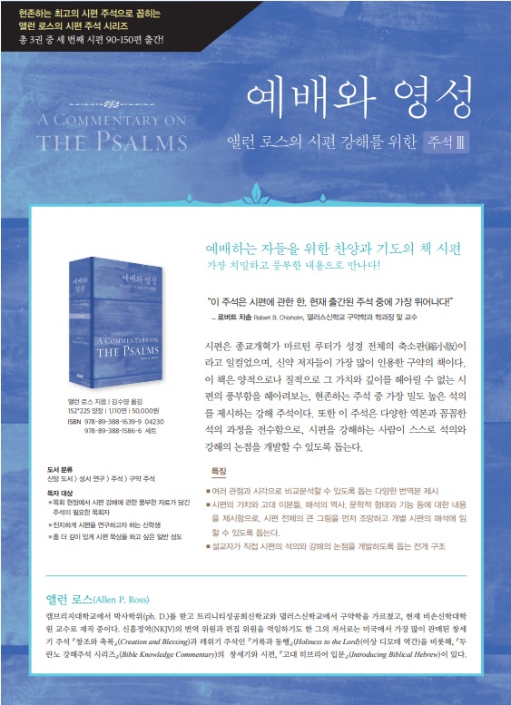 앨런 로스는 수십 년 동안 시편을 공부하고, 가르치며, 설교했다. 그의 연구와 반추한 시간들의 절정인 이 시편 주석은 독자들이 뛰어난 학자에게 기대한 석의적 기술과 신학적 통찰력을 드러내준다. 또한 그는 목회자들을 훈련하는 일에 전문가이기 때문에 목회자들이 주석에서 원하는 것이 무엇인지 누구보다 잘 안다. 그는 이 주석에서 그러한 바를 분명하고 이해하기 쉬운 형태로 전달한다. 이 주석은 시편에 관한 한, 현재 출간된 주석 중에 가장 뛰어나다! - 로버트 치솜 (Robert B. Chisholm, 댈러스신학교 구약학과 학과장 및 교수)