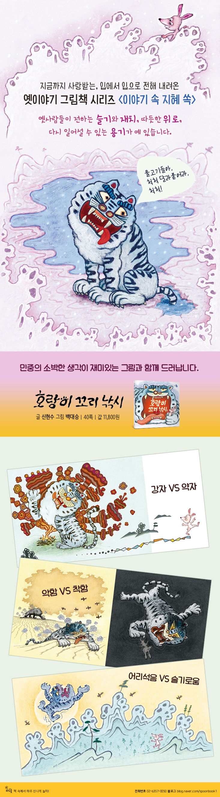 지금까지 사랑받는 이유가 예 있답니다. 동물의 왕, 호랑이의 꼬리가 빠졌다? 깊고 깊은 어느 산속에 꼬리 빠진 호랑이가 씩씩거리며 돌아다닌다는 이야기를 들어 보았나요? 도대체 동물의 왕 호랑이의 꼬리가 어쩌다 빠져 버렸을까요? 자, 시간을 조금 더 거슬러 올라가 보아요. 옛날 옛날 어느 산속에 호랑이가 살고 있어요. 하루는 호랑이가 먹을 것을 찾아 나섰다가 토끼를 딱 만났지 뭐예요. 바로 이 토끼가 호랑이의 운명을 홀라당 바꿔놓게 됩니다. 어떻게요? 한 번은 구운 차돌로, 또 한 번은 불타는 억새밭으로 말이지요. 두 번이나 토끼에게 속은 가여운 호랑이 앞에 다시 한 번 운명처럼 토끼가 나타나요. 그리고 어떤 일이 벌어졌냐고요? 그 재미있는 이야기가 지금부터 펼쳐지니 모두 귀 기울여 보세요! 〈이야기 속 지혜 쏙〉 시리즈 옛사람들은 이야기를 통해 오늘을 사는 우리에게 무엇을 말하고 싶었을까요? 그 안에는 슬기와 재치, 따듯한 위로, 다시 일어설 수 있는 용기 등 옛사람들이 세상을 살아가던 지혜가 숨어 있지요. 그럼 이제 〈이야기 속 지혜 쏙〉에 담긴 옛사람들의 이야기에 한번 귀를 기울여 볼까요? |