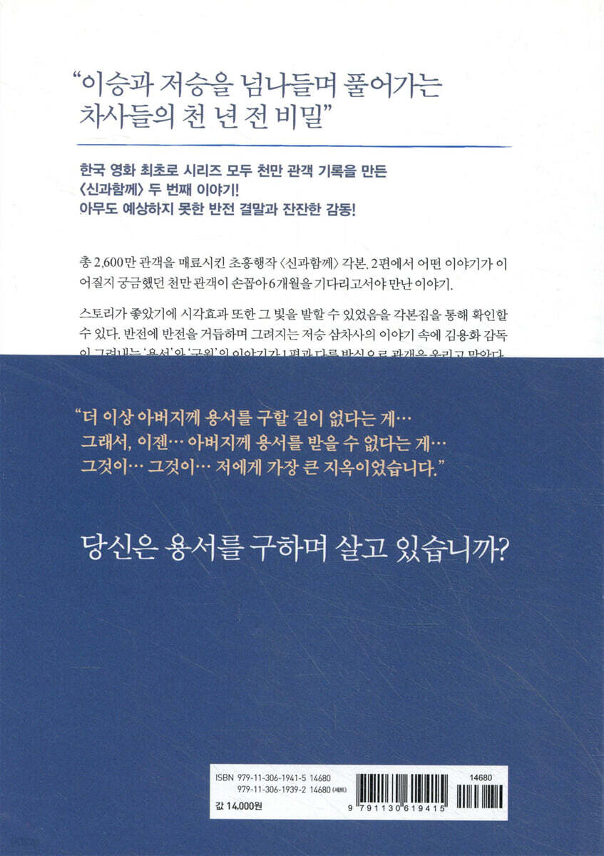 [신과함께]를 본 관객 중에는 시각적으로 화려한 영화로 기억하고, CG 기술에 대한 언급을 주로 하는 분도 있었다. 하지만 [신과함께]는 치밀한 서사로 구성돼 있다. 서사의 큰 줄기는, 영화를 본 분은 이미 알아차렸겠지만, ‘용서’와 ‘구원’이다. 원작을 처음 봤을 때부터 헤어나올 수 없었던 두 단어이다. 우리가 살면서 할 수 있는 가장 고귀하고 어려운 일이라고 생각하는 두 가지가 영화를 통해 관객의 마음을 울리길 원했다. 그래서 [신과함께] 각본 작업을 할 때 관객이 2부의 이야기를 잘 받아들일 수 있도록 1부에서는 [신과함께]의 캐릭터와 세계관을 충실하게 표현하려고 노력했다. 2부를 위해 1부를 만들었다고 생각해도 무방하다. --- p.4~5 「작가의 말」 중에서 검은색 무지의 화면에, “귀인(貴人)이라 함은 항상 남을 먼저 돕고 배려하 정의로운 삶을 살았던 망자이거나, 자신도 이유를 알지 못하는 죽음을 당해 천수를 누리지 못한 울한 망자를 일컫는다”_ 염라대왕 --- p.19 「49번째 귀인」 중에서 현동의 집 방 안. 소멸 직전 밀언에 대해 이야기하는 성주. 성주: (V.O.) 이해가 안 될 때… 모든 걸 거꾸로 읽고, 거꾸로 생각해 봐. --- p.224 「진실」 중에서 염라대왕: 그렇게 후회하면서 지낸 것이 지옥 같더냐… 그 천 년이… 너에겐 진정 지옥이었는지… 묻고 있다… 강 림: (눈물을 떨구며 고개를 가로젓는다) 아닙니다… 저에겐… 더이상 아버지께 용서를 구할 길이 없다는 게…그래서, 이젠… 아버지께 용서를 받을 수 없다는 게… 그것이… 그것이… 저에게 가장 큰 지옥이었습니다. --- p.255 「고백」 중에서 |