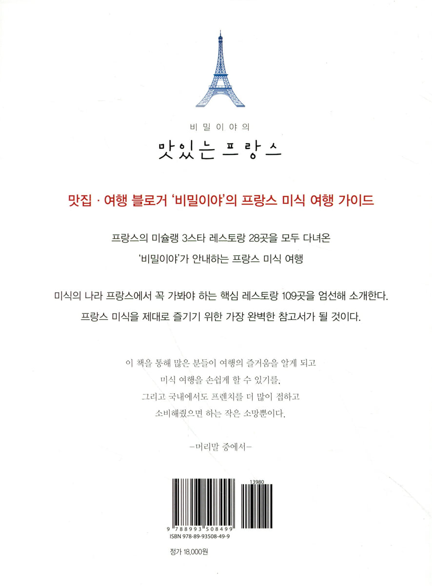 2004년 처음 프랑스를 다녀오고 2006년 나에게는 첫 미슐랭 3스타인 파리의 알랭 뒤카스 오 플라자 아테네를 경험하고 난 뒤 해외 파인 다이닝에 대한 욕구가 무럭무럭 샘솟았던 것 같다. 프랑스는 2004년부터 지금까지 열네 번을 다녀왔는데 실질적으로 레스토랑을 찾아 돌아다닌 것은 2011년부터다. 2011년 가족들과 여행을 하면서 온 가족이 다이닝의 즐거움을 알았고 2013년 부모님까지 모시고 간 파리 여행의 테마가 레스토랑이었을 정도니까. 이후 좀 더 다양한 경험을 해보고 싶다는 욕심에 레스토랑만 찾아다니는 프랑스 미식 여행을 여덟 번 더 다녔다. 돌아보면 『맛있는 스페인』을 쓴 작년 이후에 뭔가 약간 나도 모르게 집착을 한 느낌이다. 2017년 기준으로 이탈리아와 스페인의 미슐랭 3스타를 다 가보고, 막상 프랑스에서도 안 가본 미슐랭 3스타가 다섯 곳 남짓 남다 보니 괜한 욕심이 생겨 올해는 억지로 두 번의 여행을 통해 결국 28개의 프랑스 미슐랭 3스타를 다 방문했다. 막상 끝나고 나니 ‘뭐 하러 그랬지’ 하는 허탈한 마음도 든다. 자타공인 미식의 종주국이자 최고의 미식을 즐길 수 있는 프랑스는 사실 이탈리아나 스페인과 다르게 대부분의 고급 레스토랑이 (파리를 제외하면) 대도시나 주요 관광지에서 멀리 떨어져 있어 찾아가는 길도 쉽지 않고 영업하는 날도 많지 않아 매번 속으로 욕을 하며 다녔던 것이 기억에 남는다. 회사를 그만두고 잠시 쉬는 동안 책 한 권 내자고 생각했던 것이 벌써 네 권째가 되었다. 원래 이렇게까지 할 생각은 없었는데 이제 뭔가 숙제를 다 한 듯 홀가분한 느낌이다. 요리사도 아니고, 음식 관련된 직업을 가진 것도 아닌데 왜 이렇게까지 다니느냐는 질문을 받는다. 사실 처음에는 그냥 그 레스토랑과 본고장의 수준 높은 음식이 궁금했고, 내가 좋아하는 음식의 원형과 극한을 맛보고 기준을 잡고 싶었다. 본의 아니게 어떤 음식 혹은 레스토랑에 대한 이야기를 하게 될 때 내 주관이 들어갈 수밖에 없는데 그 주관에 조금이나마 정당성을 부여하고 싶은 마음도 있었다. 요리를 전공하고 직업으로 삼지 않은 이상 그나마 내가 객관적인 정량화된 수치로 내세울 수 있는 것은 남들이 따라올 수 없는 압도적인 경험밖에 없다고 생각했다. 그렇게 다니다 보니 재미도 있었고 그 수가 늘어나니 나름 욕심도 생겼다. 이제 거의 마지막까지 오니 욕심도 줄어들고 뭔가 재미도 덜하니 이제 사명감만 남았다고 할까. 이왕 다녀온 거 정리해서 뭔가 결과물을 손에 쥐고 싶은 욕심에 책을 내게 되었던 것 같다. 매번 가이드책을 들고 여행을 다닐 때마다 전혀 참고가 되지 않는 레스토랑 정보를 보면서 ‘우리나라에 이런 책 하나쯤 있어야 되지 않나’ 하는 생각을 했는데 그걸 내가 쓰게 될 줄이이야···. 누군가가 프랑스 책을 쓰는 데 페이지당 얼마가 들었냐고 물어봤다. 기존의 책보다 레스토랑 숫자도 훨씬 많고 가격도 비싸니, 그동안 수지 타산이 전혀 맞지 않는 노동을 한 것 같다. 그저 이 책을 통해 많은 분들이 여행의 즐거움을 알게 되고 미식 여행을 손쉽게 할 수 있기를, 그리고 국내에서도 프렌치를 더 많이 접하고 소비해줬으면 하는 작은 소망뿐이다. 이 책을 쓰면서 프랑스어를 전혀 몰라 고생을 많이 했다. 악상을 붙이는 것도 모르겠고 발음도 하나도 몰라 후배 예율이가 많이 도와줬다. 늘 여행을 같이 다니는 친구들과 함께 음식을 즐기는 형님, 누님, 동생들의 응원과 지원도 내게 늘 큰 힘이다. 다른 때보다 방대한 분량의 원고를 정리하느라 고생한 BR미디어의 신혜진 에디터와 김진원 에디터, 권혁민 디자이너, 그리고 늘 든든한 누님 김은조 편집장님께도 감사의 인사를 전한다. 내가 이렇게 프랑스 음식을 접하고 즐기게 된 데에는 우리나라의 척박한 환경 속에서도 열심히 프랑스 음식을 소개하고 접하게 해준 많은 셰프님들이 계신다. 그분들의 열정과 노력 속에 우리나라의 프렌치도 10년 전과 비교할 수 없을 정도로 발전했다. 처음 프렌치라는 것을 접했던 라미띠에의 장명식 셰프, 20년 가까이 한 자리를 지키고 계신 팔레드고몽의 서현민 사장과 이재훈 셰프, 늘 지나친 애정을 보이는 루이쌍끄의 이유석 셰프, 강남에서 술 생각이 나면 가장 먼저 떠오르는 레스쁘아뒤이부 임기학 셰프와 ‘최애 레스토랑’인 톡톡의 김대천 셰프가 우선 떠오른다. 멋진 공간과 전망에 맞는 음식을 만들어주시는 다이닝인스페이스의 노진성 셰프, 그릇 성애자 오프레 이지원 셰프, 푸근한 형님 같은 비스트로드 욘트빌의 타미리 셰프, 우리나라에 네오 비스트로를 소개한 제로컴플렉스의 이충후 셰프, 최고의 가성비 프렌치인 파씨오네의 이방원 셰프, 그리고 그랑아무르의 이형준 셰프와 뀌숑82의 김영원 셰프, 여성이기에 더 돋보이는 더 그린테이블의 김은희 셰프, 꼼모아의 김모아 셰프 등···. 이분들 덕분에 나도 여기까지 올 수 있었던 것 같다. 마지막으로, 부모님 입장에서 이해할 수 없는 길만 고집하는 아들을 항상 지지해주시는, (항상인지 사실 잘 모르겠지만) 그리고 프랑스로 모시고 간 여행에서도 아들 따라 괜히 비싼 밥 드시고 사주시느라 고생하신 부모님