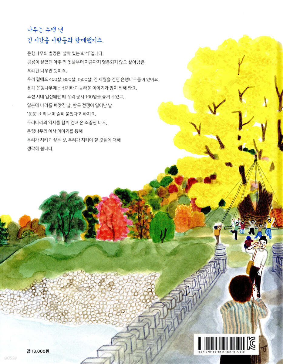 지켜야 할 것은 무엇인가요?” 역사, 추억, 생명과 평화…… 한 그루 나무에 깃든 소중한 것들을 지켜 낸 평범한 사람들의 감동 실화! 700년 긴긴 세월을 사람들과 함께한 안동 용계리 은행나무, 나무를 거쳐 간 수많은 사람들, 그 짧지 않은 이야기가 현재에 던지는 울림 있는 물음 은행나무의 별명은 ‘살아있는 화석’입니다. 공룡이 살았던 아주 옛날부터 지금까지 멸종되지 않고 살아남은 오래된 나무란 뜻이죠. 용계 은행나무에는 신기하고 놀라운 이야기가 많이 전해 와요. 우리나라의 역사를 함께 견뎌 온 소중한 나무, 은행나무의 이사 이야기를 통해 우리가 지키고 싶은 것, 우리가 지켜야 할 것들에 대해 생각해 봅니다. 용계리 마을 아이들은 모였다 하면 이사 이야기를 합니다. 어른도 한숨을 푹푹 쉬는 건 마찬가지예요. 곧 큰 댐이 들어서면 서울 아파트 높이만큼 물이 차게 되거든요. 집과 동네는 물론, 오랫동안 마을을 지켜 준 나무도 잠겨 버린대요. 무슨 나무냐고요? ‘할배나무’요! 700년 동안 마을 사람들과 함께한 은행나무이지요. 나라에 슬픈 일이 일어났을 때에는 함께 웅웅 소리 내어 울었다던 그 나무요. 할배나무는 아직도 마을 사람들과 함께해요. 계절이 바뀔 때마다 멋진 옷으로 갈아입고 아이들의 재미난 놀이터가 되어 주고요. 어른들은 할배나무 주위에 둘러앉아 시시콜콜 사는 이야기를 나누지요. 하루아침에 삶의 터전을 뒤로하고 떠나야 할 마을 사람들이지만 우리 집과 학교와 땅은 지키지 못해도 할배나무만은 살리자고 결심합니다. 아이들과 어른들은 나무를 이사시키려고 하지만 옮기기에는 너무 무겁고 비용도 많이 들어서 모두가 안 된다고만 해요. 댐 공사일은 다가오고, 어쩌죠? 소중한 나무를 이대로 포기해야만 할까요? 맑고 투명하고 화사한 색감으로 더 친근하게 다가오는 우리 이웃들! 윤봉선 작가는 섬세한 생태 세밀화 작업부터 서정적인 그림책, 맑고 아기자기한 동화와 아동 논픽션까지, 일러스트의 다양한 영역을 넘나들며 탁월한 솜씨를 보여 줍니다. 이 작품에서는 평범한 사람들과 한 그루 나무의 감동적인 이야기를 아주 투명한 수채화로 맑은 감성으로 그대로 살려 냈습니다. 커다란 은행나무에 흐드러진 잎들의 섬세한 농담 표현, 시원한 여백 등이 시선을 사로잡습니다. 특히 용계리와 개인적인 인연이 있었던 덕분에 은행나무 주변의 풍경을 누구보다 생생하게 표현해 낼 수 있었습니다. 작은 마을에서의 생활, 자연과 어울린 유년 시절의 경험 등도 잘 녹아 있지요. 이렇게 큰 애정으로 작품을 대한 덕분인지 작품 속에 이름 없이 등장하는 인물들 또한 저마다 특별해 보이는 무언가를 가지고 있습니다. 정성껏 표현한 현실감 넘치는 옷 무늬나, 각각 다른 색으로 참신하게 표현된 머리카락 색 등이 이야기에 생동감을 불어넣습니다.수백 년 전 역사부터 바로 우리의 앞세대까지,《은행나무의 이사》는 이미 흘러 버린 아주 긴긴 역사를 품고 있지만, 동시에 오늘날 수많은 ‘할배나무’들의 현실이자 우리가 추구해야 할 따뜻한 휴머니즘의 방향입니다. |