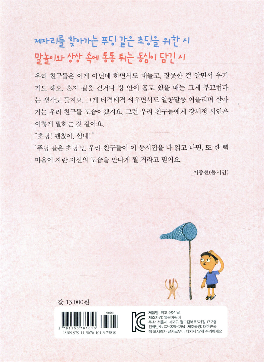 제1부. 빵 터지는 저녁 안 통해 10 빵 터지는 저녁 12 이놈의 인기 14 튀고 싶은 날 15 티격태격 16 1학년 서율이의 공공연한 비밀 17 완전 범죄 18 앙큼한 쥐 한 마리 20 이 사람은 22 옆구리 안 터져요 24 뽀뽀를 부탁해 26 신호 28 부탁할게 30 액정 깨진 날 32 제2부. 대나무야 스밈 36 공벌레 1 38 공벌레 2 39 대나무야 40 공벌레 3 42 방울토마토 43 초롱아귀 44 주먹 한 방 46 놀자 놀자 47 자전거 48 흔들리는 웃음 49 때가 왔대 50 연밥 52 김 54 제3부. 푸딩 같은 초딩 올챙이 문장 부호 58 오렌지 60 수리수리 척척 수리 61 돌놈 62 사이다 63 푸딩 64 사라지는 건 66 가글링 67 살구나무 68 팽이 70 줌 72 타박타박 74 야옹 75 밥알은 가락을 타고 76 식구 77 눈 맞은 홍시 78 호미 80 제4부. 뭐 어떠냐고 너랑 나랑 84 사랑은 몸살 86 다짐 87 바다 눈 88 뭐 어떠냐고 90 퇴원 91 숲 92 울음 공장 94 지구의 울음 95 모피 코트 96 꼬리 치기 98 낯선 집 100 코발트 102 어린이와 함께 읽는 시 해설 초딩! 괜찮아, 힘내! 이중현_동시인 104 |