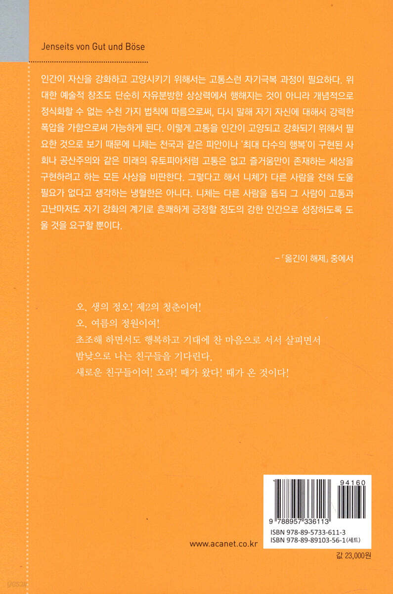 유럽의 병든 문화를 극복하고 건강한 문화를 구축하려는 혁명적인 책 마지막으로 니체는 선악을 서로 대립하는 것으로 보는 전통적인 선악 개념에 대해서 선은 악을 필요로 한다고 본다. 전통적인 선악 개념에서는 고통과 고난을 제거되어야 할 악으로 간주하면서 고통과 고난을 제거하는 것을 선으로 간주한다. 이에 반해 니체는 고통과 고난을 우리 자신을 강화하고 고양시킬 수 있는 계기가 될 수 있다고 본다. 따라서 니체는 다른 인간들에 대한 동정심에 넘쳐서 그 사람들을 고통과 고난에서 구해주는 사람을 선인으로 보지 않고 오히려 마음이 약한 사람들로 본다. 이러한 사람들은 고통받는 타인의 모습을 보면서 자기도 그런 고통을 받으면 얼마나 힘들까를 생각한다. 이런 의미에서 고통받는 사람에 대한 연민은 사실은 자기연민이다. 다른 사람이 겪고 있는 고통을 과거에 겪었거나 혹은 미래에 겪게 될 자기 자신에 대해서 연민을 느끼는 것이다. 나약한 자들이 쉽게 고통을 느끼면서 자신과 타인에게 동정을 느끼는 것과 달리 강한 자들은 고통을 쉽게 느끼지 못한다. 강한 자들은 타인의 고통을 보면서도 그 사람이 자신과 마찬가지로 고통을 크게 느끼지 않을 것이며 또한 그것을 스스로의 힘으로 충분히 극복할 수 있다고 생각한다. 바로 이 점이 강한 자가 타인들에 대해서 동정심을 갖기 어려운 이유다. 니체는 유럽에 동정의 도덕이 확산되고 있는 것은 결국 사람들이 유약해졌기 때문이라고 생각한다. 인간이 자신을 강화하고 고양시키기 위해서는 고통스런 자기극복 과정이 필요하다. 위대한 예술적 창조도 단순히 자유분방한 상상력에서 행해지는 것이 아니라 개념적으로 정식화할 수 없는 수천 가지 법칙에 따름으로써, 다시 말해 자기 자신에 대해서 강력한 폭압을 가함으로써 가능하게 된다. 이렇게 고통을 인간이 고양되고 강화되기 위해서 필요한 것으로 보기 때문에 니체는 천국과 같은 피안이나 ‘최대 다수의 행복’이 구현된 사회나 공산주의와 같은 미래의 유토피아처럼 고통은 없고 즐거움만이 존재하는 세상을 구현하려고 하는 모든 사상을 비판한다. 그렇다고 해서 니체가 다른 사람을 전혀 도울 필요가 없다고 생각하는 냉혈한은 아니다. 니체는 다른 사람을 돕되 그 사람이 고통과 고난마저도 자기 강화의 계기로 흔쾌하게 긍정할 정도의 강한 인간으로 성장하도록 도울 것을 요구할 뿐이다. 『선악의 저편』은 이와 같이 서양의 전통문화를 규정해온 모든 종류의 이원론적인 사고방식을 비판함으로써 유럽의 병든 문화를 극복하고 건강한 문화를 구축하려는 혁명적인 책이다. 이러한 혁명적인 성격과 예리하면서도 정치한 논리 때문에 『선악의 저편』은 철학을 비롯한 인문학뿐 아니라 사회과학 그리고 문학을 비롯한 예술에서도 지속적으로 큰 영향을 끼쳐왔다. 그 결과 이 책은 니체의 저작들 중에서 『차라투스트라는 이렇게 말했다』 못지않게 고전으로서의 지위를 차지하고 있다. 역자인 박찬국 서울대 철학과 교수는 이미 니체의 『비극의 탄생』, 『우상의 황혼』, 『안티크리스트』도 니체의 글 중에서 모호한 부분이나 니체 사상에 대한 전반적인 이해가 필요한 부분에 대해서는 역주의 형태로 상세한 해설을 덧붙이고, 해제를 더해 출간한 바 있다. 이 번역서들에 대해 많은 독자들의 호의적인 평가가 있었다. |