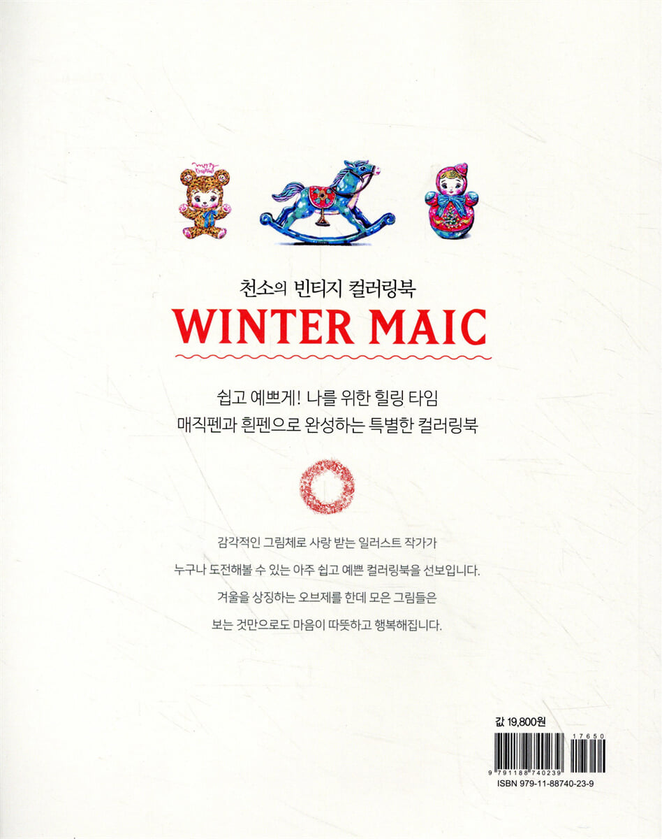 이 책에서 사용한 재료 HOW TO Level 1. 솔방울 오너먼트 / 반짝이는 가지 하나 / 레드베리 / 핸드메이드 퀼팅 버드 / 빈티지 플로럴 타월 / 브라이트 진저쿠키 / 설레는 이브의 목마 / 한겨울의 티타임 / 컵케이크 / 솔방울 트리와 눈사람 Level 2. 컬러풀 컵케이크 / 아기자기 가지 트리 / 자연에서 온 오너먼트 / 레트로 오뚝이 / 홀리데이 리스 / 마음을 담은 선물 / 선반에 찾아온 겨울 / 너를 위한 곰 인형 / 문 앞에 놓인 꽃다발 / 진저쿠키 하우스 Level 3. 솜장식 러스틱 꽃병 / 눈 내리는 밤 / 신비로운 순록 / 스낵 세트 / 숲에서 온 오너먼트 상자 / 앤티크 재봉틀 / 보태니컬 퀼트 블랭킷 / 레드베리 패턴 / 진저쿠키 패턴 / 블루베리 패턴 부록(원화 스케치) Level 1. 솔방울 오너먼트 / 반짝이는 가지 하나 / 레드베리 / 핸드메이드 퀼팅 버드 / 빈티지 플로럴 타월 / 브라이트 진저쿠키 / 설레는 이브의 목마 / 한겨울의 티타임 / 컵케이크 / 솔방울 트리와 눈사람 Level 2. 컬러풀 컵케이크 / 아기자기 가지 트리 / 자연에서 온 오너먼트 / 레트로 오뚝이 / 홀리데이 리스 / 마음을 담은 선물 / 선반에 찾아온 겨울 / 너를 위한 곰 인형 / 문 앞에 놓인 꽃다발 / 진저쿠키 하우스 Level 3. 솜장식 러스틱 꽃병 / 눈 내리는 밤 / 신비로운 순록 / 스낵 세트 / 숲에서 온 오너먼트 상자 / 앤티크 재봉틀 / 보태니컬 퀼트 블랭킷 / 레드베리 패턴 / 진저쿠키 패턴 / 블루베리 패턴 |