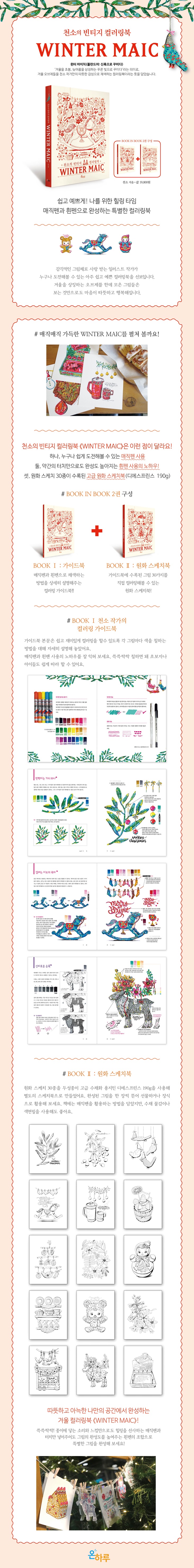 기존의 수채 물감이나 색연필은 특별한 스킬이 필요하지만 이 책에서 사용한 매직펜과 흰펜은 남녀노소 누구나 쉽게 도전해볼 수 있는 것이 가장 큰 특징입니다. 평소 그림을 어렵게만 생각했던 사람도 직접 노하우를 전수받는 느낌이 들도록 채색 방법을 세세히 설명해 두었습니다. |