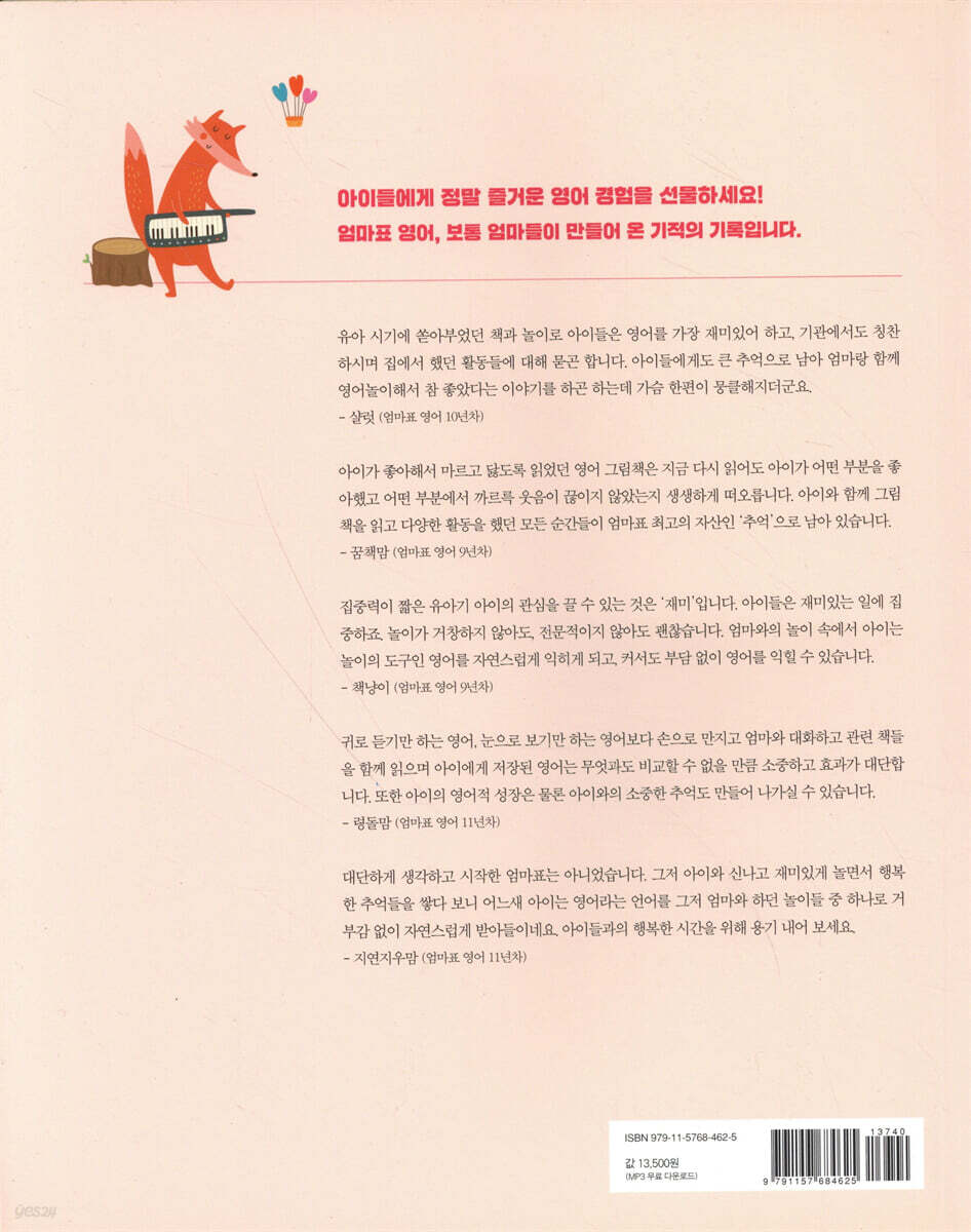 엄마표 선배맘 5인의 추천평 모든 아이들이 좋아하는 영어동화책 이 책의 특징 및 활용법 Part1. 영어가 만만해지는 일상놀이 01. 밀가루 엑스레이 [신체] 02. 휴지심 가족나무 [가족] 03. 둥둥둥 깡통 드럼 [악기] 04. 빨래를 널어요 [옷] 05. 종이컵 손목시계 [시간] 06. 반짝반짝 소금 무지개 [색깔] 07. 딩가딩가 접시 기타 [노래] 08. 수수깡 이 닦기 [양치질] 09. 휴지심 검은 고양이 [애완동물] 10. 쉐이빙크림 구름비 [날씨] 11. 병뚜껑 청진기 [질병] 12. 한지 요리사 모자 [요리] 13. 발바닥 소방차 [교통수단] 14. 우유팩 스쿨버스 [버스] 15. 통통통 접시 보트 [바다] 16. 셀로판지 신호등 [교통신호] 17. 우리 동네 모형 [동네] Part2. 하루하루가 특별해지는 계절&기념일놀이 18. 데칼코마니 나비 [봄] 19. 시원한 수박 부채 [여름] 20. 나만의 투명 비치백 [여름] 21. 울긋불긋 낙엽 인형 [가을] 22. 눈 오는 겨울 풍경 [겨울] 23. 케이크 팝업카드 [생일] 24. 파티용 하트 머리띠 [생일파티] 25. 손도장 발렌타인 카드 [발렌타인데이] 26. 부활절 에그홀더 [부활절] 27. 초간단 호박등 [할로윈] 28. 할로윈 유령 피자 [할로윈] 29. 손바닥 칠면조 [추수감사절] 30. 손바닥 산타클로스 [크리스마스] 31. 휴지심 루돌프 [크리스마스] 32. 아이스크림 막대 트리 [크리스마스] Part3. 놀면서 똑똑해지는 두뇌발달 학습놀이 33. 못난이 과일 얼굴 [과일과 채소] 34. 전단지 미니 냉장고 [음식 분류] 35. 상자 계산대 놀이 [가격 계산] 36. 내 맘대로 샌드위치 [요리와 분수] 37. 알록달록 색깔 게임 [색의 혼합] 38. 조물조물 두부 뱀 [동물] 39. 요거트 식물 그림 [식물] 40. 숨은 도형을 찾아라 [도형] 41. 스티로폼 지오보드 [도형] 42. 꼬마 인디언 머리띠 [패턴] 43. 숫자 파리를 잡아라 [숫자] 44. 동서남북 방향게임 [방향] 45. 변신하는 도화지 달님 [달의 이름] 46. 두둥실 크림 보름달 [보름달] 47. 태양계 행성 여행 [태양계] 48. 코끼리 코를 불어라 [공기] 49. 촛불로 물 올리기 [공기] 50. 나의 몸 속 탐험 [소화기관] 51. 부글부글 화산 폭발 [화산] Part4. 눈이 반짝 귀가 쫑긋해지는 동요놀이&책놀이 52. 반짝반짝 작은 별 [동요놀이] 53. 소나기 레인스틱 [동요놀이] 54. 오르락 내리락 거미인형 [동요놀이] 55. 동물 볼링게임 [동요놀이] 56. ABC 알파벳 나무 [책놀이] 57. 사계절 나무 병풍 [책놀이] 58. 키친타월 나비 [책놀이] 59. 동물 수수께끼 [책놀이] 60. 손가락 우유 그림 [책놀이] 61. 물고기야 도망가 [책놀이] 62. 초록색 양을 찾아라 [책놀이] 63. 알록달록 셀로판 생쥐 [책놀이] 64. 아기돼지 삼형제의 집 [책놀이] 65. 백설공주의 마법거울 [책놀이] 66. 잭의 알파벳 콩나무 [책놀이] Part5. 영어의 기초를 탄탄히 잡아주는 알파벳&파닉스놀이 67. 신데렐라 펠트지 신발 [책놀이] 68. CD로 만든 사자와 생쥐 [책놀이] 69. 알파벳 낚시놀이 [알파벳] 70. 알파벳 매칭게임 [알파벳] 71. 액션 주사위 놀이 [동사] 72. 감정 몬스터 가면 [형용사] 73. 반대말 발바닥 [형용사] 74. 사이트 워드 메모리게임 [사이트 워드] 75. 사이트 워드 보드게임 [사이트 워드] 76. 파닉스 나무 만들기 [파닉스] 77. 종이컵 파닉스 꽃밭 [파닉스] 78. 파닉스 단어벽 [파닉스] 79. 라임 방 꾸미기 [라임] 80. 나만의 미니 라임북 [라임] 권말 양면 월차트 - 영어놀이별 추천도서 리스트 |