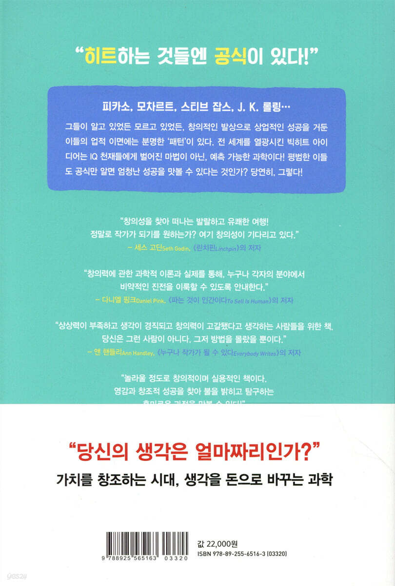 PART 1 크리에이티브에 관한 거짓말 01 꿈이 만든 작품 원곡을 찾아서 | 예스터데이로 가는 길 02 거짓말 배우기 사람들이 원하는 것 | 잘못된 패턴 | 최적의 긴장감 03 천재의 탄생 신화 창의성의 역사 | 중세를 찾아서 | 바티칸과 색주가 | 괴물과 사람 | 흰개미들의 IQ 04 재능이란 무엇인가? 그림 그리기 13년 | 전문가로 가는 길 | 예술가의 천국 | 목적을 가지는 것 | 두뇌의 가소성 05 누가 천재인가? 천재 만들기 프로젝트 | 언덕에서 06 크리에이티브 커브 노출된 감정 | 인종차별에 대한 학습 잠재력 | 사랑은 천천히 죽인다 | 색다름이라는 보너스 | 크리에이티브 커브 | 냉혹한 현실 | 적을수록 좋을 때 | 유창해지는 과정 | 비틀스에 감춰진 수학 PART 2 돈이 되는 크리에이티브의 법칙 07 제1 법칙 : 소비 운이 좋은 것일까? | 전진을 위한 발판 | 놀라운 원칙 | 디지털 거물 | 교묘함 | ‘아하!’ 순간의 과학 | 라테아트와 두뇌의 처리 과정 | 기초 세우기 08 제2 법칙 : 모방 신데렐라 공식 | 제약의 기원 | 대중음악의 과학 | 리믹스 컬처 | 프랭클린 메소드 | 현대식 응용 09 제3 법칙 : 창의적 공동체 마스터 티처 | 누구에게나 배울 수 있다 | 군집화 | 상충하는 협업자 | 멈추고 협업하고, 들어라 | 모던 뮤즈 | 관점을 향한 경쟁 | 로프트의 놀라운 힘 | 유명 프로모터 | 내부자 vs. 외부자 | 창의적 공동체 | 중요한 여담 10 제4 법칙 : 반복 아이스크림 눈물 | 개념화 | 압축 | 큐레이션 | 피드백 | 영화의 데이터 | 틀 안으로 들어가기 | 위험한 실험 | 대통령의 데이터 | 하이디의 또 다른 직업 에필로그 당신의 패턴 소비와 제약 | 반복, 세계의 창조 | 공동체 | 헤어지는 말 감사의 말 주 |
