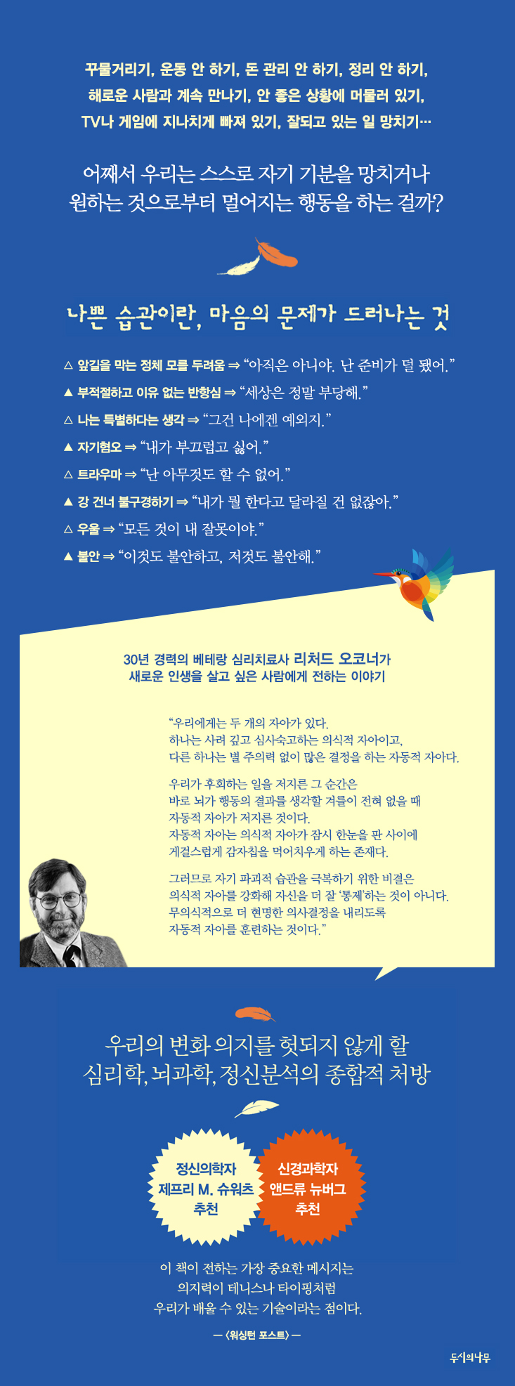 이 책은 독자들이 자신의 나쁜 습관을 이해하고 더 나은 인생을 살 수 있도록 돕는 연장이다. 매우 실용적이고 매력적이면서도 차분하게 어떻게 행동을 변화시키고 삶의 질을 향상시킬 수 있을지를 알려준다. - 제프리 M. 슈워츠 (UCLA 의과대학 정신의학자)