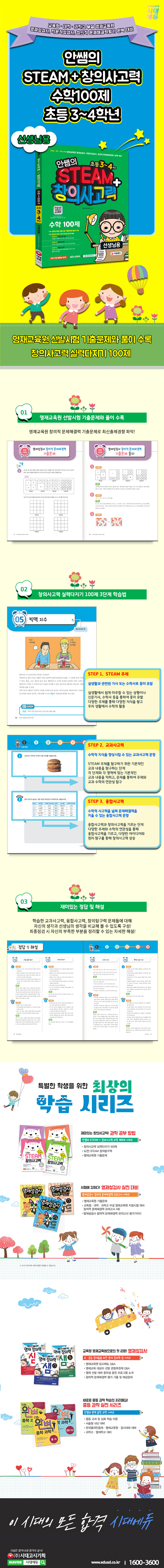 ▶▷창의사고력 실력다지기 100제 3단계 학습 STEP 1. STEAM주제 실생활과 관련된 기사 또는 수학사로 흥미 유발 STEP 2. 교과사고력 수학적 지식을 향상시킬 수 있는 교과사고력 문항 STEP 3. 융합사고력 수학적 사고력을 넓혀 문제해결력을 키울 수 있는 융합사고력 문항 |