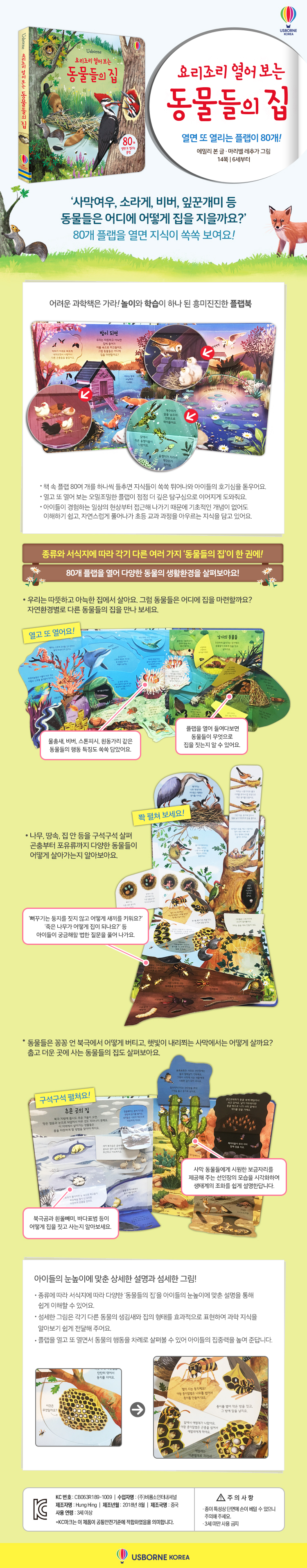 동물들은 어디에 집을 지을까요?’ 80개 플랩을 열면 지식이 쏙쏙 보여요! ◆ 어려운 과학책은 가라! 놀이와 학습이 하나 된 흥미진진한 플랩북 어렵고 딱딱한 과학의 세계, 하지만 조금만 달리 접근하면 엄청나게 흥미롭고 신비한 세계라는 걸 알고 있나요? 놀이와 학습을 접목한 플랩북 「요리조리 열어 보는」 시리즈는 아이들을 흥미진진한 과학의 세계로 안내합니다. 책 속 플랩 80여 개를 하나씩 들추면 지식들이 쏙쏙 튀어나와 아이들의 호기심을 돋우어요. 또한 열면 또 열리는 플랩 속 플랩이 점점 더 깊은 탐구심으로 이어지게 도와주지요. 아이들이 경험하는 일상의 현상부터 접근해 나가기 때문에 기초적인 개념이 없어도 이해하기 쉽고, 자연스럽게 풀어나가 초등 교과 과정을 아우르는 지식을 담고 있어요. ◆ 아이들의 눈높이에 맞춘 상세한 설명과 섬세한 그림 밤이 되면 우리들은 따뜻하고 아늑한 집에서 쉬는데, 동물들은 어디로 갈까요? 박쥐, 흰동가리, 비버, 북극곰, 프레리도그 등 동물들의 집은 아이들의 호기심을 불러일으키는 주제예요. 그런데 가축이 아닌 야생동물의 집은 쉽게 관찰하기 어려워요. 이 책은 아이들의 눈높이에 맞춰 동물들의 집에 대해 알려 줘요. 몸을 따뜻하게 지켜 주고, 연약한 새끼를 키울 수 있는 안전한 곳에 집을 마련하는 동물들의 삶에 대해서 이해할 수 있게 가르쳐 주지요. 깃털이나 낙엽, 풀, 나뭇가지, 모래 등 여러 가지 자연물을 모아서 집을 짓거나 땅이나 나무를 파서 보금자리를 마련하는 다양한 생활 방식을 차근차근 보여 주지요. 플랩 겉과 속에 담긴 풍성한 그림과 친절한 설명이 동물과 자연에 대한 호기심을 키워 주고 과학 지식을 얻을 수 있도록 돕는답니다. |