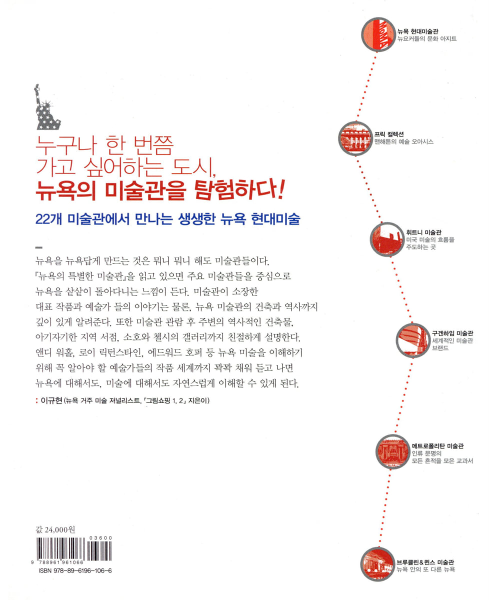 1. 뉴요커들의 문화 아지트 뉴욕 현대미술관 도심 속 예술 놀이터 차별화된 컬렉션을 추구하다 | 혁신적인 시스템 아래서 시도한 실험 | 다니구치 요시오가 재해석한 현대의 개념 | 전시관 변화와 입장료 인상에 대한 논란 | 새로운 형태의 전시로 돌파구를 마련하다 Art Story 01 뉴욕 건축의 입안자_필립 존슨 뉴욕 현대미술관 둘러보기 Art Story 02 현대미술의 아이콘_앤디 워홀 Art Story 03 인상파의 거장_클로드 모네 뉴욕 현대미술관 컬렉션 하이라이트 뉴욕 예술 산책 01 전통을 드러내다_미국 포크아트 박물관 뉴욕 예술 산책 02 소재가 갖는 가치를 발견하다_아트 &디자인 미술관 뉴욕 예술 산책 03 살아 있는 미술관이자 정보센터_록펠러센터 2. 어른들을 위한 맨해튼의 오아시스 프릭 컬렉션 정숙함과 자유스러움이 공존하다 일상의 고요한 순간을 눈부시게 담아낸 페르메이르 | 부에 대한 끝없는 욕망이 자선과 나눔의 경쟁으로 | 맨해튼 한복판의 조용한 사원 | 편안한 작품들로 컬렉션을 일군 프릭 | 대가들의 작품을 수집한 프릭의 의외성 | 아메리칸 드림으로 일군 부를 사회에 환원하다 Art Story 04 한여름 밤의 축제_뉴욕 미술관 페스티벌 프릭 컬렉션 둘러보기 Art Story 05 여체를 사랑한 빛의 화가_피에르-오귀스트 르누아르 프릭 컬렉션 하이라이트 뉴욕 예술 산책 04 혁신적인 디자인의 보고_쿠퍼-휴잇 국립 디자인 미술관 뉴욕 예술 산책 05 뉴요커들의 지식 창고_모건 도서관&미술관 뉴욕 예술 산책 06 맨해튼의 현관_그랜드 센트럴 터미널 뉴욕 예술 산책 07 미국 건축사를 엿볼 수 있는 야외 전시관_매디슨 스퀘어 3. 미국 미술에 대한 끝없는 애정 휘트니 미술관 미국 현대미술의 중심지 미국 미술의 진원지가 된 휘트니 클럽 | 물리적 공간감을 넘어 심리적 공간감까지 | 유럽 예술을 의식하면서 발전한 미국 현대미술 | 조지아 오키프와 에드워드 호퍼, 그리고 알렉산더 콜더 | 다양하게 변화하는 미국 미술 | 폭넓은 스펙트럼 속에 완성된 다양성 Art Story 06 뉴욕에서 미국이라는 세계를 빚어내다_에드워드 호퍼 Art Story 07 만화 기법의 완성_로이 릭턴스타인 휘트니 미술관 둘러보기 휘트니 미술관 컬렉션 하이라이트 뉴욕 예술 산책 08 새로움, 그 이상의 가치_뉴뮤지엄 뉴욕 예술 산책 09 뉴욕 현대미술의 생생한 현장_첼시 갤러리 뉴욕 예술 산책 10 뉴욕에서 책을 만나다_뉴욕 서점 탐방 4. 미술관의 국제화를 지향하다 솔로몬 R. 구겐하임 미술관 논란 속에 성장한 미술관 빌바오에서의 성공으로 국제화를 이루다 | 확고한 비즈니스 마인드로 성공시킨 전시 | 크렌스의 전격 은퇴 | 미술관 건축의 혁명을 가져온 라이트의 혁신성 | 형식과 기능을 분리하지 않아야 한다 | 창의적 접근으로 완성시킨 화제의 전시들 | 변화하는 환경 속에 새로운 발전상을 모색하다 Art Story 08 동성애라는 금기에 도전하다_로버트 메이플소프 Art Story 09 구겐하임의 성장을 이끌다_바실리 칸딘스키 구겐하임 미술관 둘러보기 솔로몬 R. 구겐하임 미술관 컬렉션 하이라이트 뉴욕 예술 산책 11 독일과 오스트리아 미술의 거점_노이에 갤러리 뉴욕 예술 산책 12 다채로운 캐러비언 예술을 만나다_엘 무세오 델 바리오 뉴욕 예술 산책 13 유대인 역사의 보고_유대인 미술관 뉴욕 예술 산책 14 메이드 인 할렘, 메이드 바이 블랙_할렘 스튜디오 미술관 5. 인류 문명사의 모든 기억을 한 자리에 메트로폴리탄 미술관 예술학 연구와 미술교육 기반을 제공하다 확고한 리더십 위에 완성된 발전안 | 아시아 예술관으로 재확인된 부단한 확장 노력 | 다양한 컬렉션으로 만들어진 특별함 | 대형 전시 기획과 현대미술 컬렉션의 강화 | 패션?사진?설치 예술로 구체화된 컨템퍼러리 관 | 유물반환을 더 나은 국제 교류의 초석으로 삼다 | 양질의 교육 시설과 다양한 공공 프로그램 메트로폴리탄 미술관 둘러보기 Art Story 10 메트로폴리탄 미술관의 최대 후견인_록펠러 일가와 월터 아넨버그 부부 메트로폴리탄 미술관 컬렉션 하이라이트 뉴욕 예술 산책 15 중세 유럽으로 가는 타임머신_클로이스터스 뉴욕 예술 산책 16 뉴욕의 과거를 찾아가는 타임머신_뉴욕 시 박물관 6. 뉴욕 안의 또 다른 뉴욕 브루클린과 퀸스 미술관 미국의 속살을 들여다보다 브루클린 미술관 브루클린 미술관 들여다보기 아프리카ㆍ미국ㆍ아시아 예술관 | 고대 이집트ㆍ유럽ㆍ미국 예술관 에스닉 문화를 즐기다 퀸스 미술관 뉴욕 예술 산책 17 자연스러움이 두드러진 동서양의 교차점_노구치 미술관 뉴욕 예술 산책 18 미국 영상 산업의 보고_무빙 이미지 미술관 뉴욕 예술 산책 19 현대미술의 시험장_PS1 뉴욕 예술 산책 20 다리와 예술이 만나는 곳_브루클린 브리지 부록 간략하게 읽는 뉴욕 예술 70년 400 |