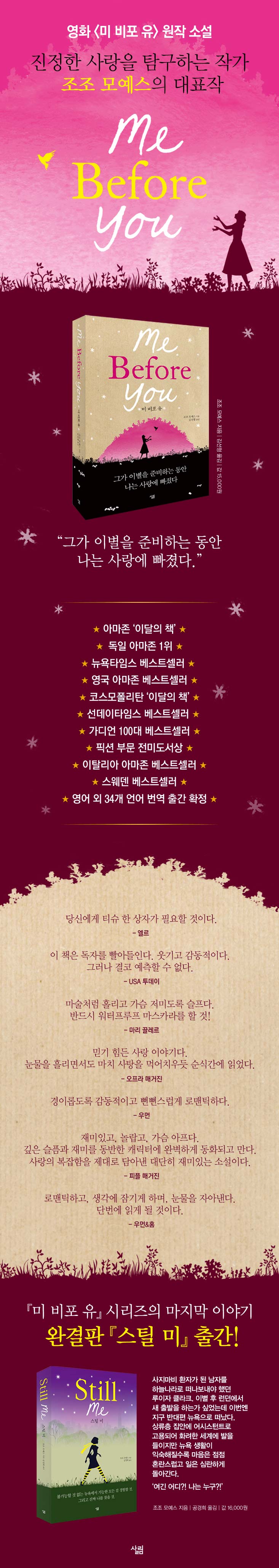 ★아마존 베스트셀러 1위 ★뉴욕타임스 베스트셀러 1위 ★선데이타임스 베스트셀러 1위 ★내셔널북어워드 노미네이트 조조 모예스의 히로인, 『미 비포 유』의 사랑스러운 여주인공 ‘루이자’가 당신에게 꼭 필요한 결말로 돌아왔다 조조 모예스를 로맨스의 여왕으로 만든 『미 비포 유』의 후속작 『스틸 미』가 출간되었다. 영국에서 입소문만으로 최고의 베스트셀러가 된 『미 비포 유』는 미국, 독일, 이탈리아 등 여러 나라에서도 잇따라 호평을 받으며 베스트셀러가 되었으며, 영화 [미 비포 유]의 원작이 된 소설이다. 그 소설의 주인공, 줄무늬 타이츠를 입는 괴상하고 사랑스러운 루이자 클라크가 돌아왔다. 마침내 독자들에게 루이자의 여정 그 마지막 장을 전하게 되었다. 전작에서 존엄사라는 무거운 주제를 대중성 있게 담아냈던 작가는, 남겨진 사람들이 사랑하는 사람을 잃은 슬픔을 감당하는 과정을 이야기한다. 윌이 당부한 대로 대담한 삶을 향해 나아가는 루이자의 성장 과정을 보여준다. 루이자와 윌의 안타까운 사랑에 폭풍눈물 흘렸던 독자는 이제 눈물을 훔치고, 삶을 주도적으로 이끌어가려는 루이자를 응원할 때다. “루이자를 다시 만나서 기뻤다. 내가 루이자를 완전히 새로운 나라, 완전히 새로운 세상, 비밀들로 가득 찬 집으로 밀어 넣었기 때문이다. 평소 유머와 감정이 어우러진 그녀는 스스로 몇 가지 근본적인 질문을 던져야 한다. 특히 그녀가 정말 어느 대륙에 속하는지 말이다.” -조조 모예스(작가의 말) ‘로맨스의 여왕’ 조조 모예스의 귀환 조조 모예스는 현재 전 세계에서 가장 인기 있는 로맨스 작가 중 한 명이다. 44개국 1,500만 명이 넘는 독자가 『미 비포 유』를 읽었다. 섬세하고 사실적인 심리 묘사가 탁월해 한국 독자들에게도 많은 사랑을 받고 있다. 하지만 단순히 조조 모예스를 평범한 로맨스 작가로 치부해서는 안 된다. 조조 모예스의 책을 읽고 나서 ‘내 삶이 바뀌었다’는 독자의 증언이 있을 만큼 조조 모예스는 평범한 로맨스 소설이 줄 수 있는 즐거움을 훌쩍 뛰어넘어 묵직한 감동과 끝없는 울림을 주는 작가다. 『스틸 미』 역시 쉽게 읽히는 문체와 가볍고 톡톡 튀는 대사로 이루어져 있으면서도 ‘삶의 주체성’을 다루고 있다는 점에서 유의미한 작품이다. 루이자가 낯선 환경에서 새로운 사람들을 만나 또 다른 시련을 겪지만, 이제는 자신의 힘으로 삶을 새롭게 시작할 수 있게 된 것처럼 이 책을 읽게 될 독자 또한 앞으로 새로운 삶을 살게 될 것이다. 불가능할 것 없는 뉴욕에서 가능한 모든 걸 경험할 것 그리고 진짜 나를 찾을 것 말이 끄는 마차, 노란 택시, 아찔한 마천루……. 이 소설의 배경은 불가능할 것 없는 뉴욕이다. ‘늘 새로운 볼거리가 있고 항상 짜릿한’ 뉴욕의 풍경을 호기심 왕성한 루이자의 시선으로 따라가다보면, 마치 뉴욕을 여행하고 있는 듯한 시각적인 경험을 하게 된다. 루이자가 고용주로 모시고 있는 고프닉 가족이 뉴욕의 화려함을 대변한다면, 고프닉 가족이 사는 건물의 관리인과 같은 인물은 그 화려함 이면의 평범한 주변인을 상징한다. 우리의 주인공 루이자는 이 양면 모두에 한 발씩 걸친 채 그들에게 닥친 문제를 함께 해결하려 종횡무진이다. 고프닉의 새 부인이 공식 석상에서 주눅 들지 않고 당당하게 얼굴을 비출 수 있도록 옆에서 힘을 실어주고, 폐관 위기에 처한 도서관을 지키기 위한 모임에 건물 관리인 부부를 따라나선다. ‘대담하게 살아, 클라크.’ 윌이 했던 말을 되새기면서 말이다. 이 두껍고 술술 읽히는 책 속에 펼쳐지는 재미있고 낭만적이고 가슴 아픈 이야기가, 그저 재미로만 읽힌다면 여느 책과 다르지 않았을 것이다. 이야기가 전개되는 도중 별안간 질문을 던진다. 루이자가 주변 환경이나 사람에 휘둘리려 할 때마다 스스로에게 이렇게 묻는다. ‘당신은 누구인가?’ ‘어떤 사람이 되어야 하지?’ 이에 대한 답은 독자가 직접 찾아야 할 몫이다. 루이자로부터 새로운 세상에서 대담하게 사는 법을 배웠다면 이제 어디서든 당당한 ‘나’로 살면 될 일이다. |