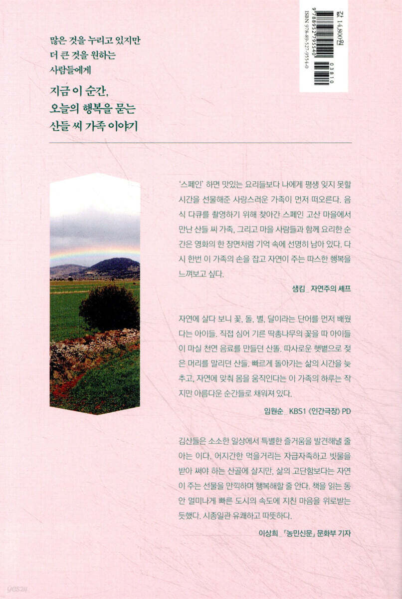 스페인 고산의 느린 삶을 직접 만나고 돌아온 자연주의 셰프 샘킴이 추천한 책! 많은 것을 누리고 있지만 더 큰 것을 원하는 사람들에게 지금 이 순간, 오늘의 행복을 묻는 산들 씨 가족 이야기 이 책의 저자 김산들 씨는 이십 대 중반에 네팔을 여행하던 중, 스페인 사람인 지금의 남편을 만나 새로운 인생 여행을 시작하게 되었다. 한국에서 평범한 직장을 다니던 자신의 운명을 완전히 바꿔 놓은 여행, 그리고 남편과의 운명적인 만남에 대해 산들 씨는 “자전거를 끌던 곱슬곱슬한 머리의 이방인을 만난 순간, 어쩌면 나는 지금의 미래를 신선한 바람처럼 상상했을지도 모르겠다.”고 회상한다. 스페인 고산에 집을 짓고 세 아이를 키우며 생태계를, 자연의 위대함을, 한국과 다른 스페인 문화를 배우며 산 지 어느덧 16년째. 『우리 가족, 숲에서 살기로 했습니다』는 네팔에서 만난 남편과 해발 1200미터 스페인 고산 마을까지 함께 일궈온 인생 여정을 꾸밈없이 솔직하고 담백하게 담아낸 기록이다. “진짜 아름다움은 숨겨진 경우가 많아. 우리가 그걸 보지 못할 뿐이야.” 2004년 봄, 남편의 제안으로 비스타베야(Vistabella)라는 마을에 자리한 신혼집을 처음 보았을 때 산들 씨는 목석처럼 몸이 굳어버렸다. 지붕은 무너진 지 오래였고, 창문 하나가 집이라는 사실을 겨우 말해주는 돌집은 너무 낡아 도저히 사람이 살 곳 같지 않아 보였다. 근사한 나무가 있는 정원과 싱그러운 텃밭 등 낭만적인 전원생활을 상상했던 그에게, 주변에 인가 하나 없는 고산의 외딴 집에서 산다는 건 말도 안 되는 일이었다. 그러나 남편은 차분하게 산들 씨를 설득했다. "좀 척박해 보이지만 적응하면 괜찮을 거야. 진짜 아름다움은 숨겨진 경우가 많아. 우리가 그걸 보지 못할 뿐이야.” 속 깊고 매사에 신중한 남편이 선택한 일이라면 믿고 따라도 좋을 것 같다는 믿음, 그것이 자연 속에 살고 싶다는 마음보다 더 강하게 산들 씨를 이끌었다. 결국 단돈 600만 원에 200년 된 유서 깊은 집을 샀다. 부부는 도시에서 떨어진 고산 마을까지 왕복 5시간을 차로 오가고, 때로는 카라반에서 생활하며 총 7년간 집을 고쳤다. 유기적으로 숨 쉬는 집을 만들기 위해 각종 폐기물이 섞이는 시멘트는 사용하지 않았다. 200년 된 서까래도 썩은 부분을 제거해 활용했고 기와도 가능하면 재사용했다. 전통 방식을 최대한 고수한 집이었다. 고생 끝에 큰 깨달음도 얻었다. “집을 내 손으로 직접 고치고 나서야 나는 집의 완성이 우리의 목적지가 아니었음을 깨달았다. 우리는 모두 그 과정의 어느 순간을 살고 있을 뿐 어느 누구도 완성된 인생을 가져본 적이 없다.” 빠르게 돌아가는 삶의 시계를 늦췄을 때 우리에게 일어나는 일 지금은 부부가 직접 고친 이 집에서 세 딸들과 열여덟 마리의 암탉과 수탉, 칠면조 암수 두 마리, 그리고 수시로 드나드는 고양이들과 함께 정착했다. 온 가족이 고사리를 찾아 숲속을 헤매고 부지런히 채소밭을 가꾸는 소박한 일상이다. 그 삶에는 아이들이 자유로이 뛰어놀고, 세계 3대 진미라는 트러플 버섯을 마음껏 따먹는 자연주의의 낭만이 있는 반면, 태풍이 오면 외딴 집에 고립되고 햇볕이 귀한 겨울이면 전기가 나가버리는, 도시에서는 상상도 하지 못할 엄연한 현실도 있다. 하지만 전기가 나가면 초를 켜고 태풍이 오면 오순도순 난로 앞에 둘러 앉아 이야기를 나누는 시간으로 만들어버리는, 엉뚱할 만큼 긍정적인 이 가족. 이들의 사랑스러운 일상의 면면에는 사람과 자연의 조화로운 공존을 이해하는 넉넉한 시선이 녹아 있어 감동을 준다. 산들 씨 가족은 저수탱크로 빗물을 받아 생활용수를 마련하고, 태양광 전지로 전기를 만든다. 해가 드문 계절이면 인터넷과 티브이가 뚝 꺼지기 일쑤다. 부식토 화장실을 만들어 배설물은 자연에게 돌려준다. 밭에서 수확한 각종 채소를 오래 먹을 수 있게 건조해둔다. 월동 준비를 위해 사계절 내내 틈틈이 장작을 모은다. 고산의 외딴 집에 살며 외로울 때도 있지만 산들 씨는 도자기를 구우며 좋아하는 일에 몰두하는 기쁨을 누린다. 자연과 더불어 사는 생활은 정직하다. 필요한 것이 있으면 시간을 들여 제 손으로 마련한다. 만약 남편의 확신과 스페인 사람들의 따뜻한 인심이 없었다면 산들 씨도 용기를 잃었을지 모른다. 인터넷으로 정보를 찾을 수도 없고, 언제든지 달려와 도와줄 친정 가족도 없이 꼬물거리는 세 아이를 키우느라 혼자 씨름할 때도, 사흘 내내 내린 엄청난 폭우에 지붕에서 물이 뚝뚝 떨어지고 하천이 범람해 고립될 때도, 남편은 든든하게 산들 씨 곁을 지켰다. 집을 고치느라 일손이 필요할 때는 친구와 이웃들이 우르르 몰려와 도와주었고 저녁이면 자축하며 밥과 술과 음악이 있는 신나는 파티를 벌였다. 하루하루 쑥쑥 커가는 나무와 꽃처럼 자연의 품에서 성장하는 세 아이 아이들이 흙바닥에 철퍼덕 앉아 고사리손으로 고양이를 쓰다듬고, 양 똥도 서슴없이 만지작거리는 모습을 보며 우려하는 사람도 있었다. 하지만 산들 씨는 생각이 다르다. “대체 우리는 어디에 살고 있는 것일까? 많은 사람들이 흙이 주는 치유력과 본질의 힘을 완전히 망각한 게 아