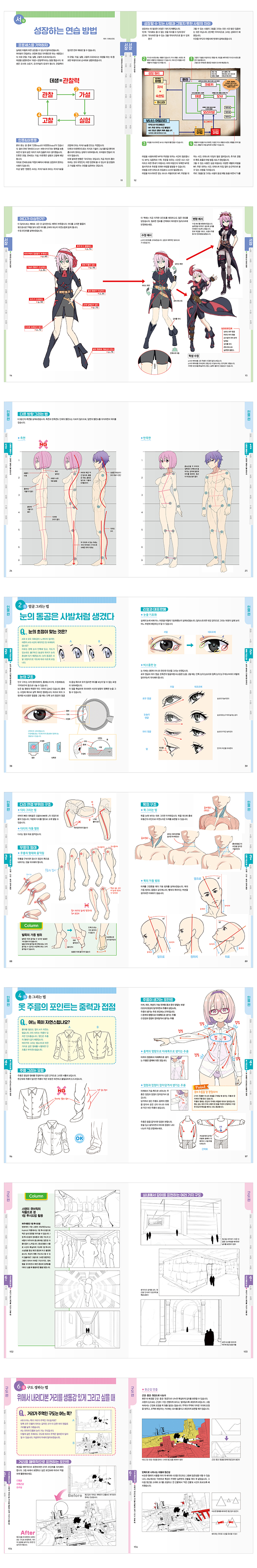 그림을 잘 그리게 된다는 것은 어떤 의미? 성장하는 연습 방법이란? 매력적인 그림을 만들려면 구도를 배우자 「인물 편」 1장 인체의 밸런스 인체의 밸런스를 배우자 굴곡은 변하지 않는다 남자는 사각, 여자는 삼각 연령 차이는 주름뿐만이 아니다 2장 얼굴 그리는 법 밸런스가 좋은 얼굴을 그리려면 눈의 동공은 사발처럼 생겼다 매력적인 눈썹, 속눈썹 그리는 법 입 가운데 있는 빈틈의 정체는? 다양한 코의 형태를 배우자 얼굴이 크게 보이는 것은 후두부가 원인 입체감 있는 얼굴 그리는 요령 불규칙한 느낌으로 자연스러운 머리카락을 그리자 3장 인체 그리는 법 상완과 전완은 같은 길이 손가락은 부채꼴로 붙어 있다 다리의 구조를 배우자 발은 두께가 중요 몸통의 가동 부위는 배뿐 어깨, 다리, 목의 연결 형태를 배우자 포즈는 콘트라포스토를 의식하자 4장 옷 그리는 법 옷 주름의 포인트는 중력과 접점 「구도 편」 5장 포즈를 정하는 법 건강한 포즈는 과장된 자세가 포인트 방어 자세로 얌전함을 표현 강인한 포즈는 직선을 의식 섹시한 포즈는 라인이 중요 6장 구도를 정하는 법 캐릭터의 박력을 연출하고 싶을 때 불안한 분위기를 연출하고 싶을 때 아이돌 사진처럼 귀여움을 연출하고 싶을 때 우뚝 솟은 건축물의 크기를 강조하고 싶을 때 깊이가 있는 실내를 그리고 싶을 때 위에서 내려다본 거리를 생동감 있게 그리고 싶을 때 7장 관계를 표현한다 친밀한 관계를 표현하고 싶을 때 적대 관계를 표현하고 싶을 때 대비로 관계를 표현하고 싶을 때 8장 구도의 NG 예 인물을 가로지르는 배경 관절을 기준으로 잘라낸 구도 캐릭터의 개성을 죽여저리는 구도 |