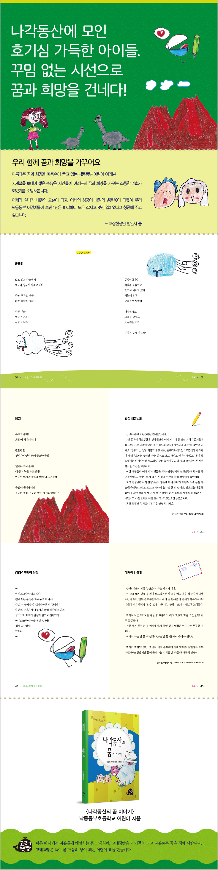 1부 1학년 김용현_ 유치원 선생님 / 이빨 뽑기 / 비가 오면 1학년 정재아_ 나의 꿈 / 물주기 / 어떤 꿈이 좋을까? 1학년 채무진_ 엄마 아빠 / 공룡 / 학교 친구들 2학년 하나은_ 아빠 구두 / 개구리 / 흙탕물 2학년 김나경_ 휴 다행이다 / 우리 가족 / 『나만의 박물관』을 읽고 2학년 박수연_ 팝콘 / 『피 한 방울에는』을 읽고 / 왜 그런지 모르겠다 2부 3학년 김예인_ 운동회 / 용암 / 교장 선생님께 3학년 정자원_ 가을 / 소방차 / 우리 집 강아지 3학년 최수현_ 고양이 / 눈 / 롯데월드 체험학습 4학년 김미현_ 이불 / 아이스크림의 여정 / 미래의 나에게 4학년 정지연_ 엄마의 말 / 도넛 / 윗집 강아지 3부 5학년 최승빈_ 소중한 엄마 / 내 친구의 양말 / 잎싹이의 꿈 6학년 김나연_ 변덕쟁이 시계 / 조선 시대 농민께 / 한여름에 비를 기다리며… 6학년 김지인_ 중학생이 된다는 것은… / 조선 시대 최고의 과학자 정약용 님께 / 하늘의 꽃단장 6학년 윤수연_ 지우개 똥 / 못 말리는 트리 공주 / 조선 시대 후기 농민 아저씨께 |