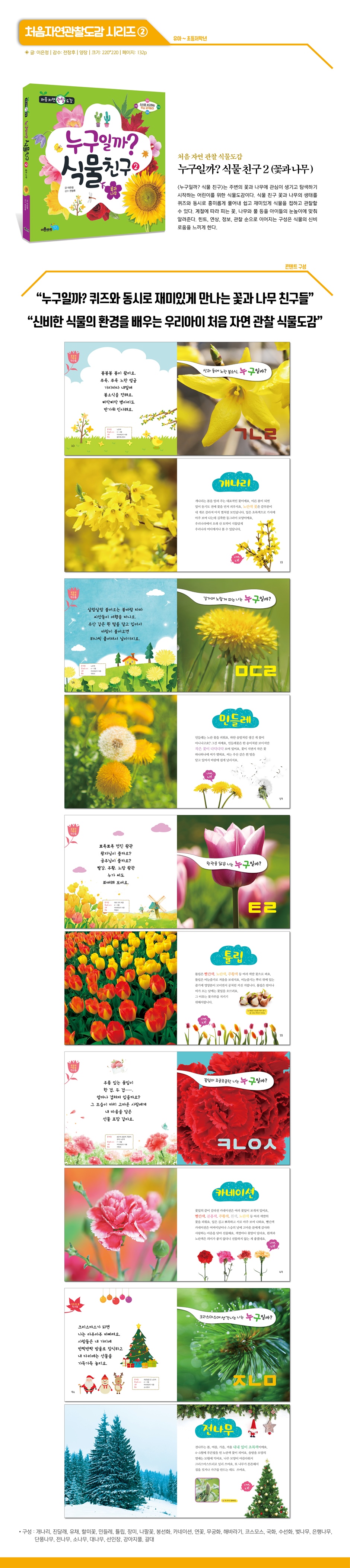 [누구일까? 식물 친구 2 꽃과 나무]는 어린이가 스스로 찾아보는 식물도감이에요. 다양한 퀴즈와 리듬감 있는 동시는 상상력과 호기심을 불러일으킵니다. 꽃과 나무의 부분 사진, 자음 등 여러 힌트를 통해 어떤 식물일지 유추하고 연상하는 과정은 아이들에게 스스로 생각하는 힘을 길러 줍니다. 다양한 정보로 궁금증을 해결해 가면서 성취감을 느끼고, 식물의 신비로움을 알게 됩니다. 식물에 관심이 생기고 자세히 관찰하다 보면 집중력과 표현력도 쑥쑥 자라게 됩니다. [누구일까? 식물 친구 ② 꽃과 나무]는 다양한 식물 놀이 활동으로 구성되어 스스로 사고하는 힘을 길러 주는 자연 관찰 놀이책입니다. 감수의 글 [누구일까? 식물 친구]는 시중의 다른 어린이 그림책이나 식물 관련 백과사전들과는 다른 재미를 선사할 거예요. 이해하기 쉬우면서도 아이들의 감성과 호기심을 키워 줄 수 있는 내용, 성장과 교육 과정에 맞추어 심화시킬 수 있는 정보, 식물의 형태와 생태 및 번식 방법들을 정확히 표현한 그림과 사진들은 우리 친구들이 주변 식물에 대한 관심과 바른 이해를 통해 세상에 대한 애정을 키우면서 성장하는 데 큰 도움이 될 것입니다. - 전창후(서울대학교 학생처장 겸 원예생명공학전공 교수) - 누리 과정 연계 * 자연탐구 - 탐구하는 태도 기르기 - 과학적 탐구하기 * 의사소통 - 듣기, 말하기, 읽기, 쓰기 * 예술경험 - 아름다움 찾아보기 - 초등 교과 과정 연계 * 봄 1-1 도란도란 봄 동산 / 봄 2-1 봄이 오면 * 여름 1-1 여름 나라 / 여름 2-1 초록이의 여름 여행 * 가을 1-2 가을 날씨와 생활 / 가을 2-2 가을 체험 * 겨울 2-2 겨울 풍경 - 키워드 꽃, 나무, 봄꽃, 여름꽃, 가을꽃, 겨울꽃, 자연 관찰, 도감, 식물, 동시, 퀴즈, 정보, 연상, 관찰, 개나리, 진달래, 유채, 할미꽃, 민들레, 튤립, 장미, 나팔꽃, 봉선화, 카네이션, 연꽃, 무궁화, 해바라기, 코스모스, 국화, 수선화, 벚나무, 은행나무, 단풍나무, 소나무, 전나무, 대나무, 선인장, 강아지풀, 갈대 |
