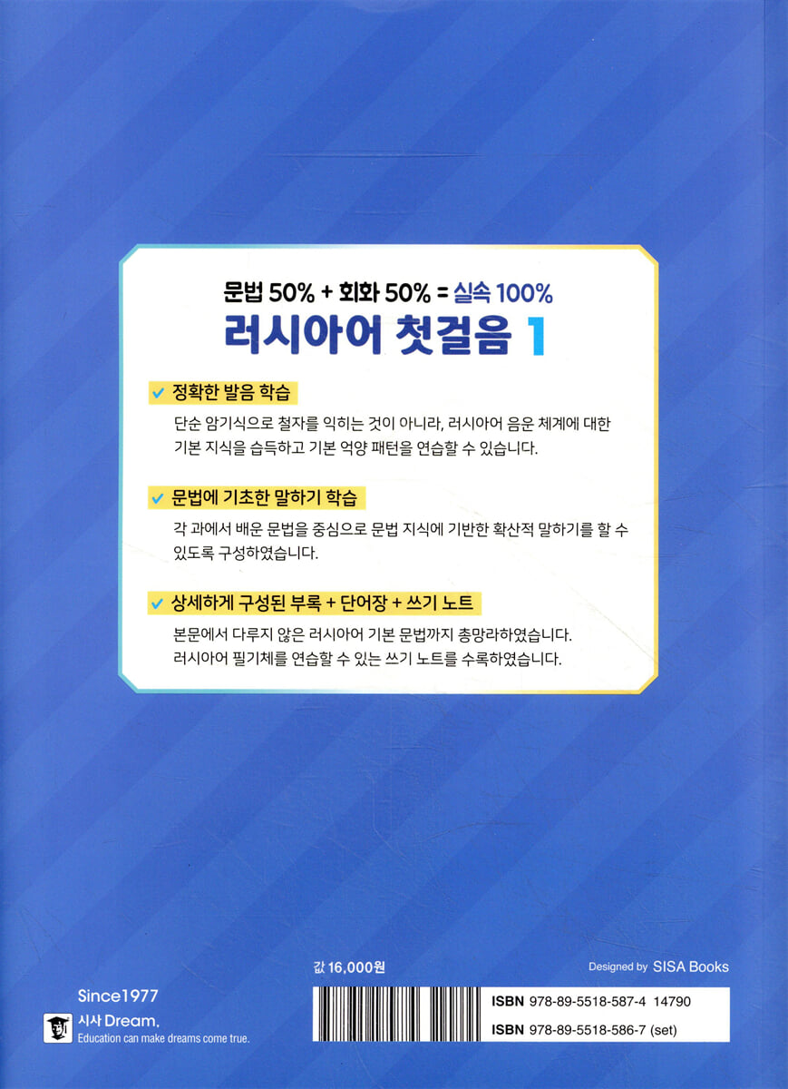 - 발음편 : ‘발음편’을 통해 러시아어 철자를 익히고 러시아어 음운 체계에 대한 기본 지식을 습득할 뿐만 아니라 기본 억양 패턴도 익힐 수 있습니다. - 문법과 회화 : 기초 단계 학습자들의 수준에 맞게 해당 단원에서 배울 문법 사항을 상세하게 설명하였습니다. 각 문법 내용을 설명한 다음 연습문제를 제시하여 학습자들이 연습문제를 풀어 보면서 해당 문법을 제대로 습득하였는지 바로 파악할 수 있습니다. - 음성 파일 : 회화문을 원어민의 음성으로 녹음된 mp3 파일로 들으면서 청취 실력을 기르고 유창하게 말하기 연습을 할 수 있습니다. * MP3 파일은 랭기지플러스 홈페이지(www.sisabooks.com)에서 다운로드할 수 있습니다. - 부록 제공 : 본문에서는 가장 중요하고 기본적인 정보들을 다루고, 그 외의 필요한 정보들은 상세하게 구성된 부록을 참고하면 학습에 큰 도움이 됩니다. - 쓰기 노트 : 러시아어 필기체 연습을 할 수 있는 쓰기 노트를 별책 부록으로 제공합니다. |