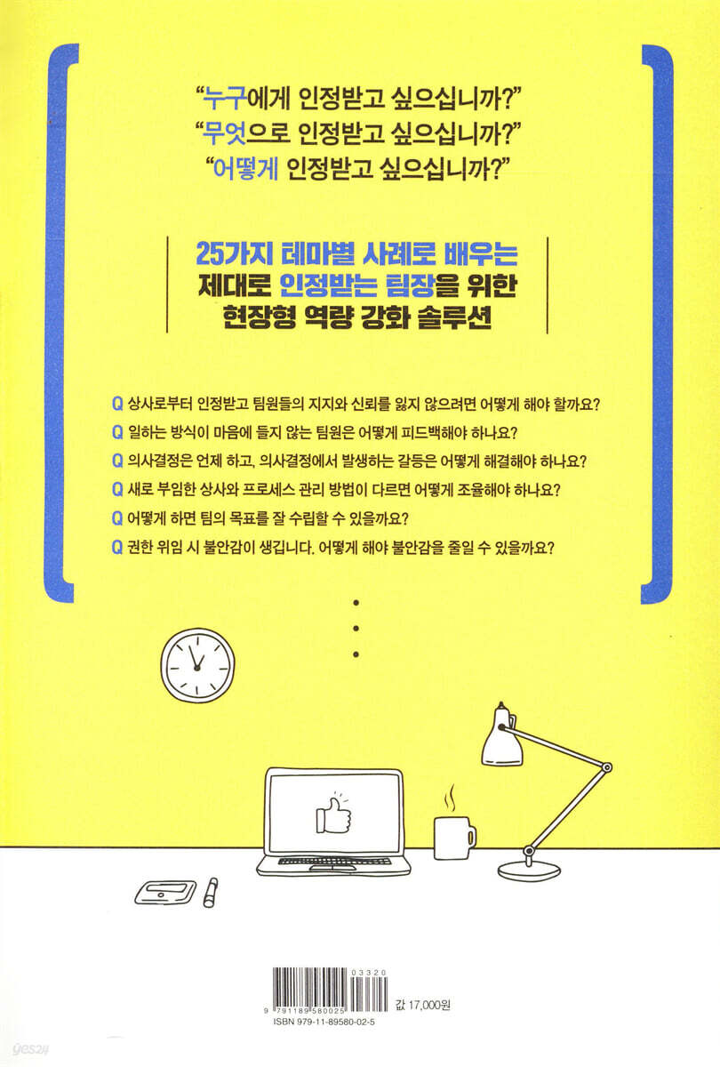 chapter 1 상사와 팀원들에게 모두 인정받는 팀장이 되는 비결 인정받기… 019 Q 상사로부터 인정받고 팀원들의 지지와 신뢰를 잃지 않으려면 어떻게 해야 할까요?… 022 A 이렇게 한번 해보면 어떨까요? chapter 2 지시와 잔소리가 아니라 성과를 내는 피드백의 조건 피드백… 029 Q 일하는 방식이 마음에 들지 않는 팀원은 어떻게 피드백해야 하나요?… 035 A 이렇게 한번 해보면 어떨까요? Q 제가 생각하는 것과 다른 방식으로 일하는 팀원에게 어떻게 피드백해야 하나요?… 038 A 이렇게 한번 해보면 어떨까요? chapter 3 업무의 생산성을 높이고 팀원을 성장하게 하는 힘 권한 위임… 045 Q 권한 위임 시 불안감이 생깁니다. 어떻게 해야 불안감을 줄일 수 있을까요?… 047 A 이렇게 한번 해보면 어떨까요? chapter 4 평범한 팀원들을 비범한 성과로 이끄는 팀장의 비결 팀워크 구축… 055 Q 자기주장만 하고 남을 배려하지 않는 팀원 때문에 팀워크에 문제가 생길 때는 어떻게 해야 하나요?… 057 A 이렇게 한번 해보면 어떨까요? Q 바쁜 상황인데도 자기의 일이 아니라고 모른 척하는 팀원을 어떻게 관리해야 할까요?… 060 A 이렇게 한번 해보면 어떨까요? chapter 5 성과를 내기 위해 ‘무엇을, 왜 하는지’ 관리하는 도구 목표 설정 및 목표 관리… 065 Q 팀의 목표를 수립하는 데 고민하고 있습니다. 어떻게 하면 팀의 목표를 잘 세울 수 있을까 요?… 067 A 이렇게 한번 해보면 어떨까요? Q 수동적인 팀원들에게 팀 목표를 어떻게 제시해야 할까요?… 070 A 이렇게 한번 해보면 어떨까요? chapter 6 성과를 최대화하기 위해 일을 효율성 있게 배분하는 법 업무 배분… 077 Q 쉬운 업무만 선호하는 팀원들에게 어떻게 업무를 배분해야 하나요?… 081 A 이렇게 한번 해보면 어떨까요? Q 갓 입사한 팀원이 담당 업무를 바꾸어 달라고 하면 어떻게 해야 하나요?… 084 A 이렇게 한번 해보면 어떨까요? chapter 7 업무의 효율을 높이기 위한 솔루션, 프로세스 점검 방법 프로세스 관리… 089 Q 새로 부임한 상사와 프로세스 관리 방법이 다르면 어떻게 조율해야 하나요?… 092 A 이렇게 한번 해보면 어떨까요? chapter 8 공정한 인사를 위한 선행과제, 성과 평가 잘하는 법 성과 평가… 099 Q 제가 판단하기에는 정말 괜찮은 팀원인데 오해로 인해 저의 상사가 그 팀원을 부정적으로 평가하고 있습니다. 이럴 때 어떻게 해야 하나요?… 101 A 이렇게 한번 해보면 어떨까요? Q 성과는 좋은데 태도가 나쁜 팀원은 어떻게 리드해야 하나요?… 104 A 이렇게 한번 해보면 어떨까요? Q 팀장이 보기에 성과가 좋지 않은데, 스스로 그렇게 생각하지 않는 팀원과의 평가 면담은 어떻게 하나요?… 109 A 이렇게 한번 해보면 어떨까요? chapter 9 위대한 리더와 평범한 리더를 구분 짓는 핵심 역량 의사결정… 113 Q 의사결정은 언제 하는 게 효과적일까요?… 117 A 이렇게 한번 해보면 어떨까요? Q 의사결정에서 발생하는 갈등은 어떻게 해결해야 하나요?… 120 A 이렇게 한번 해보면 어떨까요? chapter 10 스스로 움직이는 팀원이 많은 최고의 조직을 만드는 법 업무 동기유발… 125 Q 수동적으로 일하는 팀원은 어떻게 해야 스스로 움직이게 할 수 있을까요?… 128 A 이렇게 한번 해보면 어떨까요? Q 동기유발을 위해 업무를 통한 개인의 성장을 어떻게 설득력 있게 제시할 수 있을까요?… 132 A 이렇게 한번 해보면 어떨까요? chapter 11 팀원들의 역량을 최대치로 끌어내는 서번트 리더십의 핵심 성장 지원… 139 Q 팀원이 바라는 목표와 조직이 원하는 목표가 다른 상황이라면 어떻게 대응해야 할까요?… 142 A 이렇게 한번 해보면 어떨까요? Q 의욕은 높지만 능력이 조금 부족한 팀원은 어떻게 지원하나요?… 146 A 이렇게 한번 해보면 어떨까요? chapter 12 팀원들에게 여유와 행복감을 주는 팀장이 되는 비결 정서 관리… 151 Q 프로젝트 진행 시 팀원들에게 화를 내지 않았다면 더 좋은 결과로 이어졌을까요? … 155 A 이렇게 한번 해보면 어떨까요? chapter 13 팀이라는 배를 이끌어 가기 위해 팀장이라는 선장이 가야 할 방향 방향 설정… 159 Q 어떻게 하면 외부 환경에 잘 흔들리지 않는 미래 비전을 수립할 수 있을까요?…162 A 이렇게 한번 해보면 어떨까요? chapter 14 조직의 미래를 위해 과거의 성공에 머무르지 않는 법 변화 관리… 169 Q 변화를 이끌어가려고 하는데 다양한 방식으로 팀원들이 저항합니다. 어떻게 대처하면 좋을까요?… 171 A 이렇게 한번 해보면 어떨까요? chapter 15 유기체인 조직의 업무 효율을 최대치로 끌어올리는 조직 만들기 조직 설계… 177 Q 인력 효율화 방안으로 팀 내 조직을 재설계해야 합니다. 어떻게 해야 할까요?… 179 A 이렇게 한번 해보면 어떨까요? Q 팀 내 참 다른 스타일의 파트(워킹그룹), 팀원 재배치로 하나의 스타일을 만들 수 있을까요?…183 A 이렇게 한번 해보면 어떨까요? chapter 16 필요한 인재를 적절하게 배치하고 효과적으로 퇴직을 지원하는 기술 인력 확보 및 퇴직 관리… 189 Q 다른 부서 팀원을 우리 팀으로 영입하고 싶다면 어떻게 하면 되나요?… 192 A 이렇게 한번 해보면 어떨까요? Q 정말 팀에서 중요한 역할을 하고 있는 팀원이 오늘 퇴직하겠다고 면담을 요청했습니다. 어떻게 설득해야 할까요?