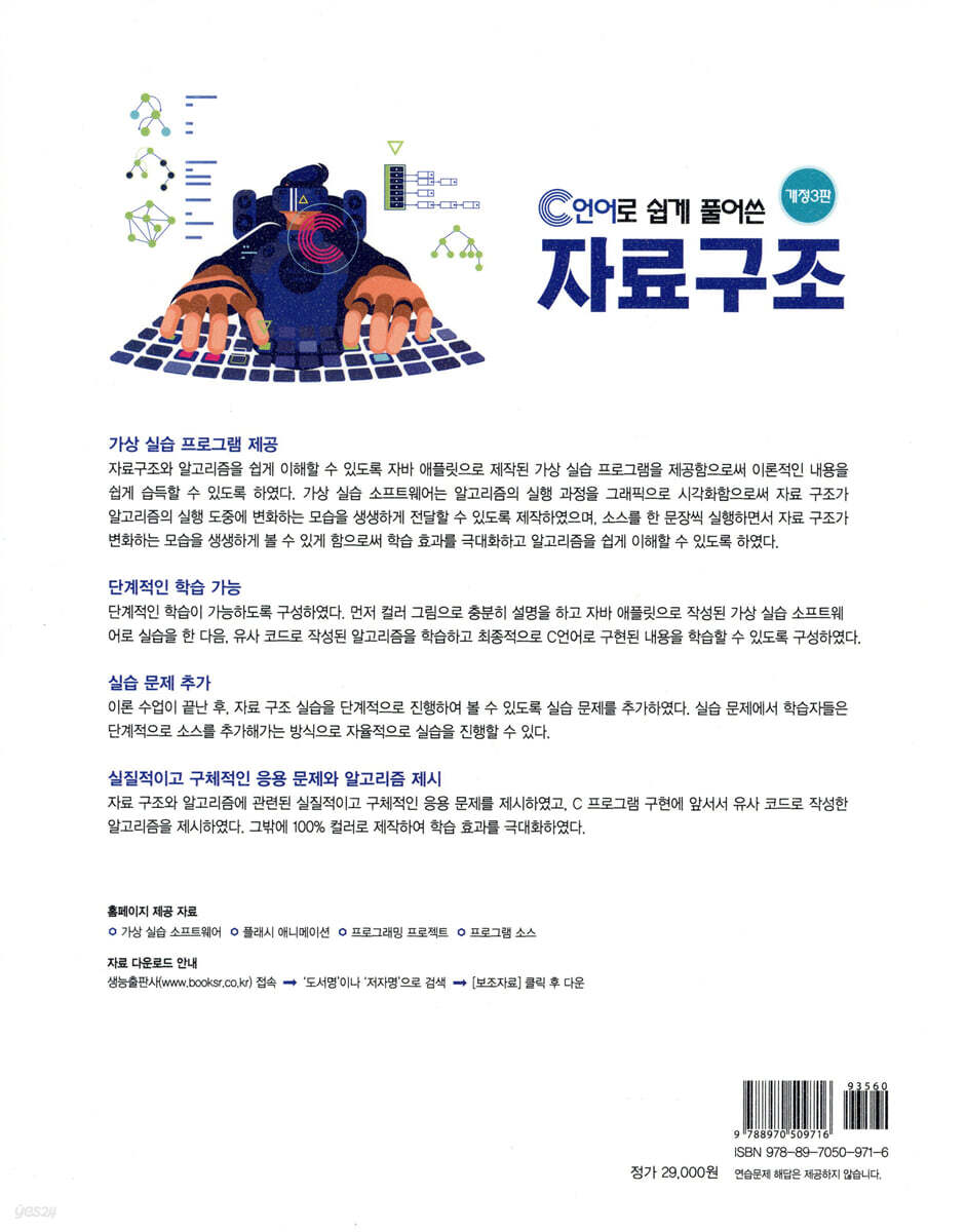 1.1 자료구조와 알고리즘 1.2 추상 자료형 1.3 알고리즘의 성능 분석 ■연습문제 Chapter 02 순환 2.1 순환의 소개 2.2 거듭제곱값 계산 2.3 피보나치 수열의 계산 2.4 하노이탑 문제 ■연습문제 Chapter 03 배열, 구조체, 포인터 3.1 배열 3.2 구조체 3.3 배열의 응용: 다항식 3.4 배열의 응용: 희소행렬 3.5 포인터 3.6 동적 메모리 할당 ■연습문제 Chapter 04 스택 4.1 스택이란? 4.2 스택의 구현 4.3 동적 배열 스택 4.4 스택의 응용: 괄호 검사 문제 4.5 스택의 응용: 후위 표기 수식의 계산 4.6 스택의 응용: 미로 문제 ■연습문제 Chapter 05 큐 5.1 큐 추상 데이터 타입 5.2 선형큐 5.3 원형큐 5.4 큐의 응용: 버퍼 5.5 덱이란? 5.6 큐의 응용: 시뮬레이션 ■연습문제 Chapter 06 연결 리스트 I 6.1 리스트 추상 데이터 타입 6.2 배열로 구현된 리스트 6.3 연결 리스트 6.4 단순 연결 리스트 6.5 단순 연결 리스트의 연산 구현 6.6 연결 리스트의 응용: 다항식 ■연습문제 Chapter 07 연결 리스트 II 7.1 원형 연결 리스트 7.2 원형 연결 리스트는 어디에 사용될까? 7.3 이중 연결 리스트 7.4 예제: mp3 재생 프로그램 만들기 7.5 연결 리스트로 구현한 스택 7.5 연결 리스트로 구현한 큐 ■연습문제 Chapter 08 트리 8.1 트리의 개념 8.2 이진 트리 소개 8.3 이진 트리의 표현 8.4 이진 트리의 순회 8.5 반복적 순회 8.6 레벨 순회 8.7 트리의 응용: 수식 트리 처리 8.8 트리의 응용: 디렉토리 용량 계산 8.9 이진 트리의 추가 연산 8.10 스레드 이진 트리 8.11 이진 탐색 트리 8.12 이진 탐색 트리의 응용: 영어 사전 ■연습문제 Chapter 09 우선순위 큐 9.1 우선순위 큐 추상 데이터 타입 9.2 우선순위 큐의 구현 방법 9.3 히프 9.4 히프의 구현 9.5 히프 정렬 9.6 머쉰 스케줄링 9.7 허프만 코드 ■연습문제 Chapter 10 그래프 I 10.1 그래프란? 10.2 그래프의 정의와 용어 10.3 그래프의 표현 방법 10.4 그래프의 탐색 10.5 깊이 우선 탐색 10.6 너비 우선 탐색 ■연습문제 Chapter 11 그래프 II 11.1 최소 비용 신장 트리 11.2 Kruskal의 MST 알고리즘 11.3 Prim의 MST 알고리즘 11.4 최단 경로 11.5 Dijkstra의 최단 경로 알고리즘 11.6 Floyd의 최단 경로 알고리즘 11.7 위상 정렬 ■연습문제 Chapter 12 정렬 12.1 정렬이란? 12.2 선택 정렬 12.3 삽입 정렬 12.4 버블 정렬 12.5 쉘 정렬 12.6 합병 정렬 12.7 퀵 정렬 12.8 히프 정렬 12.9 기 수정렬 12.10 정렬 알고리즘의 비교 12.11 정렬의 응용: 영어 사전을 위한 정렬 ■연습문제 Chapter 13 탐색 13.1 탐색이란? 13.2 정렬되지 않은 배열에서의 탐색 13.3 정렬된 배열에서의 탐색 13.4 이진 탐색 트리 13.5 AVL트리 13.6 2-3 트리 13.7 2-3-4 트리 ■연습문제 Chapter 14 해싱 14.1 해싱이란? 14.2 추상 자료형 사전 14.3 해싱의 구조 14.4 해시함수 14.5 개방 주소법 14.6 체이닝 14.7 해싱의 성능 분석 14.8 해싱의 응용 분야 ■연습문제 ■찾아보기 |