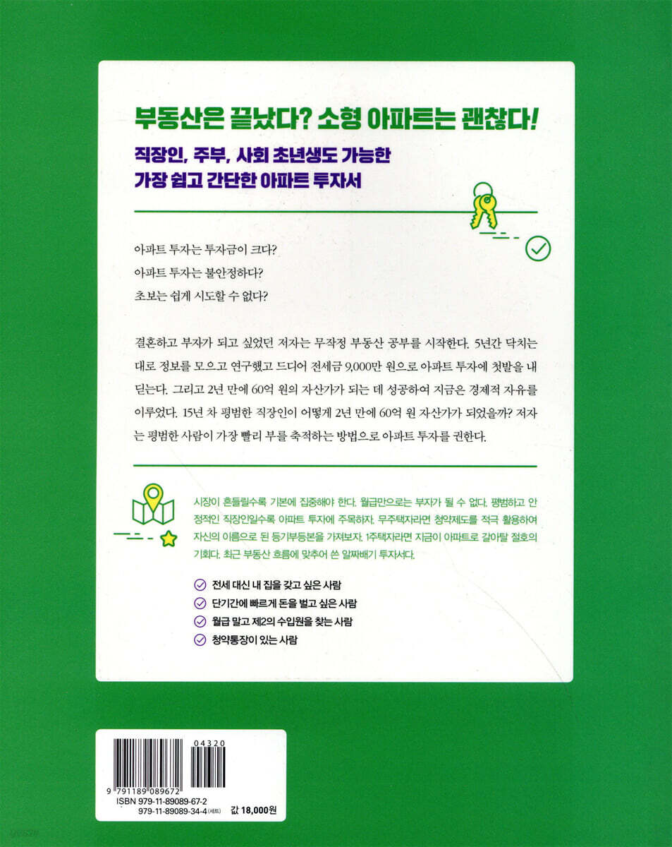 적은 돈으로 투자하고자 한다면 쉽게 떠올릴 수 있는 것이 빌라나 오피스텔이다. 그리고 빌라나 오피스텔에 투자해서 모은 자금으로 아파트나 상가에 투자한다. 부동산 초보자는 이런 순서를 투자의 정석이라고 생각한다. 하지만 절대 그렇지 않다. 초보자에게는 무엇보다 자산을 불리는 속도와 안정성이 중요하다. 얼마나 빠른 속도로, 리스크를 최소화하며 부를 이루는가 하는 것이다. 부동산 투자에는 순서가 중요하지 않다는 뜻이다. --- p.25 평범한 직장인이나 신혼부부, 무주택자들이 처음부터 대형 아파트를 매매하기는 어렵다. 하지만 소형 아파트라면 꿈이 아니다. 얼마든지 가능하다. 소형 아파트란 전용면적 60제곱미터(㎡) 이하의 아파트를 말한다. 보통 24평이라고 생각하면 된다. 청년 세대와 노년 세대 등 1인 가구가 증가하고 있다. 청년 세대의 결혼과 출산이 늦어지는가 하면 결혼했지만 아이를 낳지 않고 사는 딩크족, 현재를 즐기자는 욜로족이 늘어나고 있다. 여기에 맞물려 아파트 가격 상승과 자금 부족 등으로 주택 구입 시기가 늦어지면서 소형 아파트를 선호하는 경향이 강해졌다. --- p.30 종잣돈 1억 원을 모은다고 가정해 보자. 한 달에 100만 원씩 저축하면 9년이 걸린다. 200만 원씩 200개월(16년 이상)을 저축해야 4억 원을 모을 수 있다. 물론 저축 금액을 늘리면 기간을 단축할 수 있지만 쉽지 않다. 최근 1년 새 아파트값을 한번 확인해 보자. 강남을 제외하고도 서울의 신축 아파트는 최소 3억 원 이상, 강북의 구축 아파트도 1억 원 이상 올랐다. 절약과 저축만으로는 1년에 몇 억씩 오르는 부동산을 9년 후에 절대 살 수 없을 것이다. 저축 속도보다 아파트 가격이 훨씬 빨리 오르기 때문이다. --- p.45 서울이면 어디를 가든 1시간 내에 도착한다. 인터넷으로 얻는 정보와 지도는 평면으로 보는 것에 불과하다. 공부를 꾸준히 하는 것만큼 중요한 것이 현장에 직접 나가보는 임장이다. 역세권, 현장까지 거리감, 상권, 오르막 여부, 지역의 환경, 실거주자의 분위기를 느껴보는 것, 그리고 해당 지역에서 오래 부동산을 운영해 온 사람에게 듣는 내용은 돈 주고도 살 수 없는 것들이다. --- p.80 이미 지어진 아파트는 전액을 한꺼번에 지불해야 한다는 생각에 부담스럽기만 하다. 하지만 100퍼센트 내 돈을 지불하고 부동산을 사는 경우는 거의 없다. 1억 원짜리 집을 살 경우 1억 원을 전액 지불하지 않고 내 투자금을 최소화하는 것을 레버리지효과라고 한다. 즉, 타인의 자본을 지렛대 삼아 자기자본이익률을 높이는 것이다. 지렛대를 이용하면 같은 무게를 들더라도 내 힘이 훨씬 적게 들어가는 것과 같은 원리다. 부동산에서 ‘타인의 자본’이란 ‘은행 대출’이나 ‘임차인의 돈(전세보증금)’을 말한다. --- p.130 |
