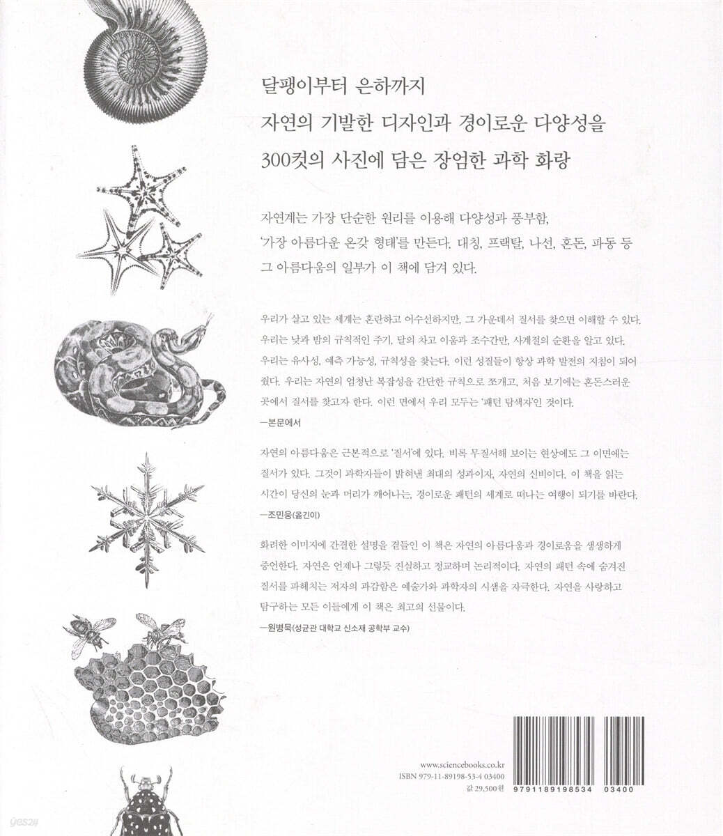 필립 볼은 이렇게 말한다. “자연은 심오한 디테일을 숨기고 있다. 다만 우리가 그것을 보지 못할 뿐이다. 그것은 구조가 없는 것처럼 보여도 그 뒤에는 패턴이 있다.”라고. -《월 스트리트 저널》 과학 애호가들의 눈을 즐겁게 할 자연의 예술 작품들이 큐레이션되어 있는 이 책은 우리 우주의 아름다움과 그것을 포착해 낼 수 있는 우리 자신의 능력에 대해 경탄할 수 있는 기회가 될 것이다. 올해 출간된 책 중 가장 아름다운 책이다! -《퍼블리셔스 위클리》 1장 대칭: 왼쪽과 오른쪽이 닮은 듯 다른 이유 도대체 패턴이란 무엇일까? 보통 우리는 그것을 계속해서 반복되는 어떤 것으로 생각한다. 대칭성의 수학은 이러한 반복이 어떤 모습인지 기술한다. 또한 왜 어떤 모양이 다른 모양보다 더 질서 있는지 이야기해 준다. 그렇기에 대칭성은 패턴과 형태를 설명하는 근본적인 과학 ‘언어’인 것이다. 대칭성은 사물이 거울에 반사되거나 회전하거나 이동할 때 어떻게 변하는지를 설명한다. 하지만 대칭성에 대한 우리의 직관은 기만적일 수 있다. 일반적으로 자연의 모양과 형태는 대칭성이 생겨서가 아니라 완벽한 대칭성이 깨져서 출현한다. 모든 것이 어디서나 똑같고 완벽하고 지루한 균일성이 붕괴되는 것이다. 따라서 이것은 중요한 질문이다. 모든 것이 균일하지 않은 이유는 무엇인가? 대칭성은 왜, 어떻게 깨지는가? 2장 프랙탈: 산이 두더지가 파 놓은 흙 두둑처럼 보이는 이유 들쭉날쭉한 해안선을 척도(scale) 없이 들여다보고 있으면 그것이 1킬로미터에 걸쳐 길게 뻗어 있는 것인지, 아니면 10킬로미터, 100킬로미터를 뻗어 있는 것인지 알 수 없다. 이렇게 서로 다른 척도에서 구별할 수 없는 배열의 성질을 프랙탈(fractal)이라고 한다. 이것은 자연의 패턴이 가진 두드러진 특징 중 하나이다. 솜털 같은 구름의 가장자리, 나뭇가지 끝의 잔가지가 나무의 전체 모양을 모방하는 방식, 허파의 기관지에서 반복되는 수지상 구조를 생각해 보라. 사실 프랙탈은 자연의 구조라고도 불려 왔다. 자연에 존재하는 많은 프랙탈은 처음 볼 때는 무질서해 보인다. 나무나 산세는 정확한 대칭성은 없지 않은가. 그러나 프랙탈 성질이 패턴에 ‘숨겨진 논리’를 드러낸다. 다시 말해 척도가 줄어들어도 똑같은 일반적인 형태가 계층적으로 반복된다는 것이다. 이러한 논리를 만들어 내는 과정은 과연 무엇일까? 그리고 왜 이것이 생물계에 유용한 것일까? 3장 나선: 달팽이와 해바라기의 비밀 수학 자연의 도처에서 나선을 볼 수 있다. 앵무조개의 껍데기에서부터 소용돌이치는 기체, 나선 은하의 별들에 이르기까지. 그런데 그것들이 서로 공유하는 무언가가 있을까? 전체적으로 그렇다. 자연의 나선 대부분은 로그 나선이라 불리는 모양을 가진다. 이것은 프랙탈처럼 작은 부분이 큰 부분과 똑같아 보인다는 뜻이다. 그러한 형태로 자라는 앵무조개 껍데기는 점점 커지면서 똑같은 모양을 유지하게 된다. 이러한 나선은 의외의 장소에서도 나타날 수 있다. 해바라기 머리의 작은 꽃들의 원형 배열은 서로 반대 방향으로 도는 두 로그 나선 집합으로 이루어진다. 그리고 흐르는 유체의 나선형 소용돌이가 있는데, 배수구 아래로 사라지는 목욕물부터 지구와 목성의 폭풍까지 다양하다. 이것은 자연의 보편적인 디자인 중 하나이다. 4장 흐름과 혼돈: 숨은 질서를 찾아서 우주는 역동적이다. 항상 움직이고 있다. 기체와 먼지 구름이 휘돌아 뭉쳐 별들이 탄생한다. 물은 큰 고리를 그리고 소용돌이치면서 바다를 순환한다. 이것은 온도와 염도의 차이가 만드는 움직임이다. 대류 흐름이 공기를 휘저어서 구름과 제트 기류를 일으킨다. 강은 상류에서 하류로 흐르면서 가지를 쳐 나가는데 마치 우리 몸의 피가 지나가는 길과 비슷하다. 이처럼 많은 흐름이 난류이다. 즉 너무 빨라서 일정한 형태가 유지되지 못하거나 완전히 예측할 수 없는 흐름이다. 그렇지만 모든 질서가 사라지는 것은 아니다. 소용돌이와 같은 유체 흐름의 근본적인 형태는 커피 크림에서도 흔히 볼 수 있다. 정말로 컵 안의 폭풍이라고 할까? 어쨌든 우리 주변의 흐름이 보이는 패턴에는 신비로움과 장엄함이 있다. 5장 파동과 모래 언덕: 화학 시계가 지배하는 세계 실질적으로 자연의 모든 것은 파동이다. 빛과 소리는 파동이다. 바다와 대기는 진동을 전달하고, 맥박은 심장과 두뇌 활동을 빠르게 한다. 양자 물리학에서는 물질을 이루는 가장 작은 입자가 상황에 따라 마치 파동처럼 움직인다고 말한다. 파동은 공간뿐만 아우리가 살고 있는 세계는 혼란하고 어수선하지만, 그 가운데서 질서를 찾으면 이해할 수 있다. 우리는 낮과 밤의 규칙적인 주기, 달의 차고 이움과 조수간만, 사계절의 순환을 알고 있다. 우리는 유사성, 예측 가능성, 규칙성을 찾는다. 이런 성질들이 항상 과학 발전의 지침이 되어 줬다. 우리는 자연의 엄청난 복잡성을 간단한 규칙으로 쪼개고, 처음 보기에는 혼돈스러운 곳에서 질서를 찾고자 한다. 이런 면에서 우리 모두는 ‘패턴 탐색자’인 것이다. -본문에서니라 시간에 대한 패턴이기도 하다. 즉 그것은 주기적으로 오가는 일정한 펄