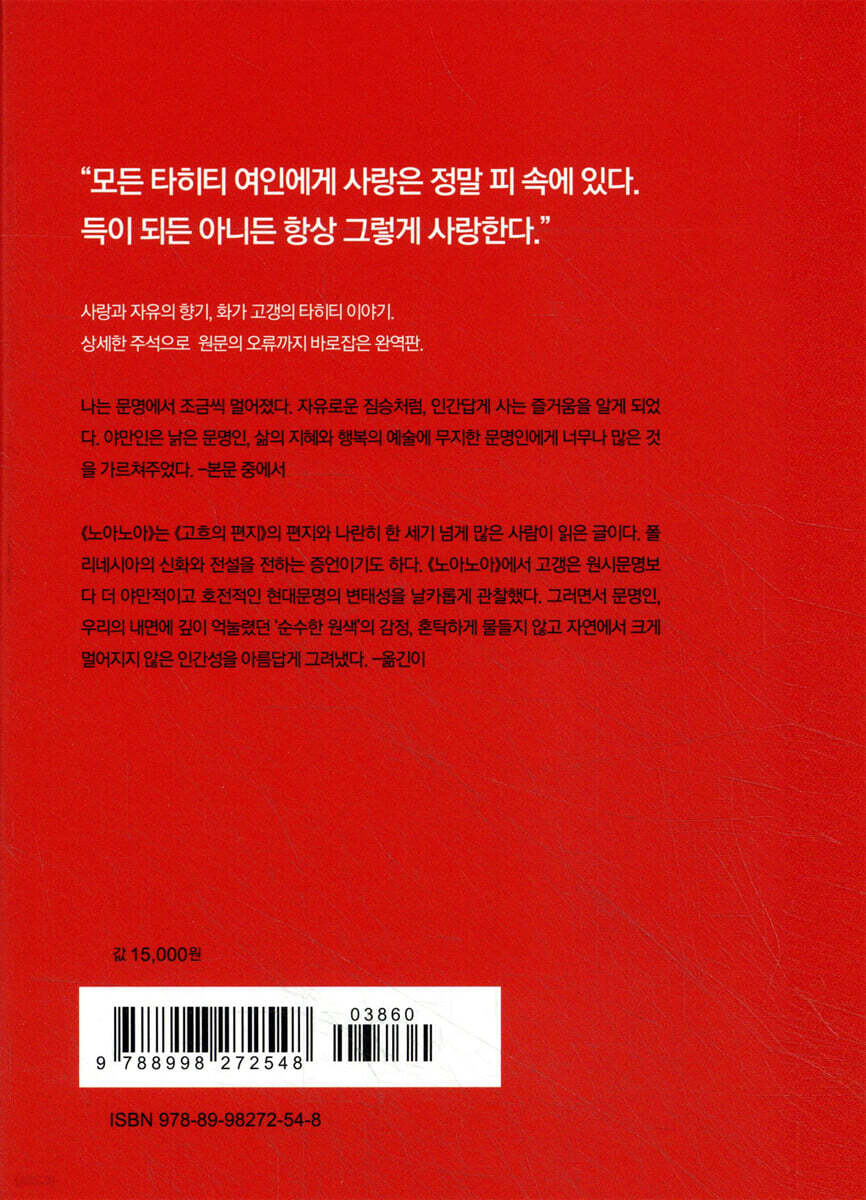 『노아노아, Noanoa』는 타히티어로 ‘향기로운’이라는 뜻이다. Noa Noa라고 띄어쓰는 경우도 있지만 타히티어로는 단일 낱말이다. 프랑스 화가 폴 고갱은 제도와 규범에 얽매인 도시문명을 비판하며 타히티의 정경과 원시의 자유를 강렬한 색으로 표현한 작품으로 인상주의 미술을 넘어서 현대미술의 새로운 지평을 열었다. 이 책 『노아노아』는 고갱의 타히티 체험을 바탕으로 쓴 사랑과 자유에 관한 이야기이다. 또한 문명과 원시성에 관한 날카로운 성찰을 담은 ‘문명비판’, 타히티의 ‘자연과 신화’, 관념과 제도의 구속을 벗어나는 ‘마음여행의 지도’, 순수한 원색 감정을 일깨우는 ‘야성’이 들어있다. 『노아노아』에서 고갱은 이렇게 말한다. “모든 타히티 여인에게 사랑은 정말 피 속에 있다. 득이 되든 아니든 항상 그렇게 사랑한다.” 타히티 여인들은 순백색 티아레(Tiare)꽃을 머리(귀)에 꽂는다. 향이 진한 티아레꽃처럼 고갱의 『노아노아』는 그 누구도 구속하지 않으며, 그 무엇에도 쫒기지 않는 자연의 순백색 향기를 전하는 책으로 이미 세계인의 고전이 되었다. 타히티에서 고갱은 삶의 새로운 가치를 발견한다. “밤이 찾아왔다. 침묵! 나는 비로소 적막한 타히티의 밤을 알았다. 내 가슴이 뛰는 소리만 들렸다. 하늘과 나 사이에는 도마뱀들이 살았던 가벼운 판다누스(Pandanus) 잎으로 덮은 큰 지붕뿐이다. 나는 잠결에 내 머리 위로 펼쳐진 자유로운 공간, 천상의 궁륭과 별들을 느꼈다. 유럽의 집들, 그 감옥으로부터 나는 이렇게 멀리 떨어졌다! 마오히(Maohi, 폴리네시아 원주민)의 오두막은 영원과 우주와 삶으로부터 누군가를 떼어놓거나 추방하지 않는다.” 나는 이렇게 문명에서 멀어졌다. 과거 고갱은 63일간의 긴 항해 끝에 타히티의 파페에테 항구에 처음 도착했다. 타히티에는 1790년대에 영국 선교사들이 들어와 기독교로 개종시키면서 문신, 노래, 춤 등 전통 문화와 신앙을 금지했다. 이후 제국주의 프랑스가 들어와 보호령으로 영토를 장악했고 1880년 마침내 프랑스 영토가 되었다. 현재 프랑스령 폴리네시아는 5개의 제도(총 118개의 섬)로 구성되어 있다. 해상 전체 면적은 유럽 대륙 전체 넓이에 버금간다. 소시에테 제도에는 보라보라, 타히티 등이 있는데 타히티가 가장 크고, 마르키즈 제도에서는 히바오아가 가장 큰 섬이다. 타히티의 파페에테가 전체의 행정수도이다. 이 책에서 고갱은 이렇게 말한다. “정복당한 그들은, 그들 민족이 간직하고 있는 것에 프랑스에서 들여온 허접하고 격이 떨어지는 군더더기를 채웠다. 제기랄! 문명의 승리였다. 군인과 장사꾼과 관료의 문명 말이다. 나는 옛날의 타히티를 사랑했다. 그런데 완전히 망가졌다고 생각하니 참기 어려웠다. 훌륭한 한 종족이 그 오랜 영광을 지키지 못했다고 말해야만 하다니!” 고갱은 수도인 파페에테를 떠나 원주민 마을의 오두막으로 향한다. 그곳에서 원주민들이 참모습을 보기 시작하면서 자신의 변화를 실감한다. “나는 문명에서 조금씩 멀어졌다. 그들을 사랑하게 되었다. 인간답게 사는 즐거움을 알게 되었다.” “나는 숱한 환상에 시든 영혼, 지나친 노력에 지친 몸, 사회의 악습에 찌들어서 도덕적으로도 육체적으로도 병든 사람이었다.” “이곳에서 20년은 젊어졌다. 도착했을 때보다 훨씬 야성이 넘치지만 더 많이 알게 되었다. 그렇다, 그들은 낡은 문명인, 삶의 지혜와 행복의 예술에 무지한 문명인에게 너무나 많은 것을 가르쳐주었다.” ‘못난 문명인’이었던 자신을 깨닫고 자유로운 야만인으로 거듭나는 과정을, 고갱은 흥미로운 사건들을 소설처럼 펼쳐낸다. 열대 자연의 빛나는 정취를 담은 그의 이야기는 문명과 야만에 대한 날카로운 화살로 변했다가 순식간에 사랑 이야기로 바뀌면서 문학적 긴장의 파도를 넘는다. 고갱과 원주민 여인 테우라와의 사랑 이야기는 티아레꽃 같은 사랑을 낙원에 꽃피웠다가 끝내 안타까운 이별의 노래를 남기며 스러진다. “테우라는 여러 날 밤을 울며 지새웠다. 이제 슬픔에 지쳐, 조용히 바위에 앉아 두 다리를 짠물에 담근 채였다. 발은 퉁퉁 부었다. 귀에 꽂았던 꽃은 무릎 위에 떨어져 시들었다.” 타히티 체류를 바탕으로 쓴 『노아노아』에는 타히티의 고대 종교와 신화까지 아우르는 흥미로운 이야기들도 담겨있다. 잠시 프랑스로 갔던 고갱은 다시 타히티로 돌아왔다. 타히티에서 거주하다가 남태평양 동쪽의 더 외딴 섬인 히바오아로 거처를 옮겼고, 유럽인들과는 어울리지 않은 채, 원주민 마을의 오두막에서 궁핍한 삶을 마감했다. 상세한 주석으로 타히티의 자연과 문화, 신화와 전설을 선명하게 되살린 책 『노아노아』에서 고갱은 문명과 야만, 타히티의 정경뿐 아니라 불교와 폴리네시아의 신화 등 그의 작품세계의 바탕이 되는 다양한 주제들을 풀어놓았다. 그래서 『노아노아』는 고갱의 예술과 언제나 함께 놓이는 문제적인 텍스트이다. 『노아노아』는 고갱이 품고 실천했던 생각과 미적 혁신을 대변하면서도 한편으로는 비판과 극복의 근거가 되기도 한다. 권력과 식민주의, 낭만주의적 환상, 유럽의 시각에서 상대화한 ‘야만’ 등에 