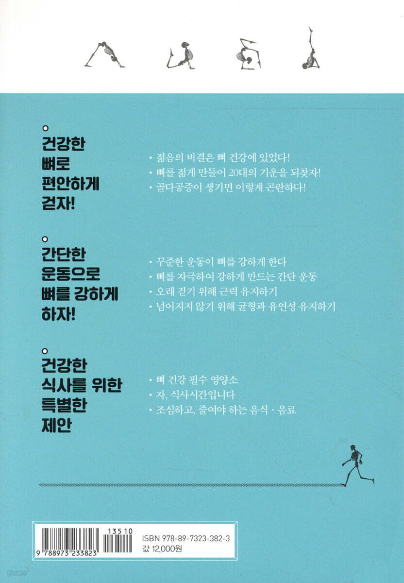 뼈 건강 간단 체크리스트|당신의 뼈는 괜찮습니까? PART 1 건강한 뼈로 편안하게 걷자! 젊음의 비결은 뼈 건강에 있었다! 곧은 체형과 건강한 신체는 뼈로 만들어진다 뼈가 젊으면 피부 탄력도 좋아지고 기억력도 젊어진다! 뼈를 젊게 만들어 20대의 기운을 되찾자! 뼈의 강도는 20대가 절정! 나이가 들어서도 뼈는 언제든지 젊어질 수 있다! 저축된 골량이 적은 사람은 젊더라도 주의해야 한다! 골다공증이 생기면 이렇게 곤란하다! 골다공증은 어떤 병인가? 등이 굽은 것은 척추가 부러졌기 때문일 수도 있다!? 살짝 넘어졌는데 부러졌다고? 뼈가 약해지면 기억력과 면역력도 나빠진다? 평소 생활 습관 때문에 이미 골다공증일 수도 있다! 식생활이나 기호품에서 주의해야 하는 것은? 언제까지나 뼈를 강하게 만드는 비법! Column 몇 분만 햇볕을 쬐면 충분한 비타민D를 얻는다? PART 2 간단한 운동으로 뼈를 강하게 하자! 꾸준한 운동이 뼈를 강하게 한다 1분이면 충분! 뼈를 자극하자 넘어지지 않도록 대비하자 많은 운동이 필요합니까? 뼈를 자극하여 강하게 만드는 간단 운동 뼈 트레이닝 1 발뒤꿈치 업다운 운동 뼈 트레이닝 2 워킹·조깅 뼈 트레이닝 3 줄넘기·점프 뼈 트레이닝 4 계단 내려가기 오래 걷기 위해 근력 유지하기 근력 트레이닝 1 하체 근육 트레이닝의 왕도, 스쿼트 근력 트레이닝 2 큰 보폭으로 앞으로 내딛기(프런트 런지) 근력 트레이닝 3 복부·등 근육 근력 트레이닝 4 의자에 앉아 무릎 뻗기 & 제자리걸음 넘어지지 않기 위해 균형과 유연성 유지하기 균형감각 트레이닝 외발로 서기, 일자로 걷기 유연성 트레이닝 걸려 넘어지지 않기 위한 하체 스트레칭 Column 40대부터 시작되는 ‘로코모티브 신드롬’을 아시나요? Column 마트에서 저렴하게 구매할 수 있는 트레이닝 보조 상품 PART 3 건강한 식사를 위한 특별한 제안 뼈 건강 필수 영양소 No.1 강한 뼈를 만드는 주재료 칼슘 No.2 칼슘의 흡수를 돕는 비타민D와 K No.3 뼈에는 단백질이 필요하다 자, 식사시간입니다 우유, 요구르트, 치즈 마셔도 좋고! 수프로 끓여도 좋고! 한 컵으로 하루 칼슘을 섭취할 수 있는 우유 멸치, 뱅어, 빙어 통째로 먹을 수 있는 작은 생선, 반찬이나 간식으로 먹으면 좋다 두부, 유부, 두부 완자 오래전부터 사랑받는 콩, 칼슘과 단백질이 풍부한 우등생 소송채, 무청 조금 생소하지만 뼈에 좋은 대표 채소 소송채 톳, 미역, 다시마, 김 식사 때마다 적은 양이라도 꾸준히 먹으면 좋은 해조류 고등어 통조림, 꽁치 통조림 뼈째 먹는 생선 통조림은 반찬으로 활약하는 만능 음식 재료 어육소시지, 게맛살 어육 가공품 중에는 칼슘이 강화된 식품도 있다 볶은 참깨, 깨소금, 참기름 한 번에 많이 먹지 못하지만 요리에 첨가하면GOOD 아몬드, 피스타치오 간식과 안주로 칼슘 견과류를 사용한 요리나 디저트 말린 새우, 볶은 새우 맛도 풍부, 칼슘도 풍부 그대로 먹어도, 천연 조미료로 사용해도 최고 우유, 과자, 시리얼 편의점, 마트 식품 판매대에서 파는 칼슘 강화식품 잎새버섯, 목이버섯, 표고버섯 버섯으로 비타민D 섭취, 볶거나 튀겨 먹으면GOOD 연어, 정어리, 꽁치, 전갱이 등푸른 생선으로 비타민D 섭취 연어, 꽁치를 밥과 함께 먹으면 GOOD 깻잎, 상추, 미나리 비타민K가 풍부한 낫토 낫토를 먹기 힘들면 깻잎, 상추, 미나리 등 녹색 채소로 대체 유제품, 콩가루, 말차, 흑설탕 칼슘과 비타민을 디저트로 콩가루와 말차는 뼈에 좋다! 기억합시다! 조심하고, 줄여야 하는 음식·음료 무엇보다도 적당한 것이 최고 |